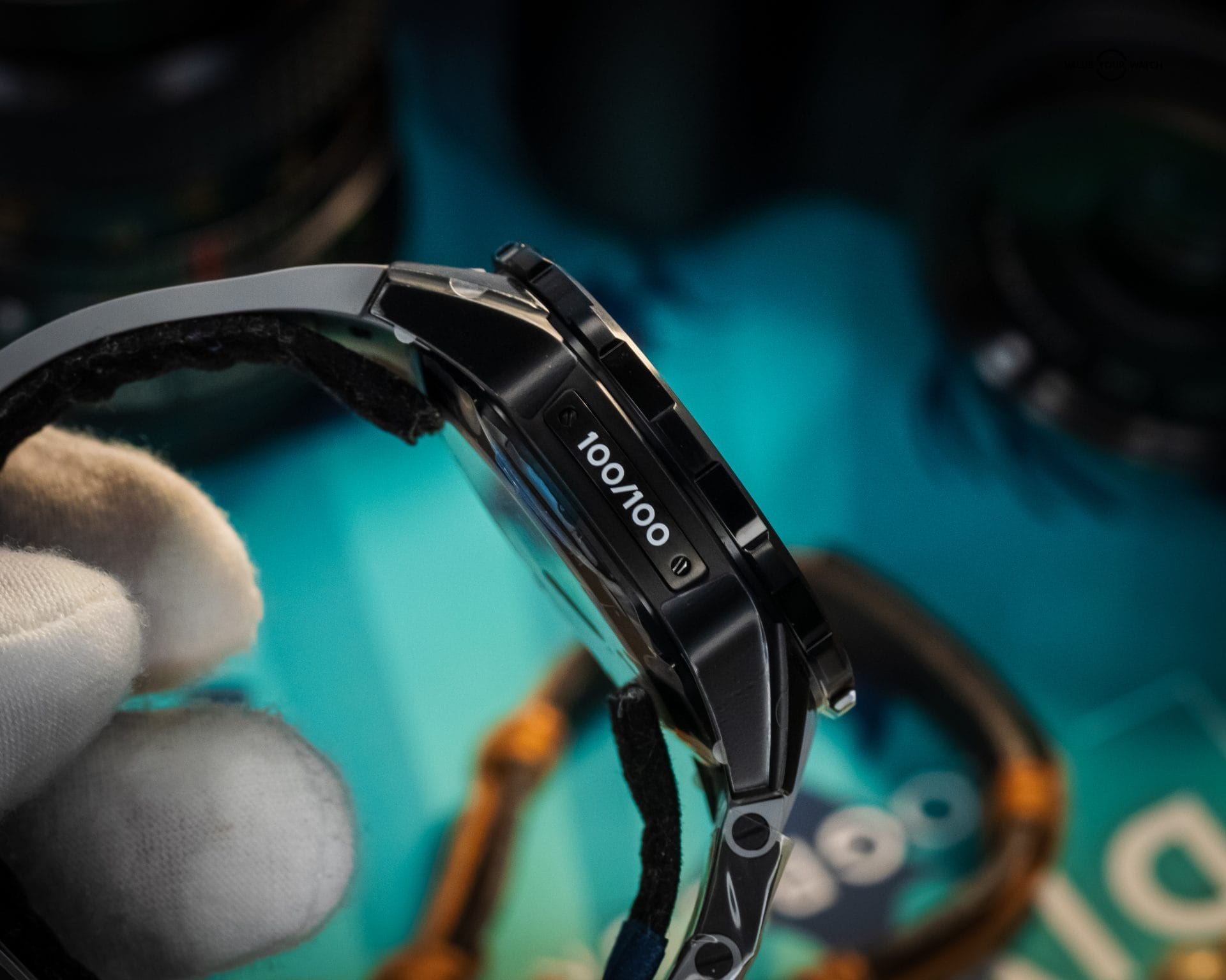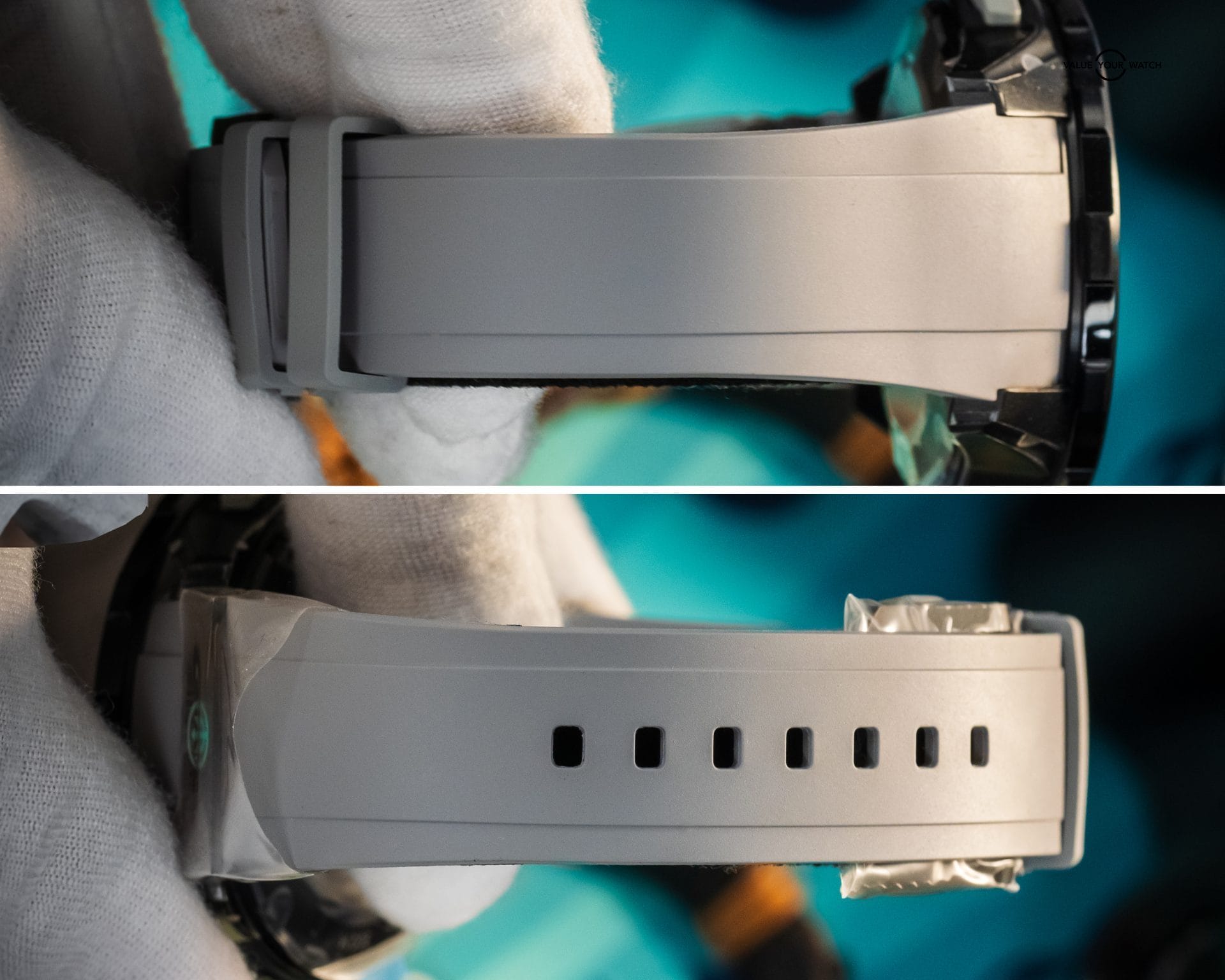 - Bracelet – Grey Rubber with turquoise lacquered OMW engraved logo.