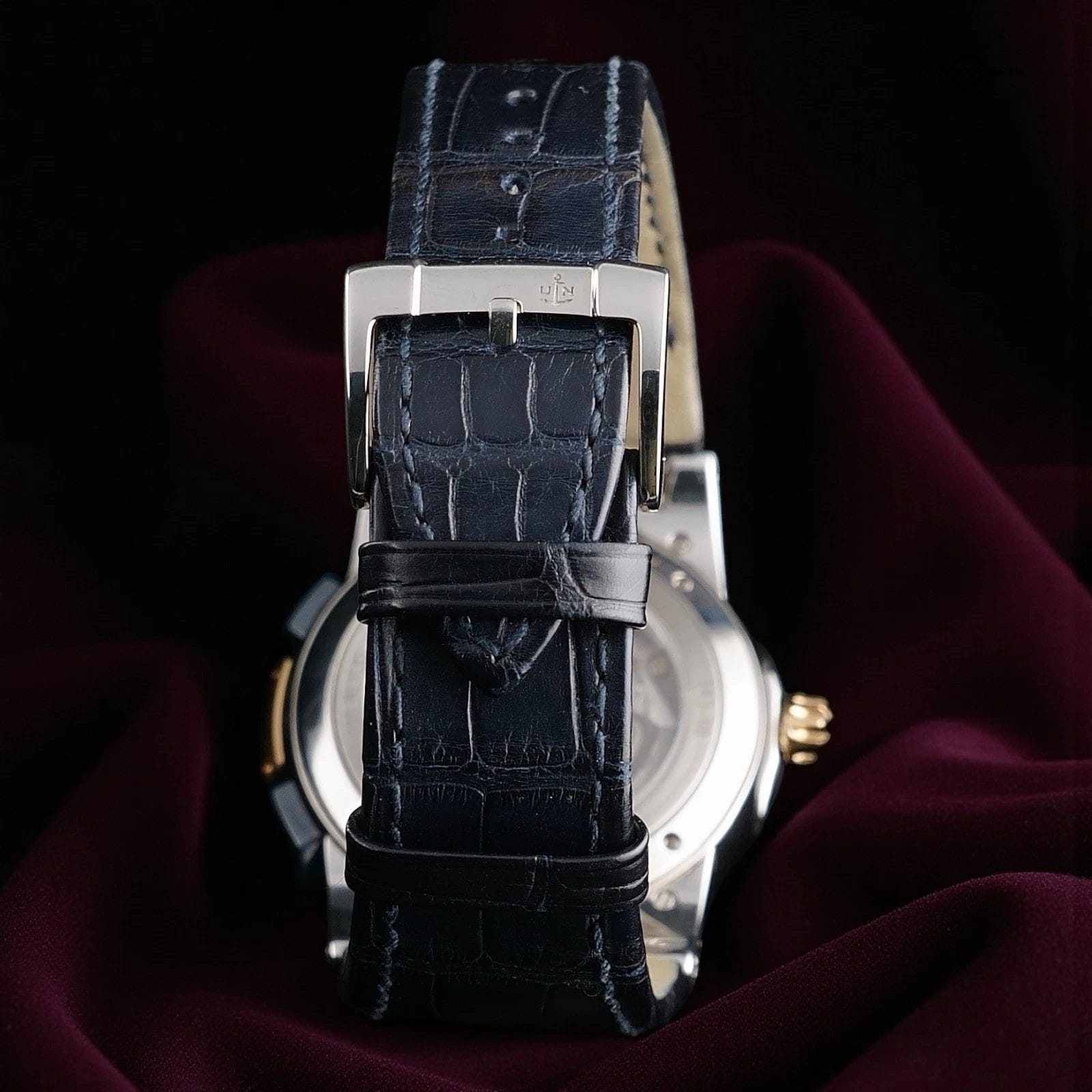 The inclusion of both the stainless steel Ulysse Nardin logo buckle and the gold tone buckle gives you flexibility in how you style the watch. Combined with the mahogany presentation box and full blue box set, it has the feel of a boutique curated piece rather than a loose watch with no history.