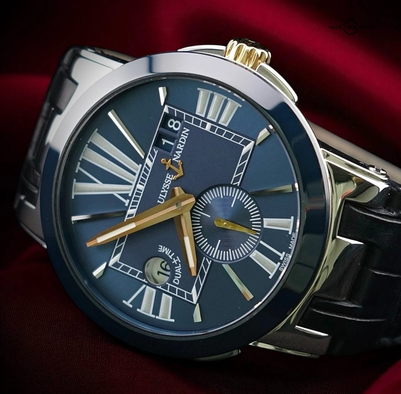 The Ulysse Nardin Executive Dual Time is one of the most versatile modern travel pieces in the UN lineup. It gives you instant push button local hour adjustment, a bold blue ceramic bezel, oversized big date, and a deep blue dial with gold tone accents that reads pure boutique luxury on the wrist.