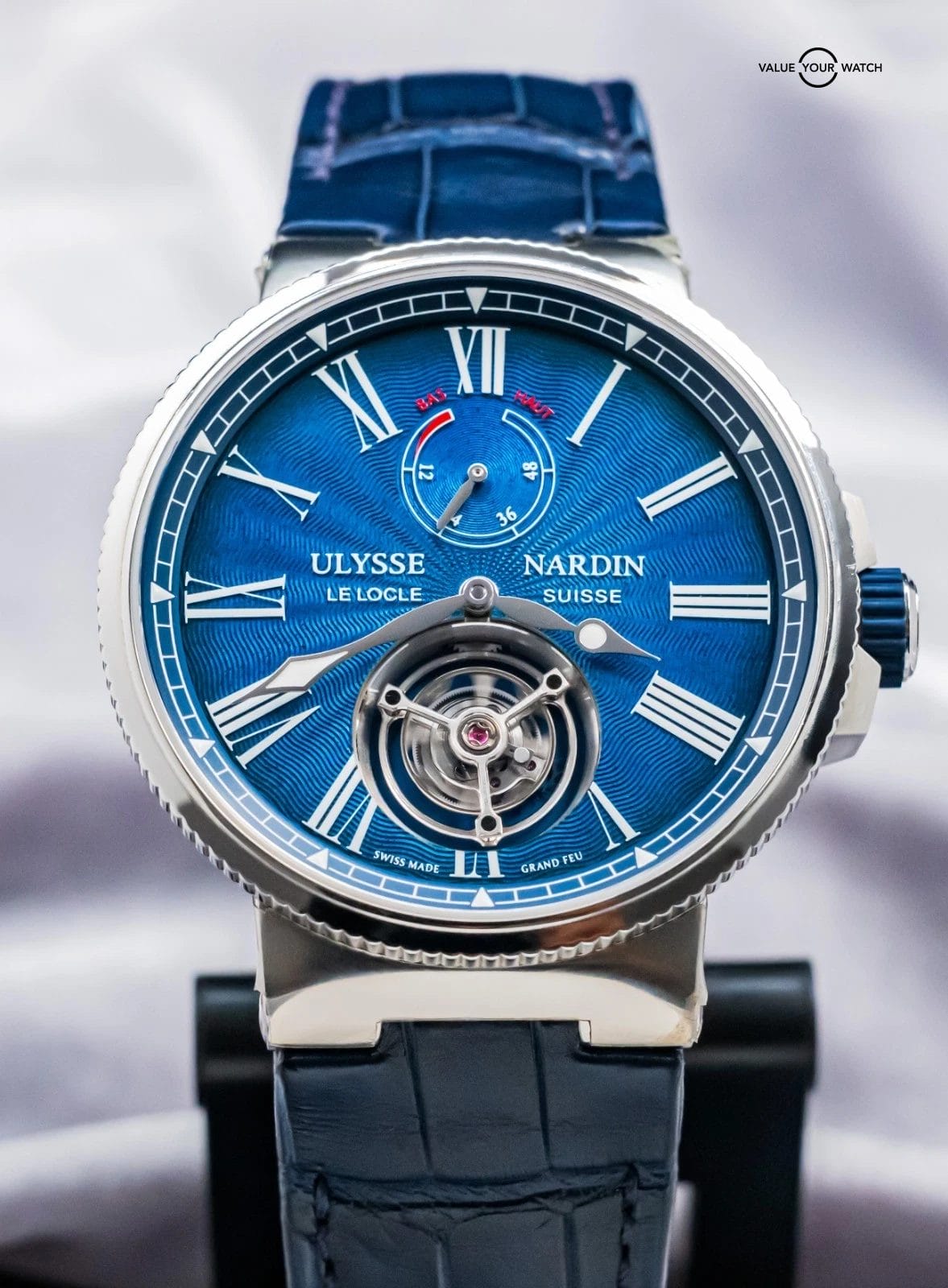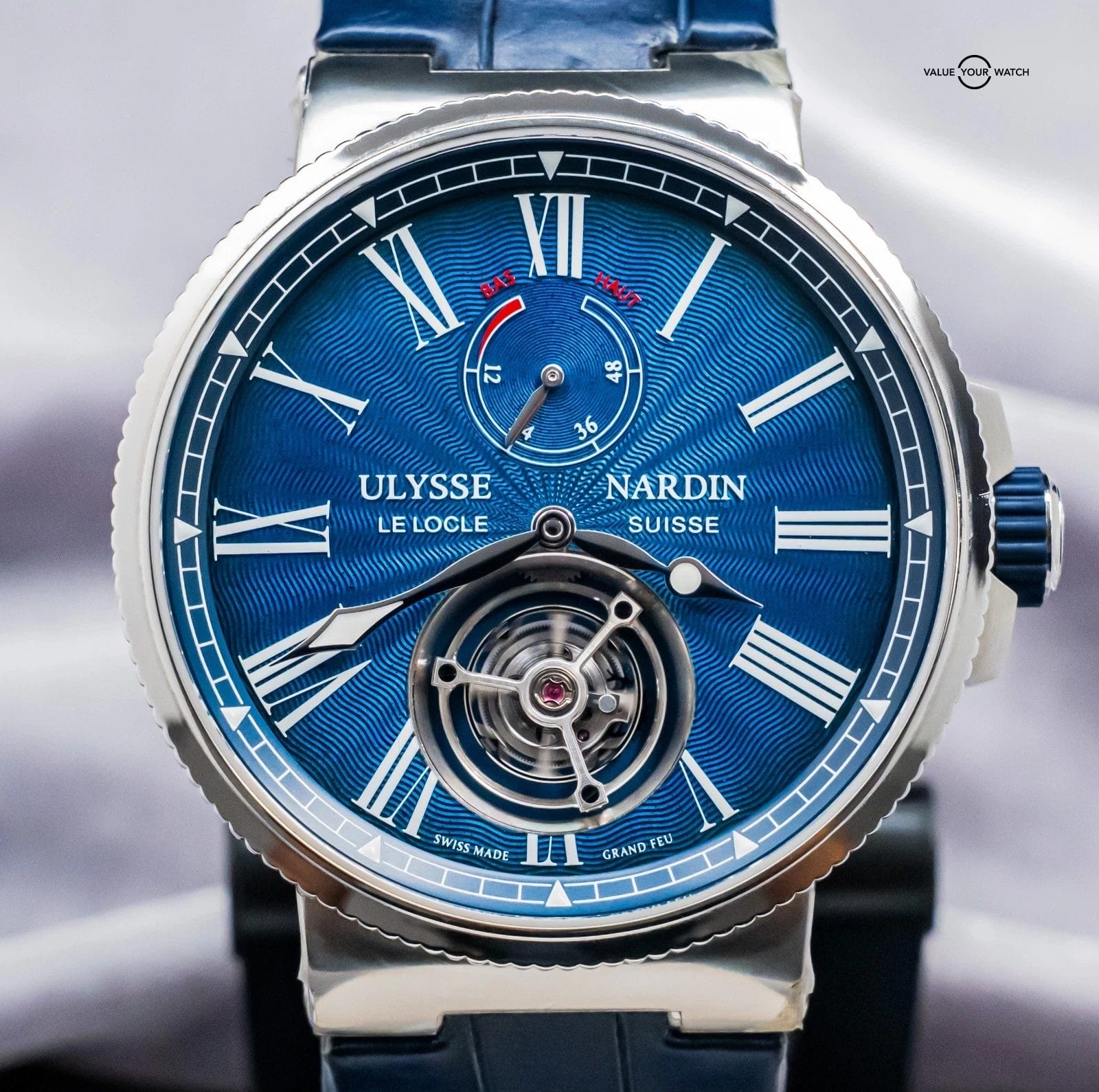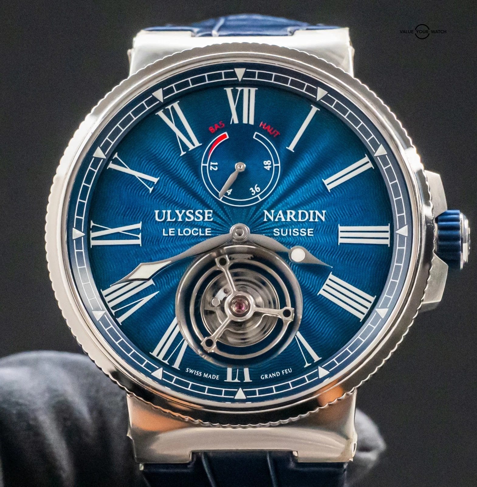 STUNNING Ulysse Nardin Marine Tourbillon 43 mm in Stainless Steel with Blue Flinque Enamel Dial on Blue Ulysse Nardin Alligator Leather & Deploy Clasp! Arrives with original Ulysse Nardin papers from the 2023 purchase at an Ulysse Nardin Authorized Dealer. This is one of the coolest Tourbillons on the secondary market within a $40K budget, and I must say that the dial is KILLER in person. In our nine years of business, we’d never had another in stock- take advantage of this rare opportunity!