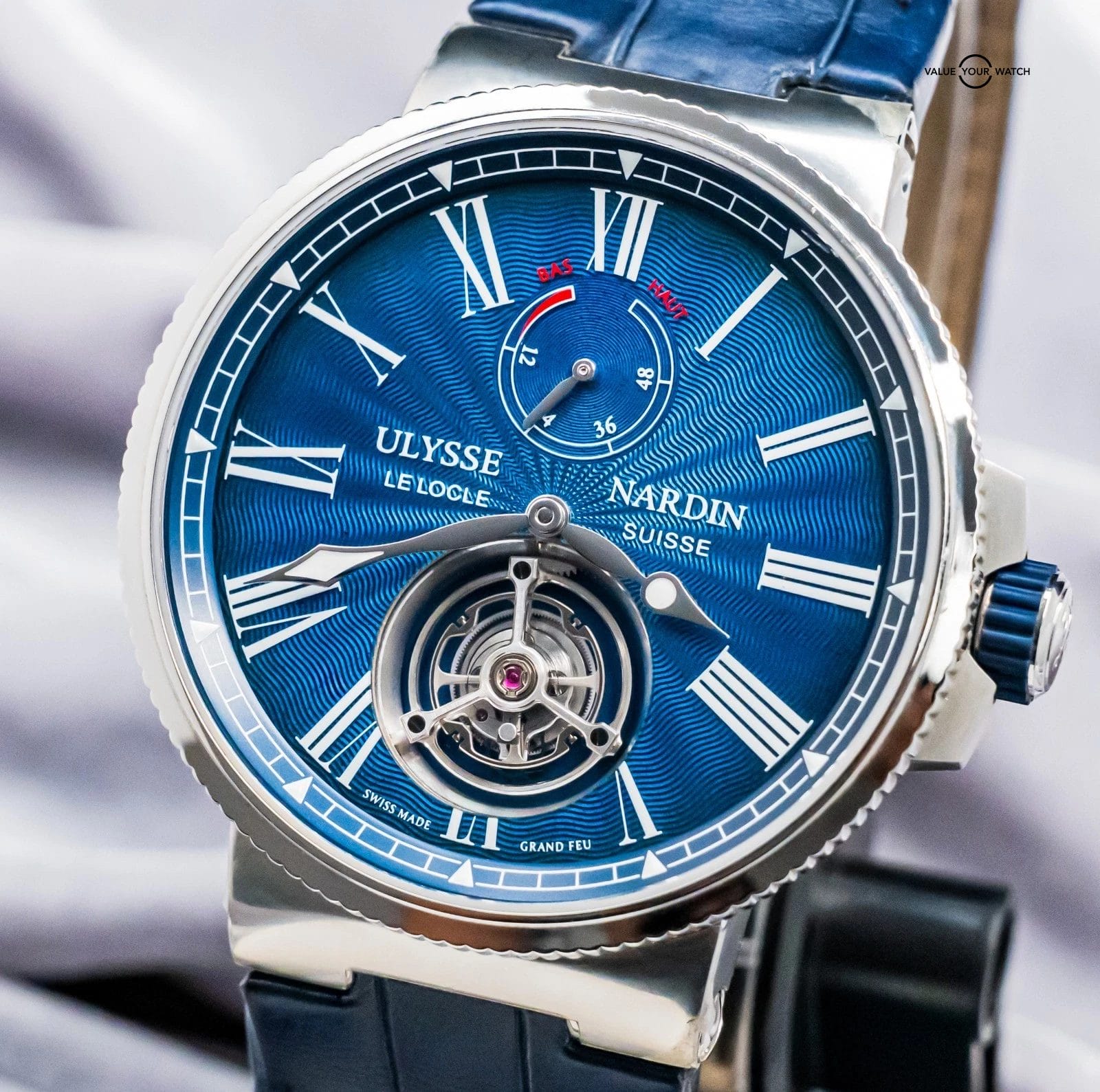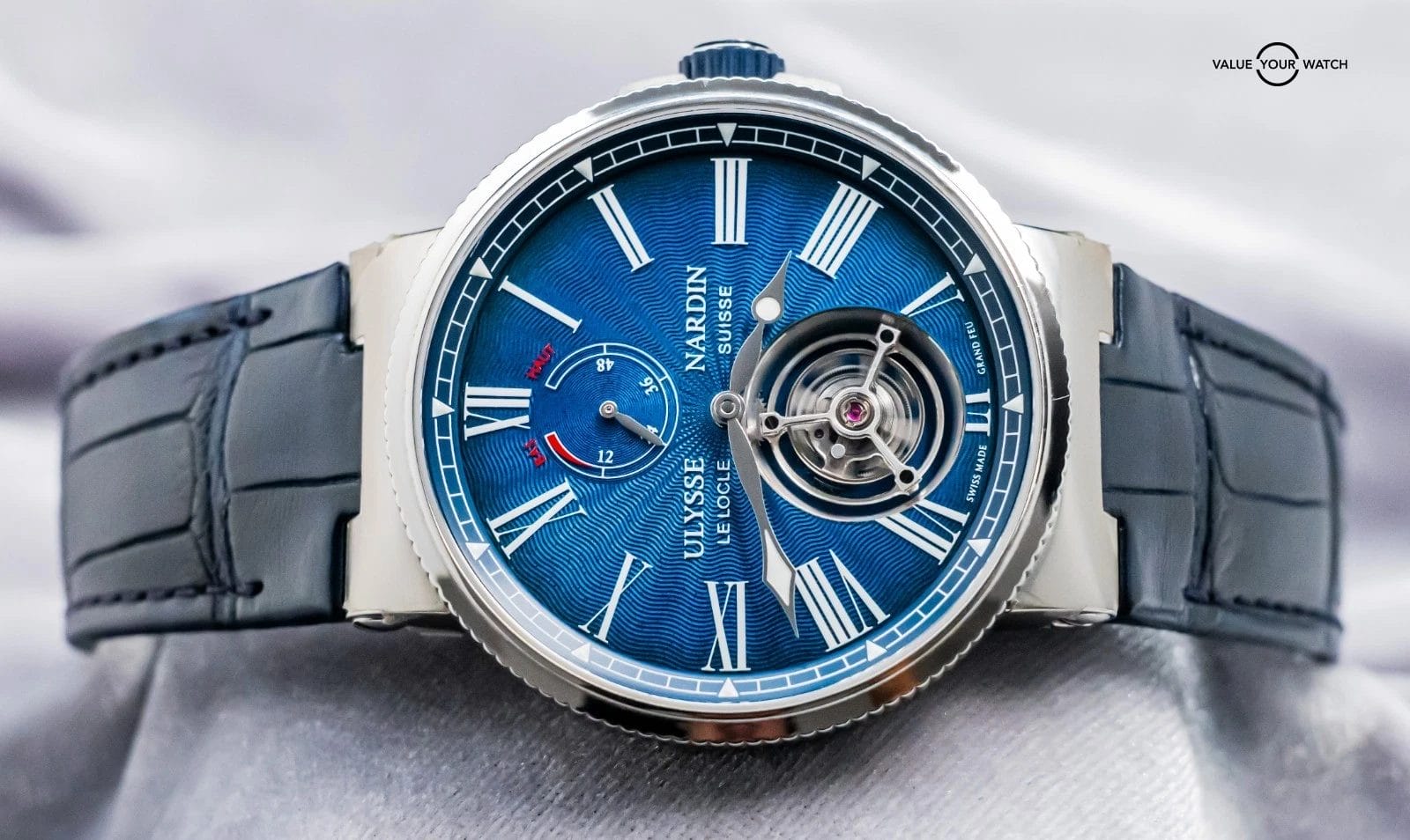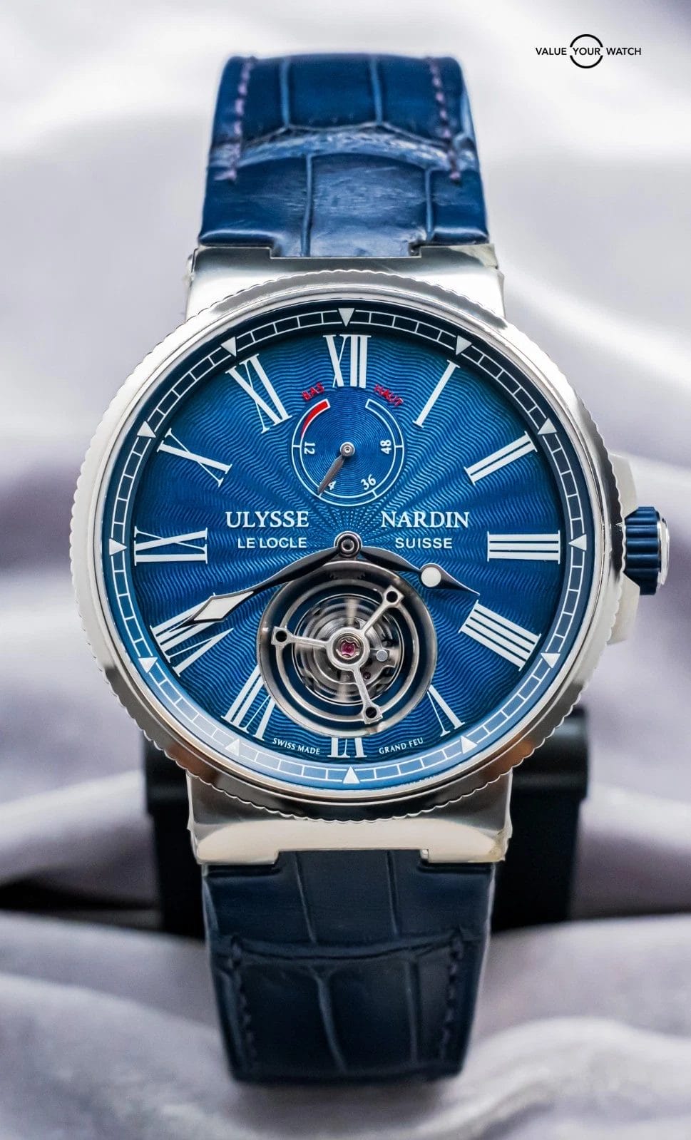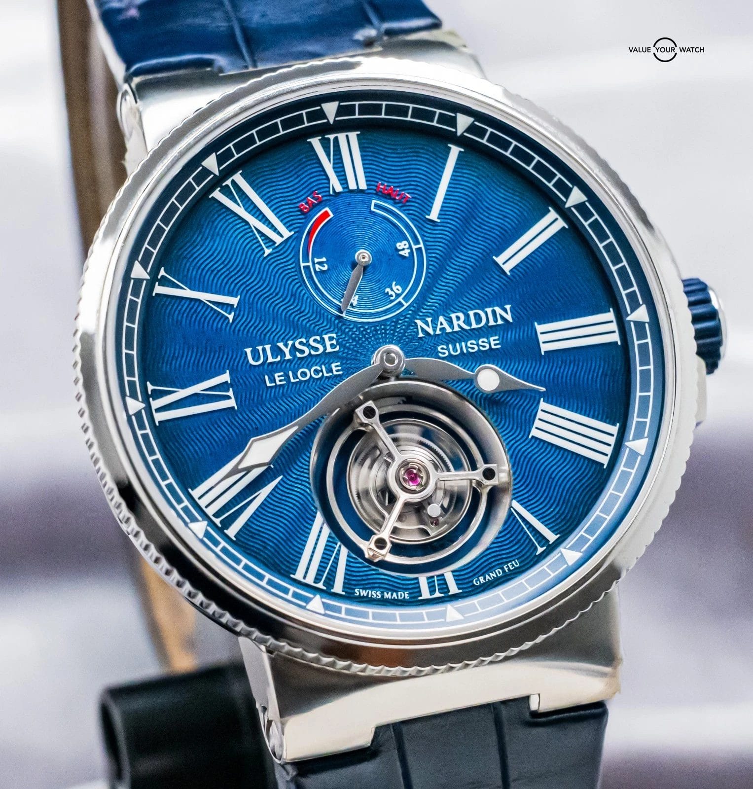 STUNNING Ulysse Nardin Marine Tourbillon 43 mm in Stainless Steel with Blue Flinque Enamel Dial on Blue Ulysse Nardin Alligator Leather & Deploy Clasp! Arrives with original Ulysse Nardin papers from the 2023 purchase at an Ulysse Nardin Authorized Dealer. This is one of the coolest Tourbillons on the secondary market within a $40K budget, and I must say that the dial is KILLER in person. In our nine years of business, we’d never had another in stock- take advantage of this rare opportunity!