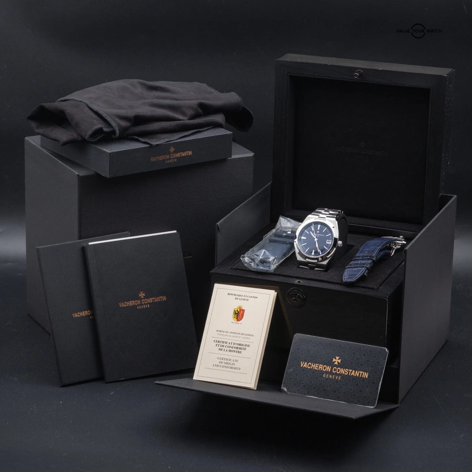 This piece comes as a full set. Warranty card is dated 2019. Watch is in very good condition with next to no signs of wear. Comes with the additional blue leather strap and blue rubber strap with the VC buckle as well (in addition to the stainless steel bracelet). The strap quick-change mechanism makes it easy to change the look up when needed.