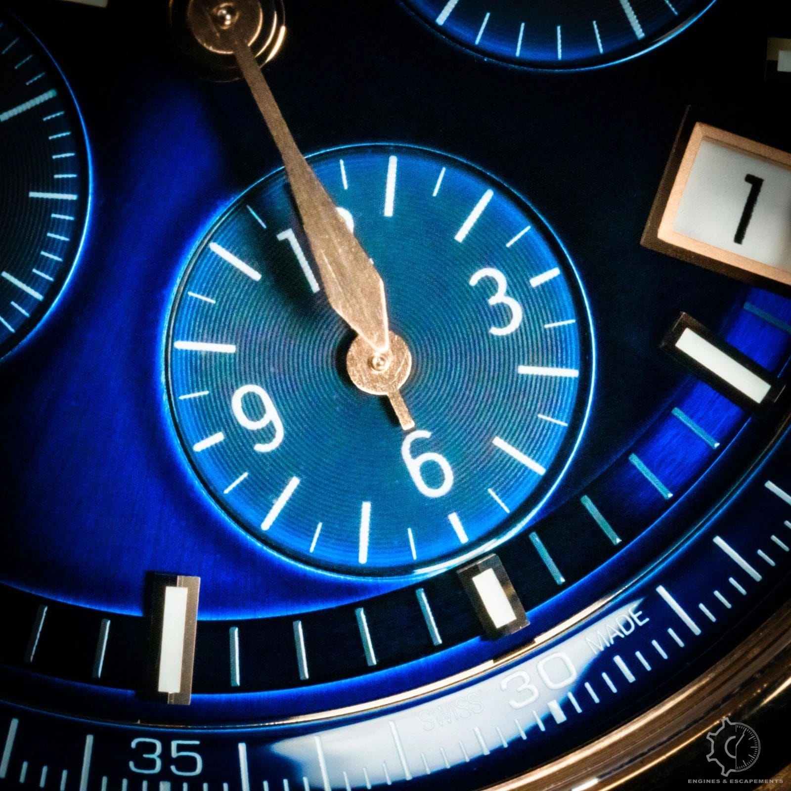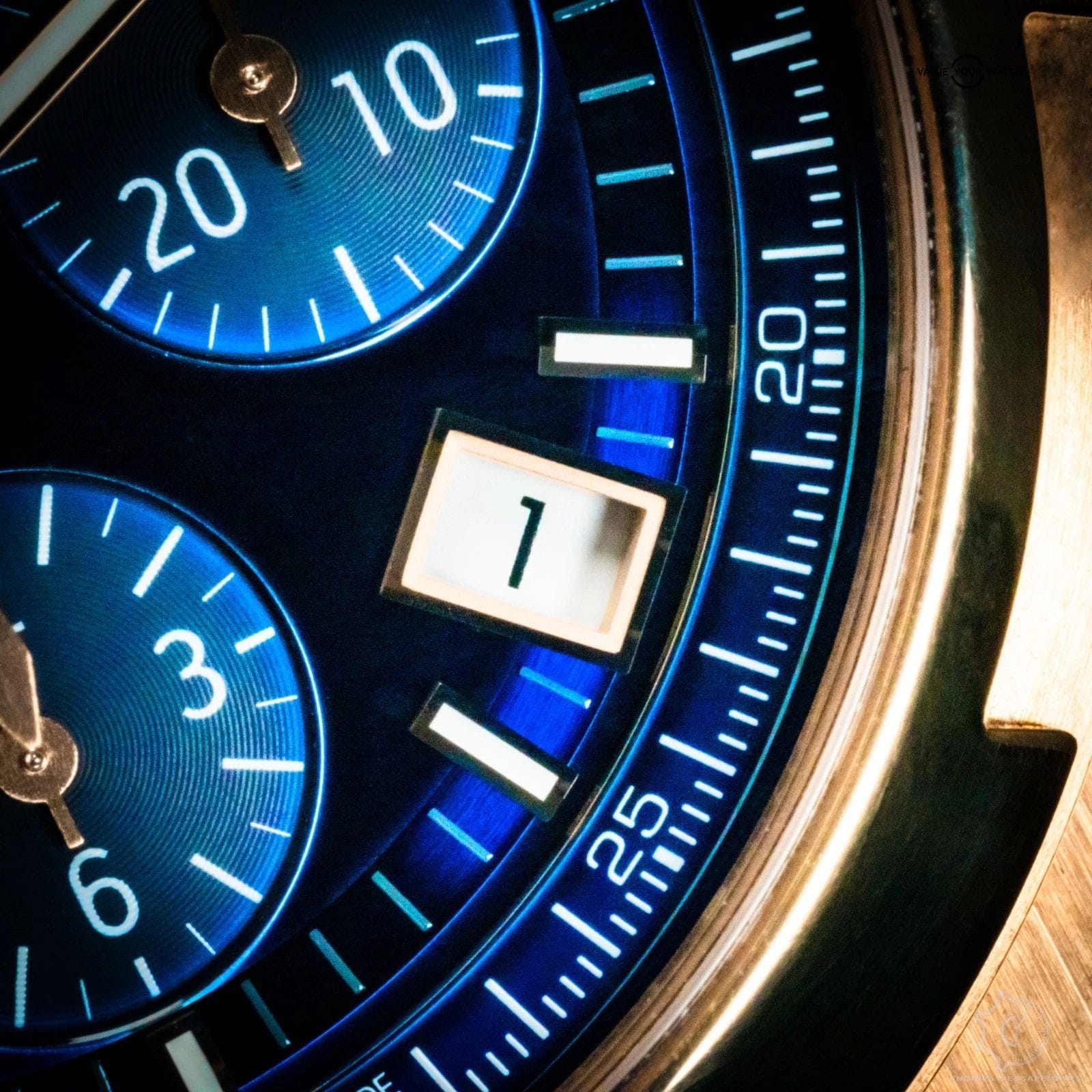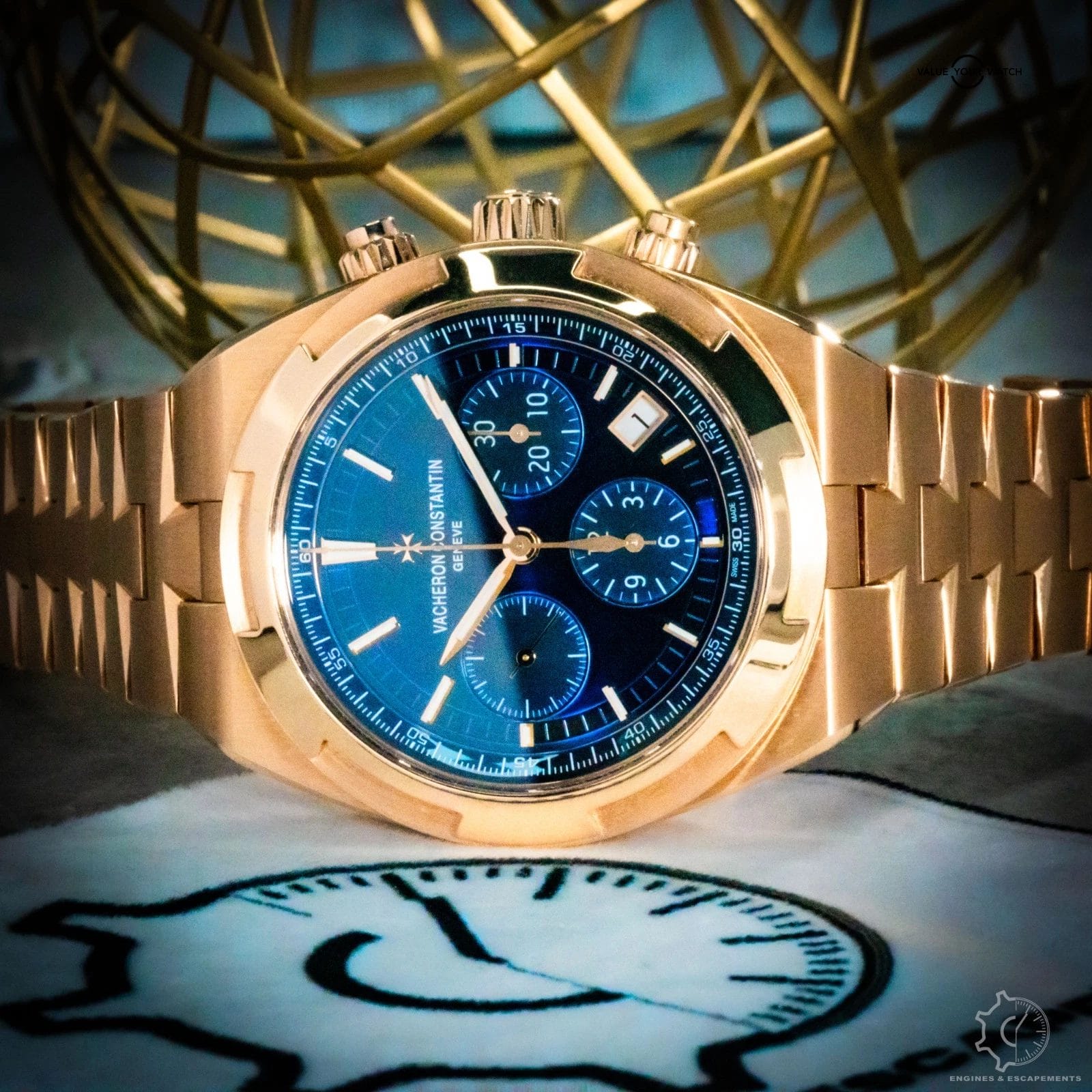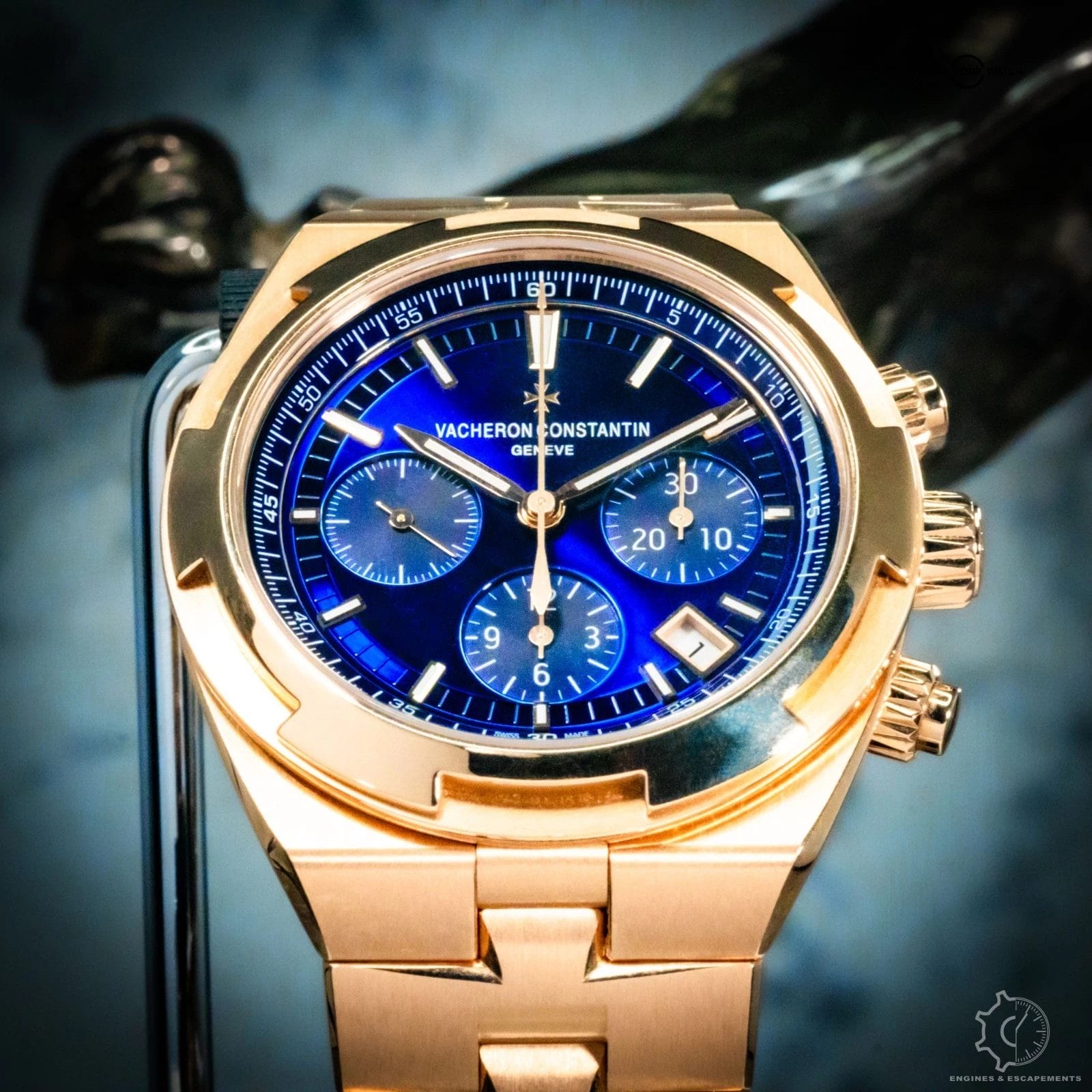 The Vacheron Constantin Overseas Chronograph exemplifies the maison’s mastery of combining high horology with refined sports luxury. Encased in a commanding 42.5mm 18k pink gold case, this reference offers a bold yet elegant presence on the wrist. The rich blue dial provides a striking contrast to the warm pink gold case and bracelet, creating a dynamic and instantly recognizable aesthetic within the Overseas collection. The balanced chronograph layout preserves clarity and sophistication, making this timepiece equally suited for everyday wear and elevated occasions.