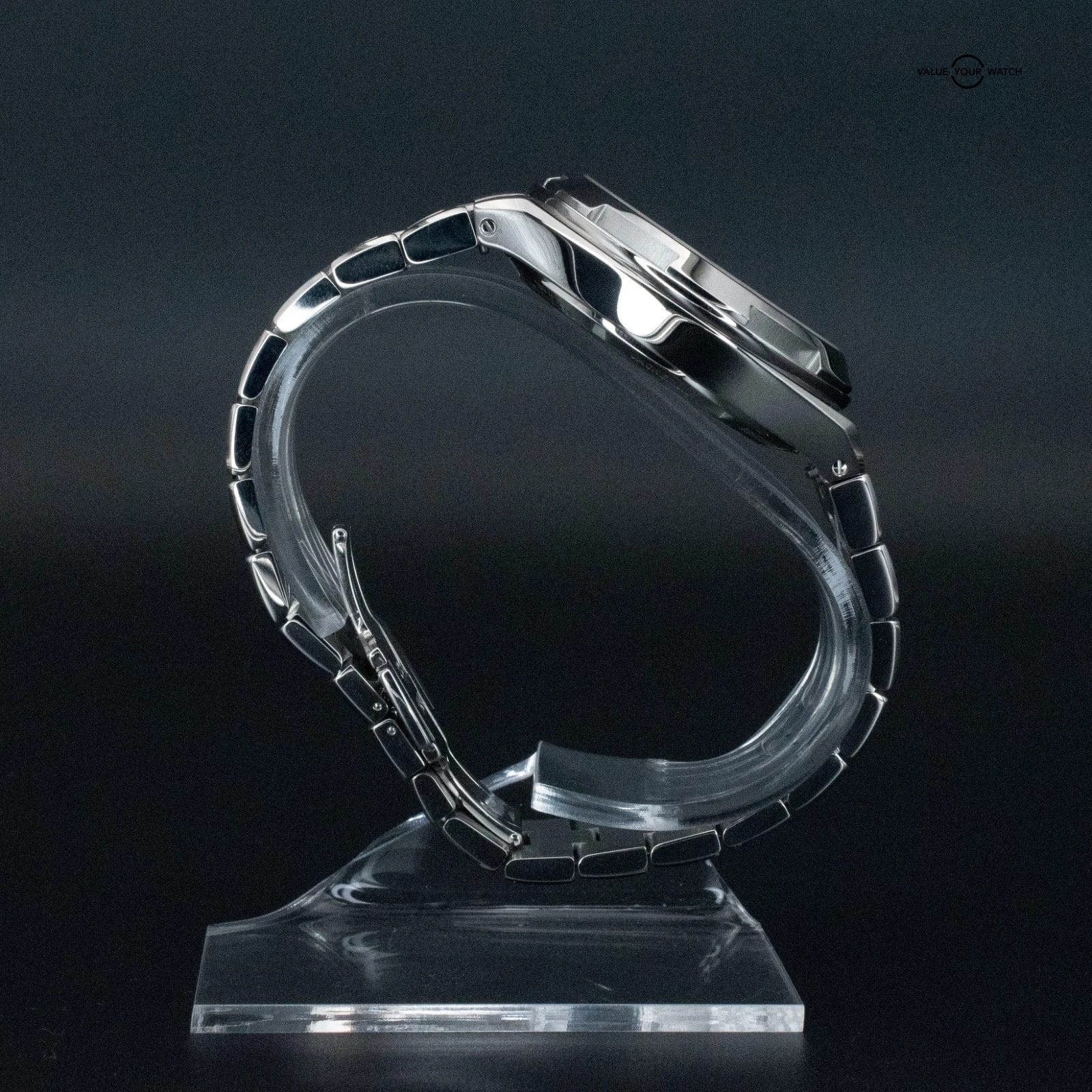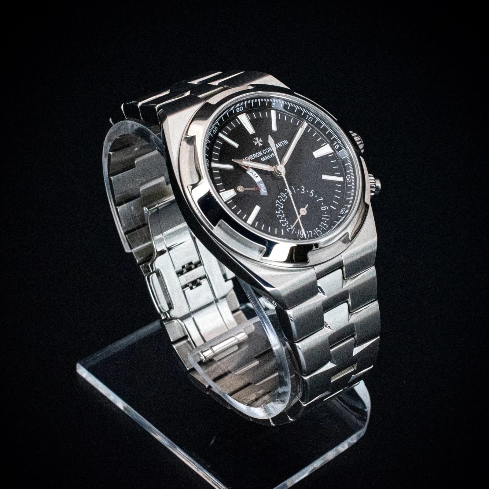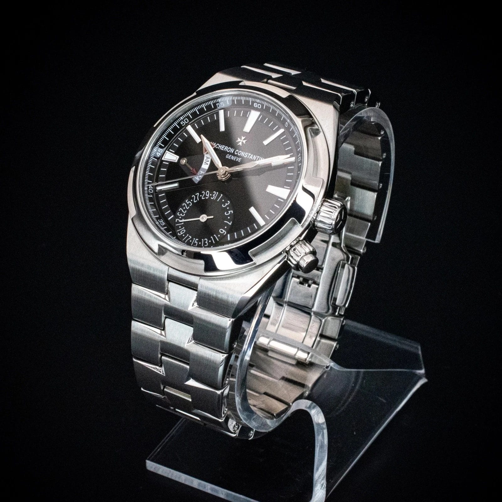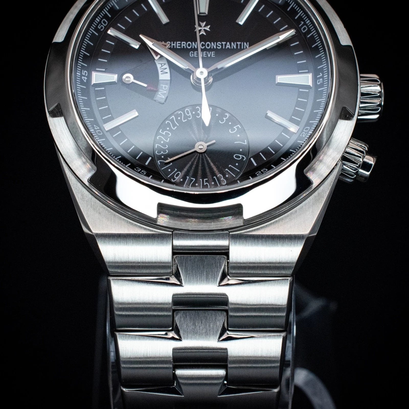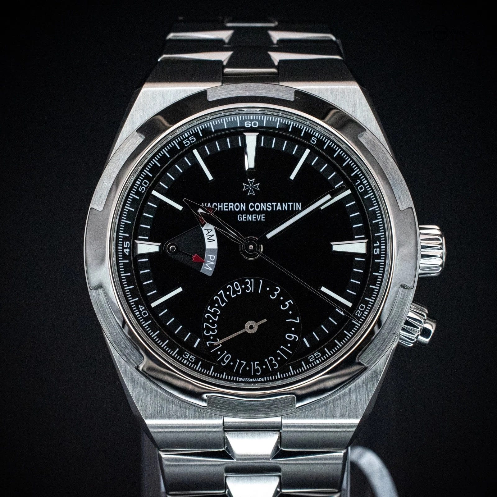 The Vacheron Constantin Overseas Dual Time ref. 7900V/110A-B546 delivers everything that makes the 7900V exceptional, then finishes it with a black lacquer dial that sharpens the entire presentation. Where the silver dial reads as refined, the black configuration reads as decisive — and the contrast between the lacquered black surface and the applied luminous markers and red-tipped second time zone hand is striking in a way that photographs cannot fully capture. The in-house caliber 5110 DT automatic movement handles hours, minutes, seconds, a second adjustable time zone, AM/PM indicator, and pointer date at 6 o’clock — all from Geneva, all legible at a glance. The 41mm stainless steel case with exhibition caseback, Maltese cross bezel, and integrated bracelet maintains the sport watch identity that has made the Overseas one of the most coveted references in its segment. Water resistant to 150 meters and anti-magnetic, this is a watch built for actual use at every occasion. The black dial 7900V is the sharpest-looking execution in the Overseas Dual Time family and the one that tends to draw the most immediate attention in person.