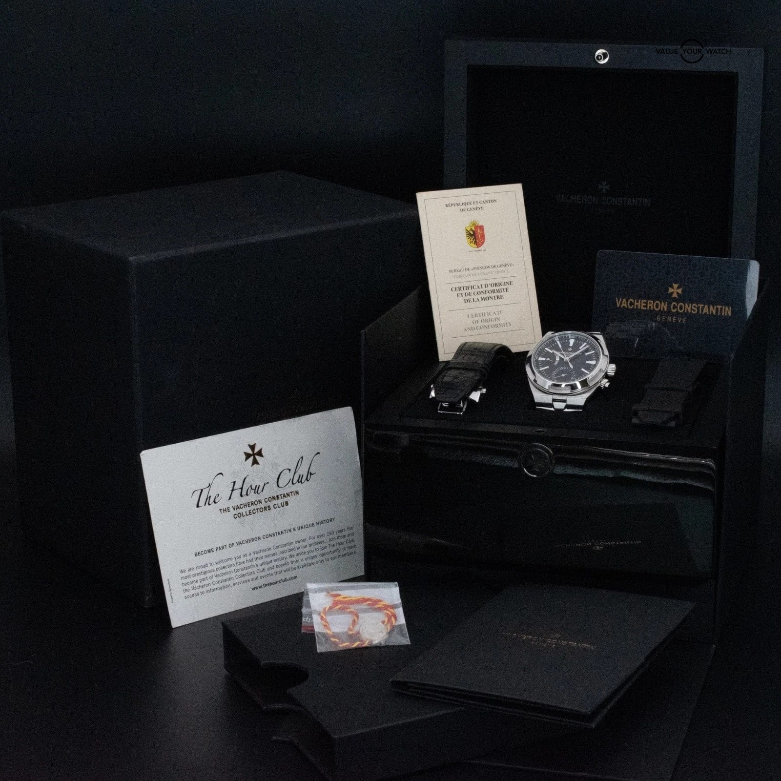 Contents: Double-boxed, Certificate of Origin, Hour Club card, 2021 Warranty card, hang tag, bracelet, and both leather and rubber straps.