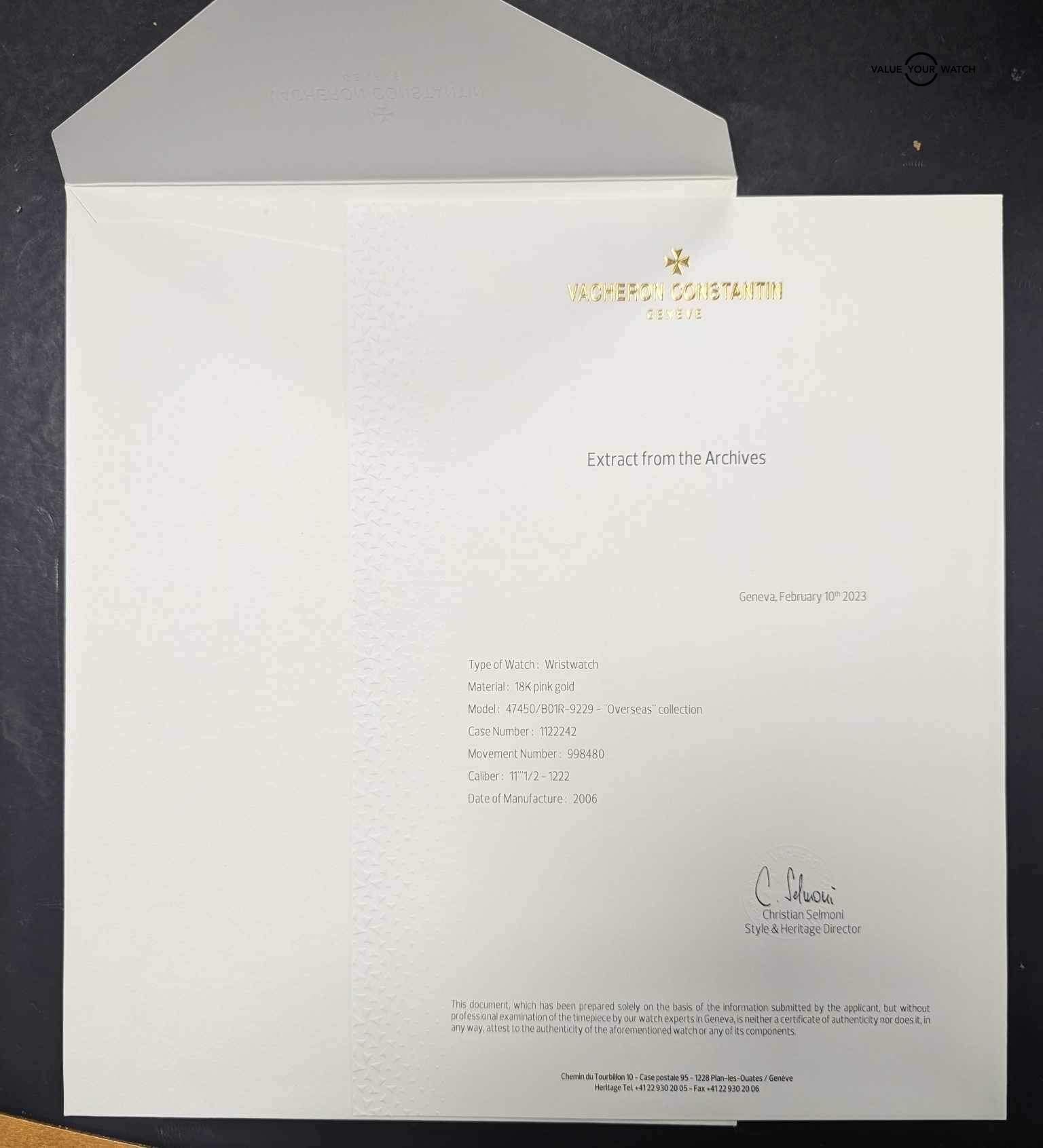 Pre-owned Vacheron Constantin Overseas Dual Time, Reference # 47450/B01R, self-winding automatic watch, features a 42mm 18k rose gold case surrounding a brown dial on an 18k rose gold bracelet with folding buckle. Functions include hours, minutes, small seconds, date, GMT and power reserve indicator. This watch has been serviced and inspected and comes with the original box and papers.