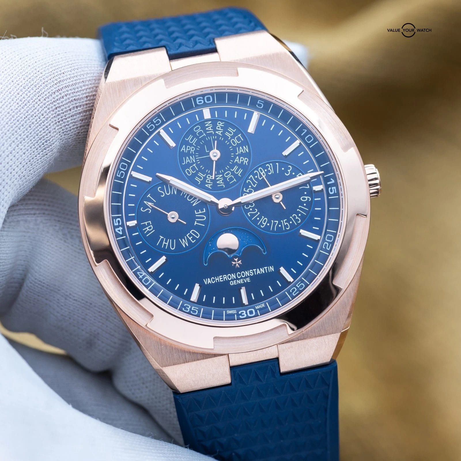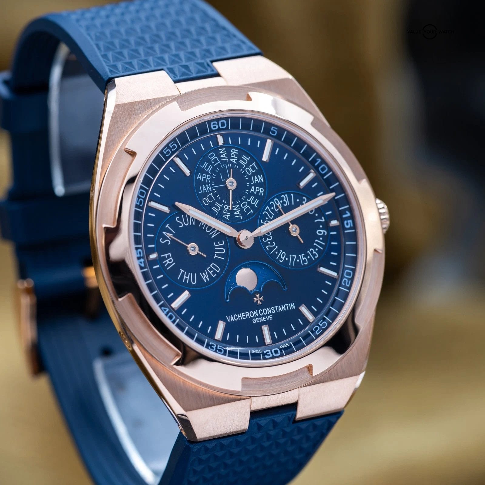The Vacheron Constantin Overseas Perpetual Calendar ultra-thin…the grail VC! Made in 18k Rose Gold, it has a warm, elegant presence that pairs beautifully with its deep blue sunburst dial. Inside is Vacheron’s ultra-thin automatic perpetual calendar movement, which tracks the day, date, month, leap year, and moon phase and won’t need adjusting until 2100. As part of the Overseas collection, it also carries a slightly sporty edge, making it just as suitable for everyday wear as it is for more formal occasions.