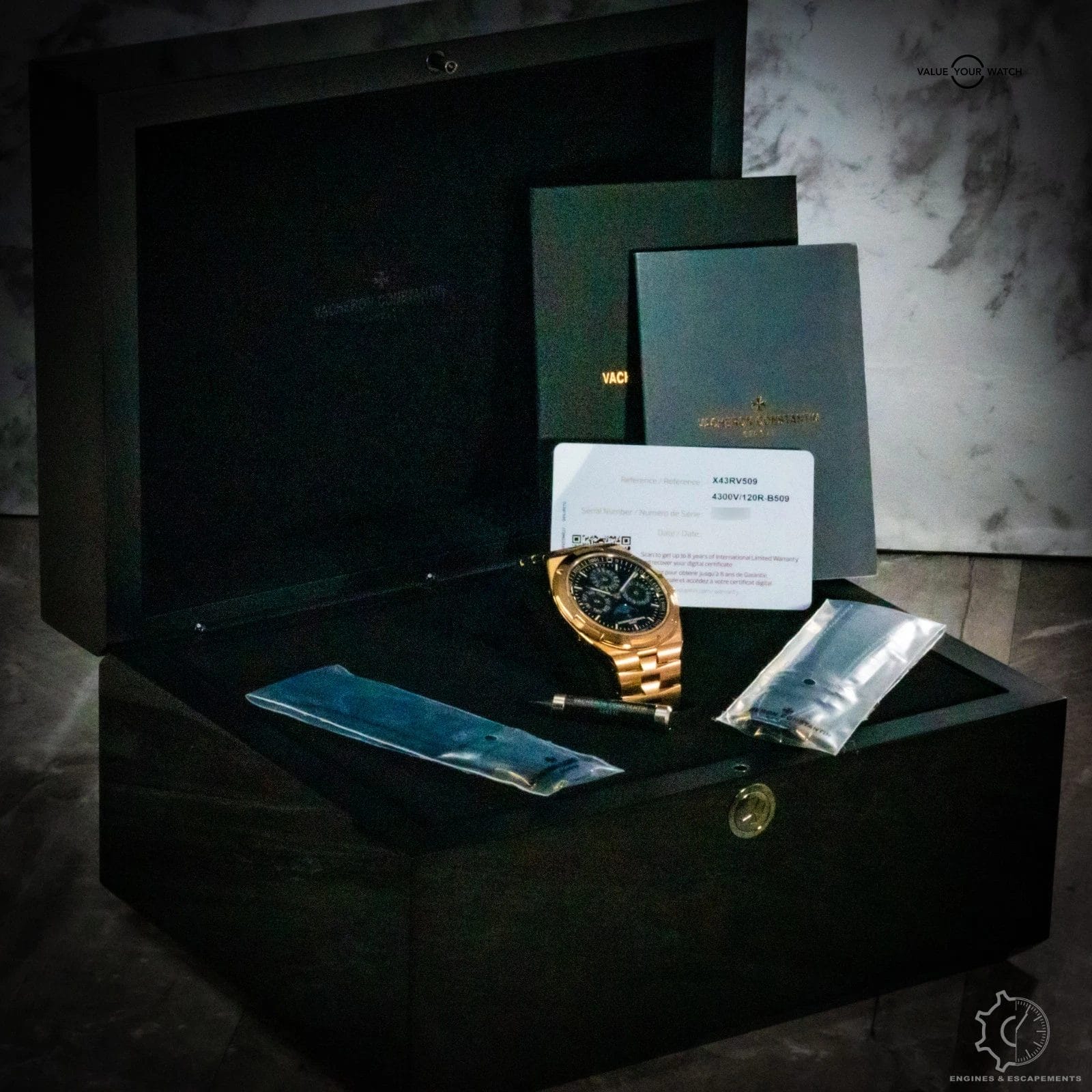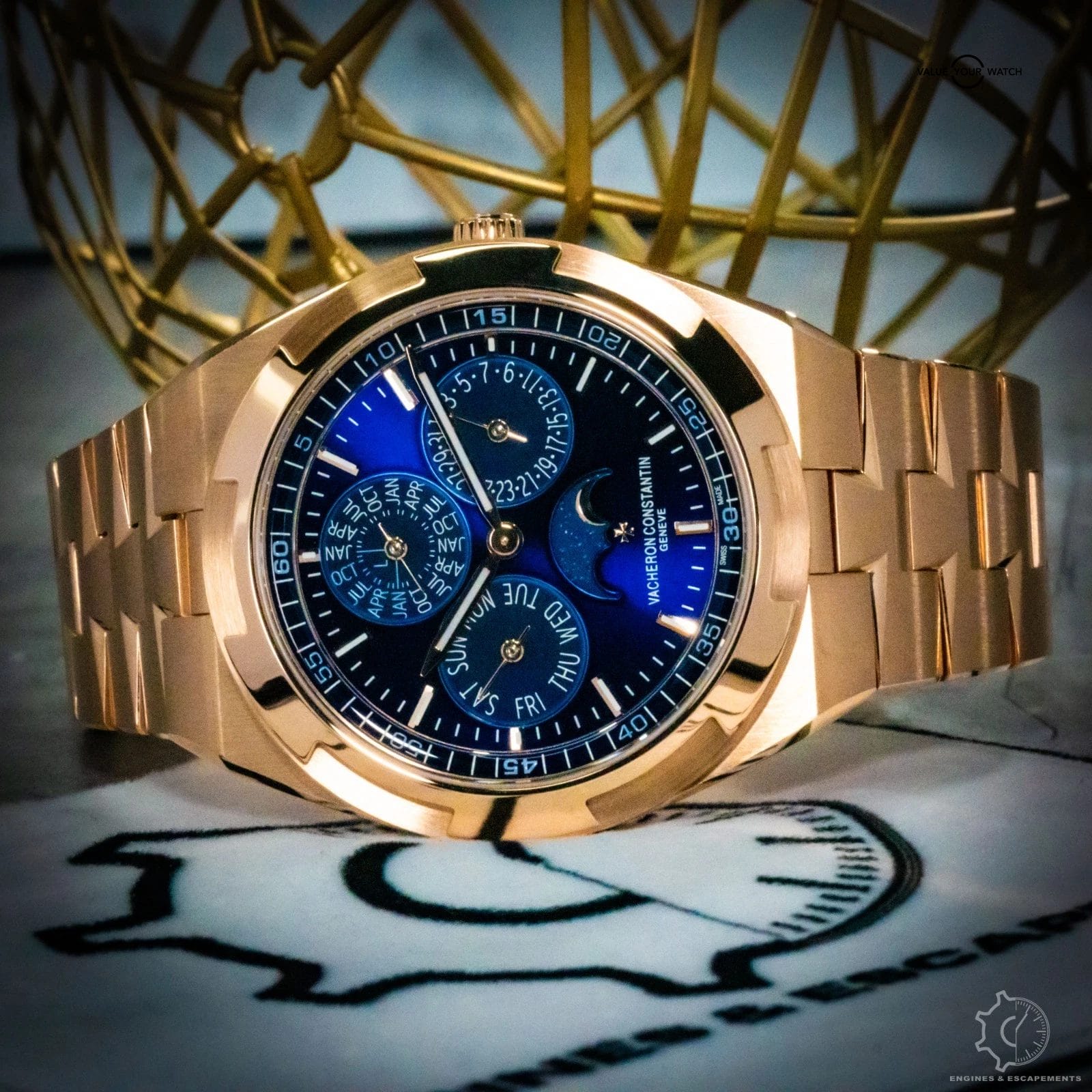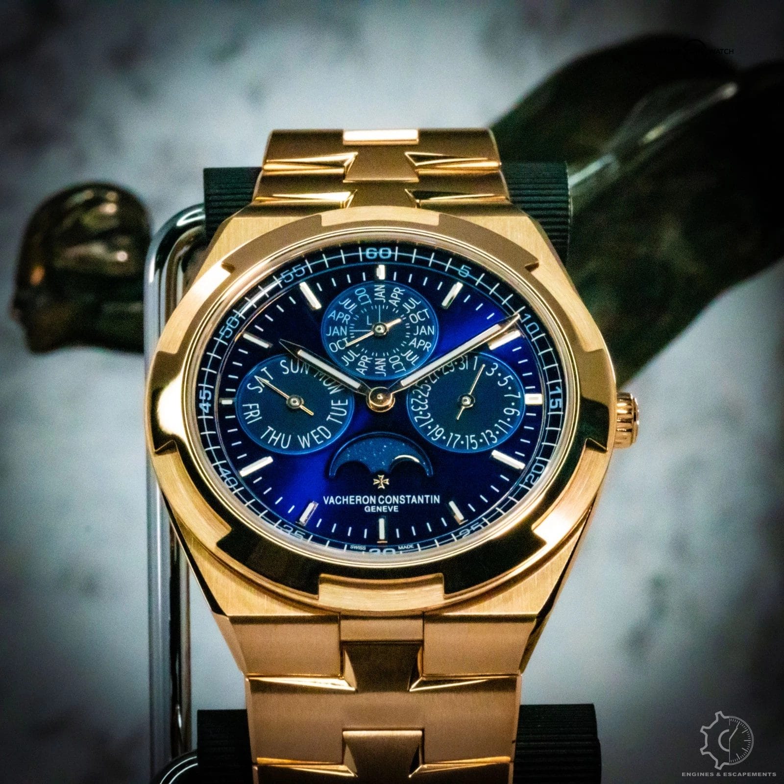 The Vacheron Constantin Overseas Perpetual Calendar 4300v is a striking blend of modern sport-luxury and refined elegance. Its rose-gold case gives the watch a warm, sophisticated presence, while the vivid blue dial adds depth and energy—creating a contrast that feels both contemporary and timeless. The polished and brushed surfaces of the case catch the light beautifully, enhancing the watch’s clean, architectural lines.