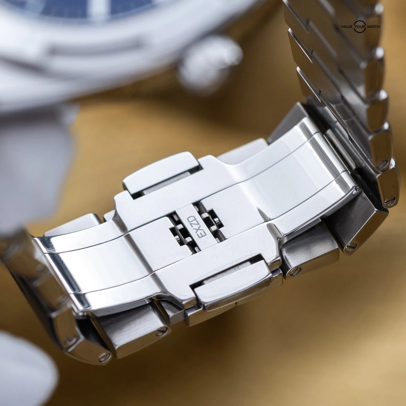 This piece comes as a full collector set with all boxes and papers. Warranty card is dated 2020. Watch is in excellent condition with next to no signs of wear. Comes with the additional blue leather strap and blue rubber strap (in addition to the stainless steel bracelet). The strap quick change mechanism makes it easy to change the look up when needed, and one of the best in the industry! Note: the bracelet currently has protective stickers on it that we can leave on for you or remove at your request.