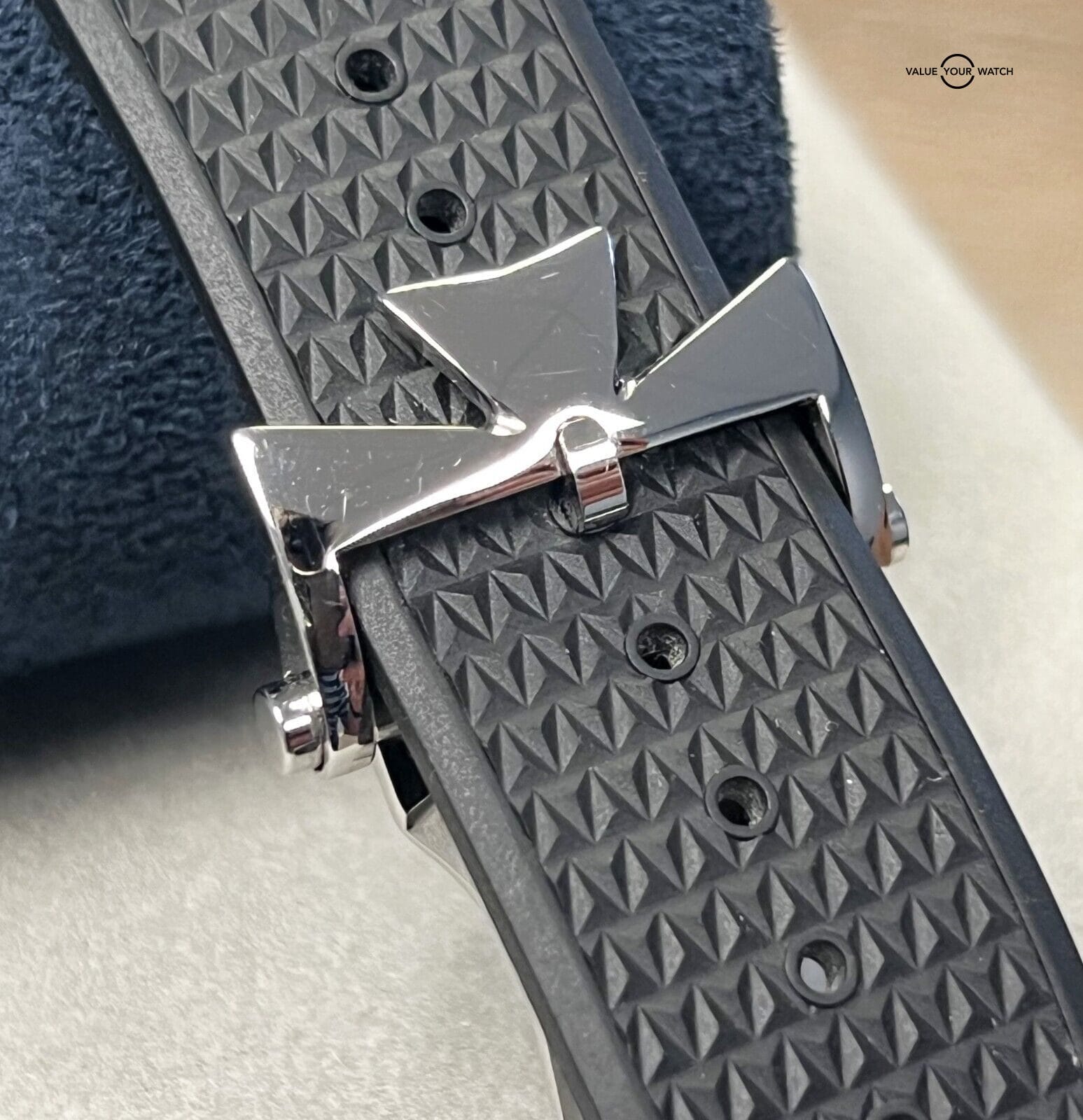 This beautiful timepiece comes with the outer black box, inner black wooden box, (it is missing the top part which holds the watch) Inner travel roll,(Shows wear, almost all of them do) guarantee papers, passport booklet, certificate, hangtag, USB, and 3 total straps. Stainless Steel, Rubber, and the black Alligator which has never been worn. This classic timepiece is powered by the historical calibre 5100 movement. The watch is in nice pre-owned condition. The watch on stainless band will accommodate up to a 7.75” wrist and larger on rubber and alligator. The watch shows some typical light cosmetic swirls on the case. We are leaving in its unpolished condition and will let the future buyer decide if they want it polished or not. Mechanically the watch is functioning as it should. Serial # and names are blurred for privacy reasons.