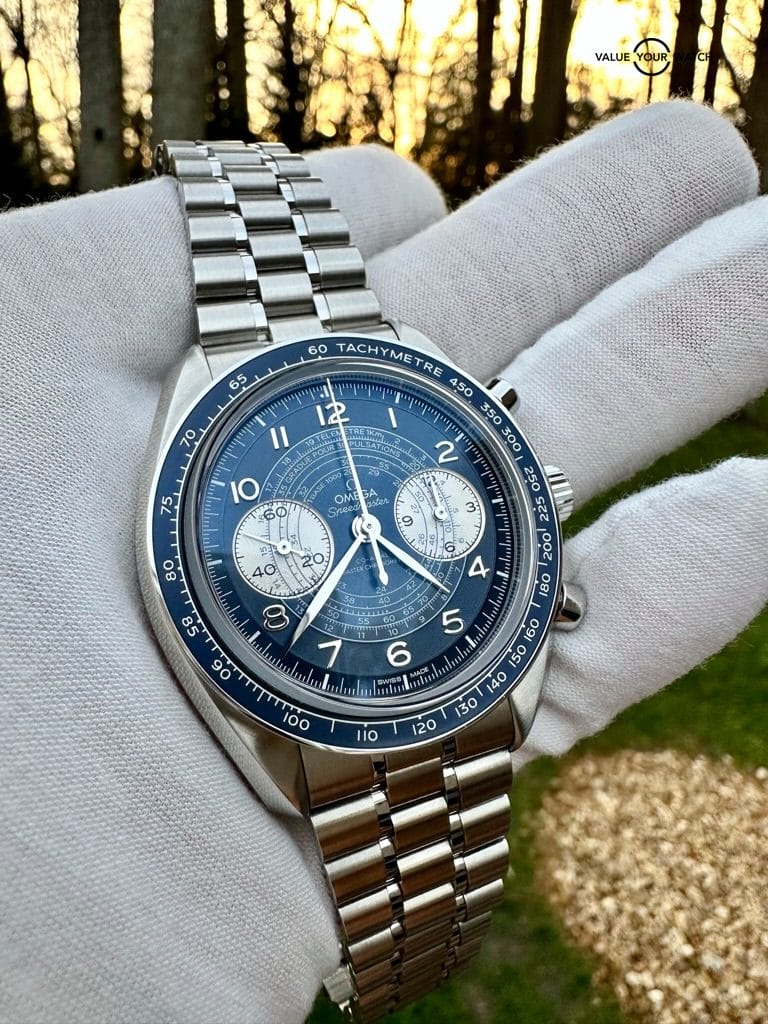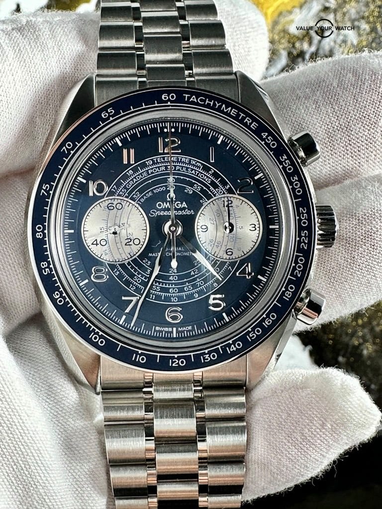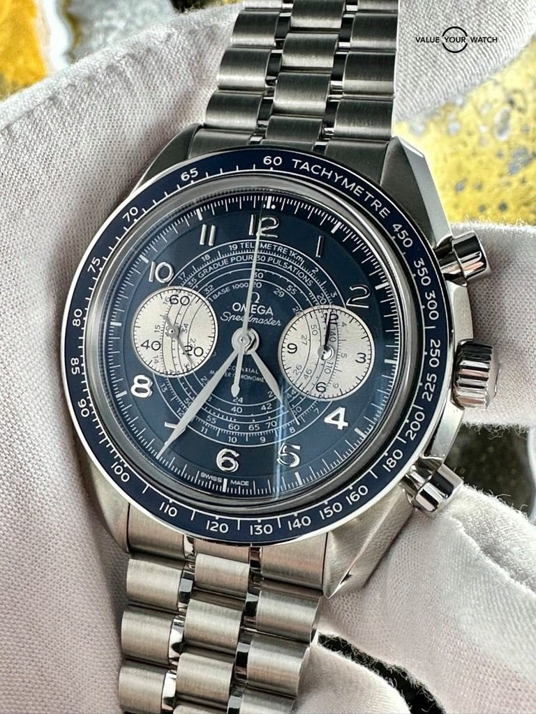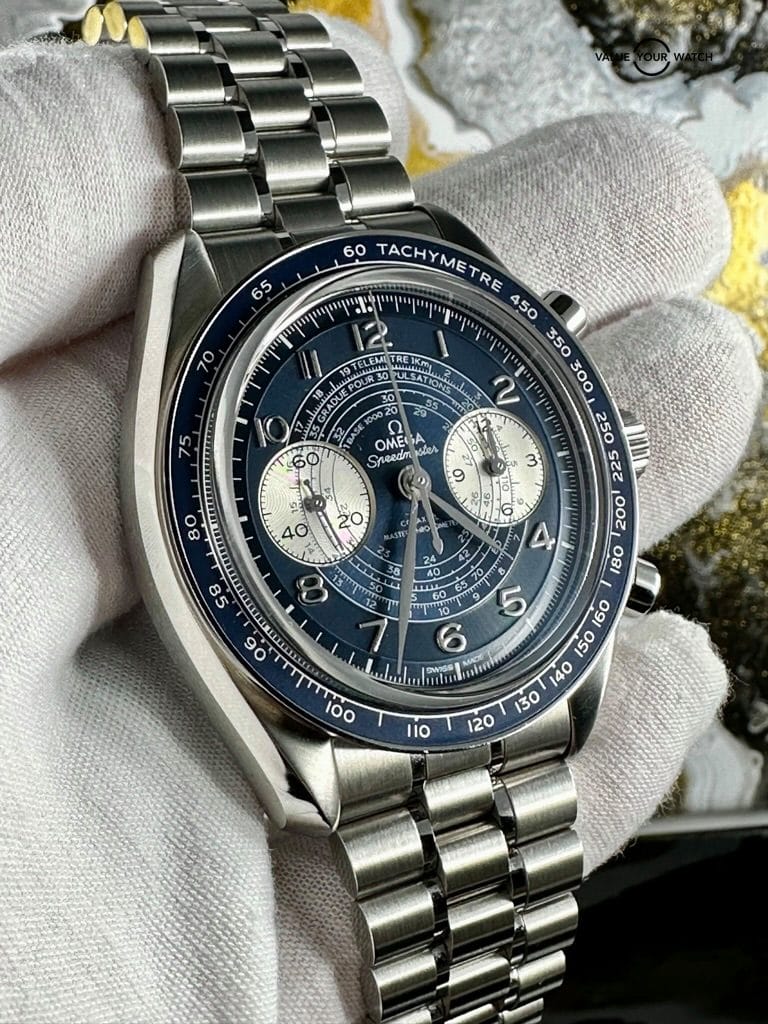 Omega Speedmaster Chronoscope – A clear throwback to 1940’s watchmaking with the iconic leaf-shaped hands and three “snail” timing scales. Continuing outward, Omega has added a “spiral” track pattern that runs beneath the Arabic numerals. All we can say is wow – what a dial Omega has artistically detailed and perfected on a beautiful blue canvas.