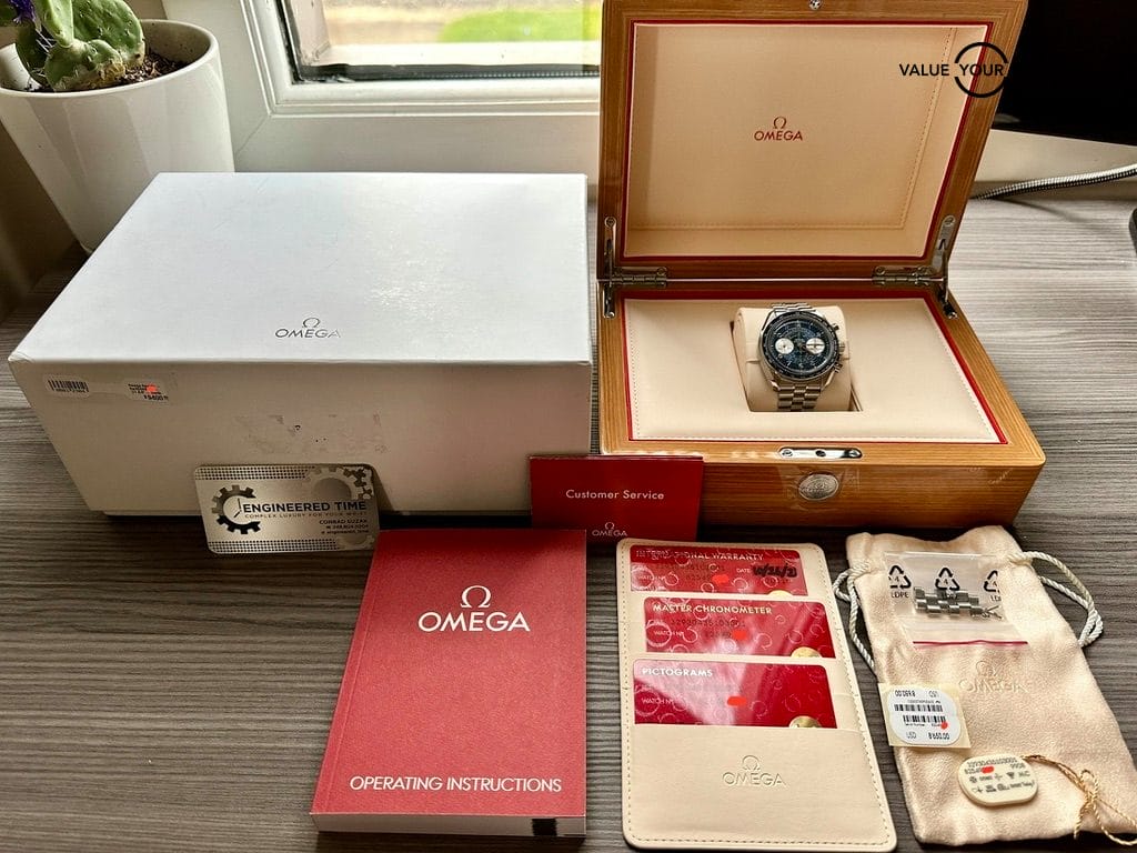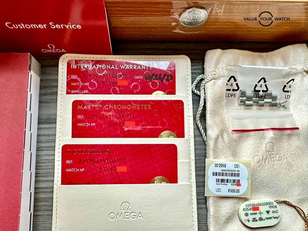 The watch comes complete as shown in the photo – Omega outer box, Omega wooden display box, warranty card, chronometer card, pictogram card, instruction booklet, all removed links, original hangtag, etc. Shipping is FedEx 2nd Day insured.