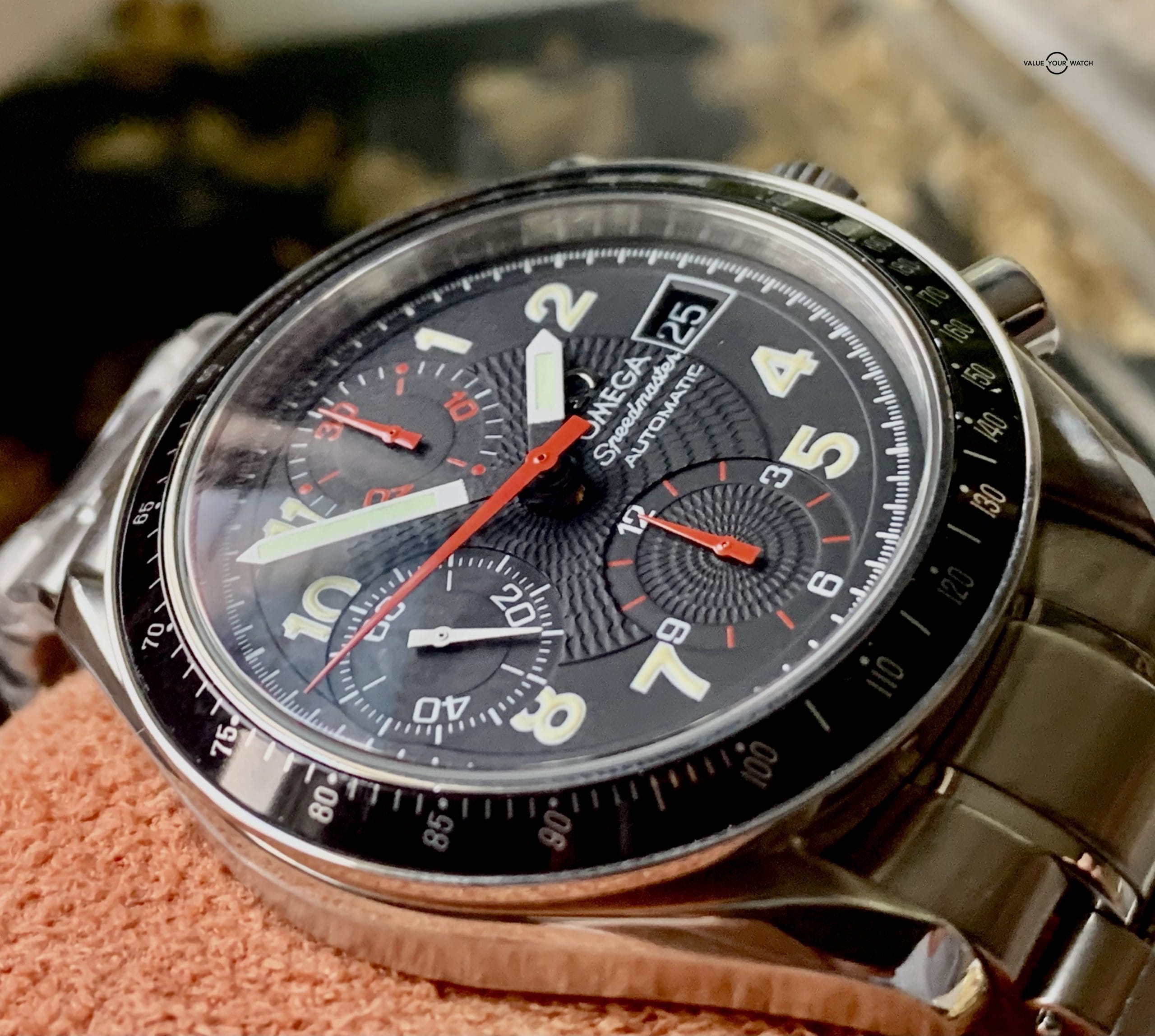 However this particular model, oh boy!! Or should I say little brother. The “Speedy Reduced” it is coined is the smaller brother to the big bad Moonwatch. But it carries all the same attributes as its big brother just in a smaller package. This particular Speedmaster is a special edition designed for the Japanese market. The textures of the dial and pop of RED color make it stand out from the normal Speedy. It is just so darn beautiful!!