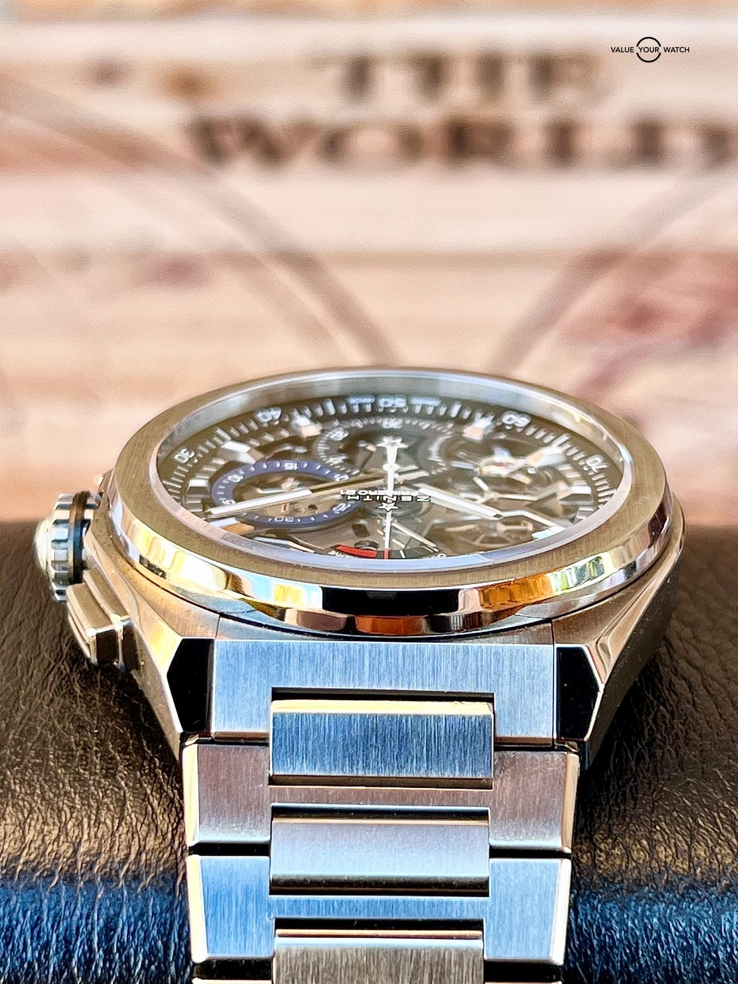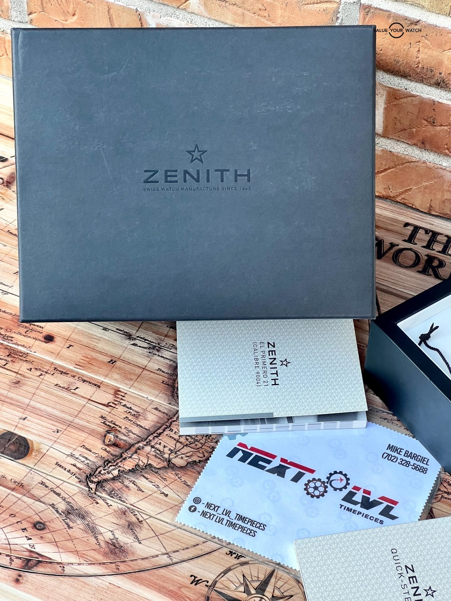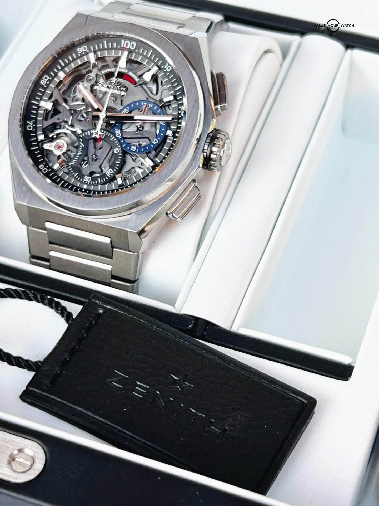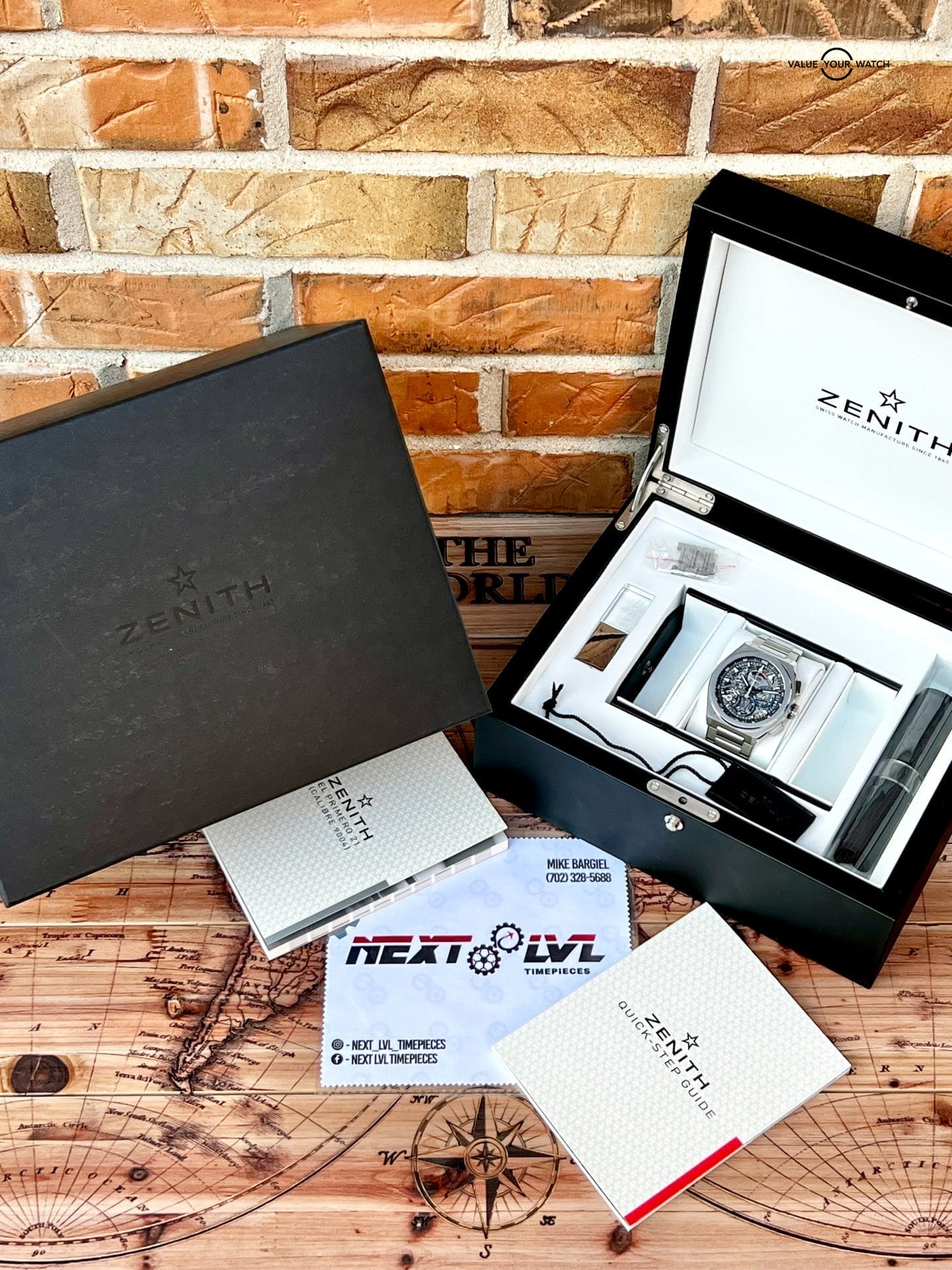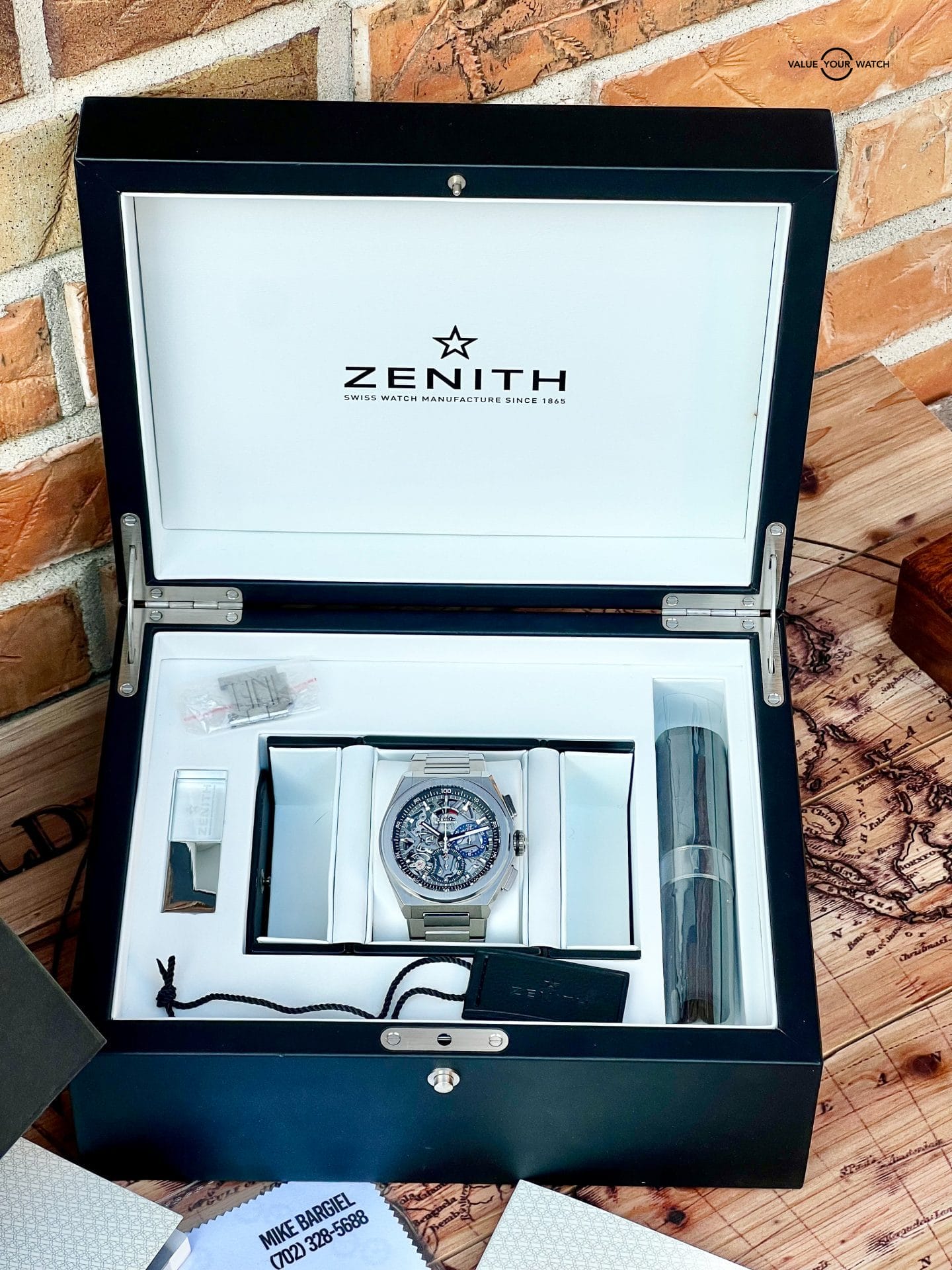 Defy expectations and showcase your own original style with the Zenith Defy 21 El Primero Skeleton wristwatch. This luxury timepiece features a 44mm round titanium case with a smooth bezel. The bracelet is also made of titanium with a butterfly clasp for a secure fit. The clear dial with baton indexes and a skeleton pattern shows off the intricate mechanical (automatic) movement of the watch. In addition to its stunning design, this Zenith Defy watch offers many features including water-resistance up to 100m (10 ATM), a power reserve indicator, and a chronograph function. Swiss made and backed by a seller warranty, this watch comes with its original box, books, and service papers. Don’t miss the chance to add this unique piece to your collection.