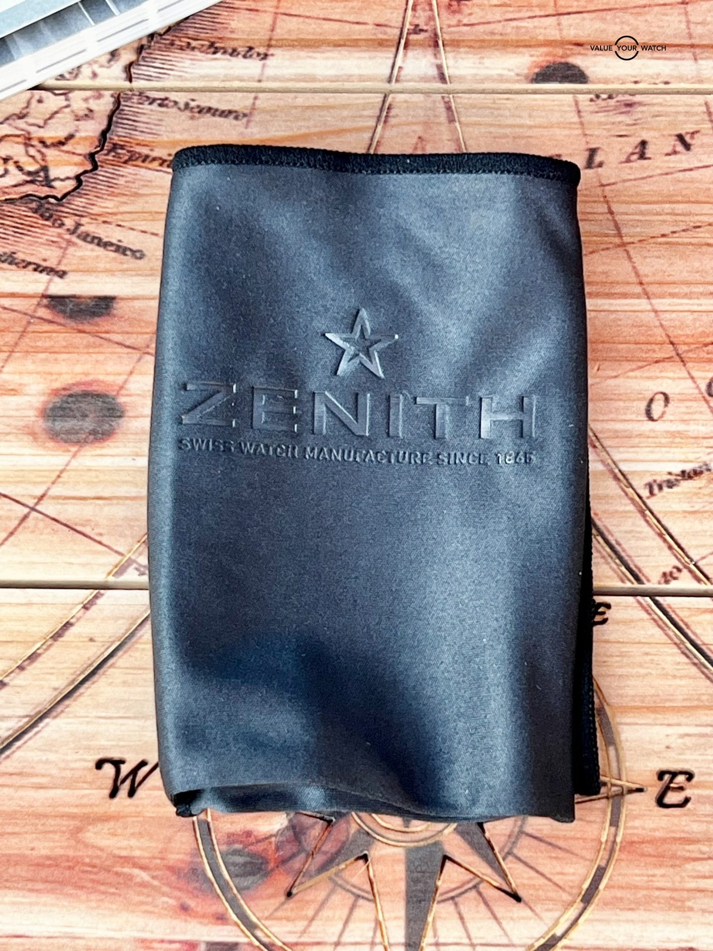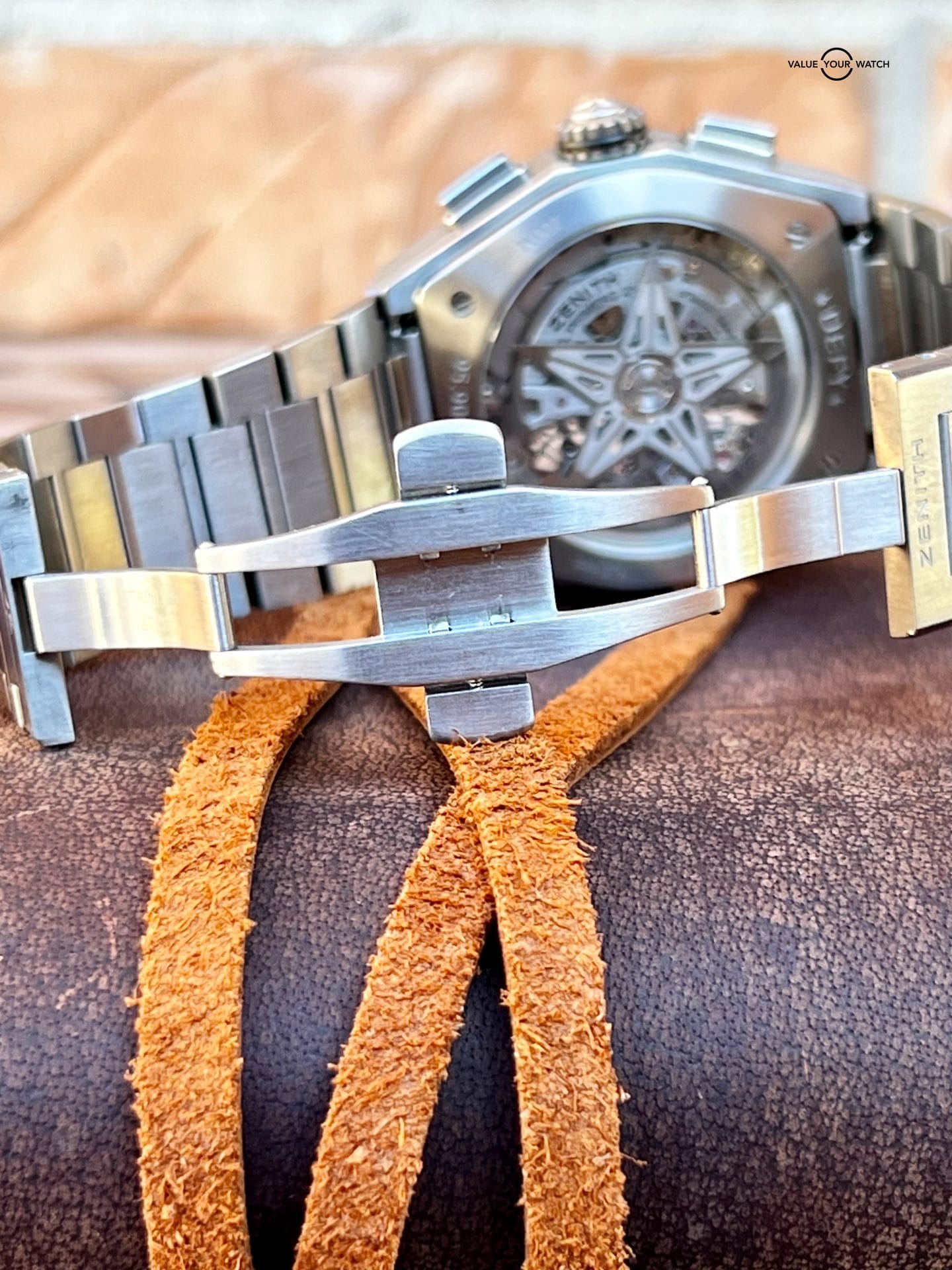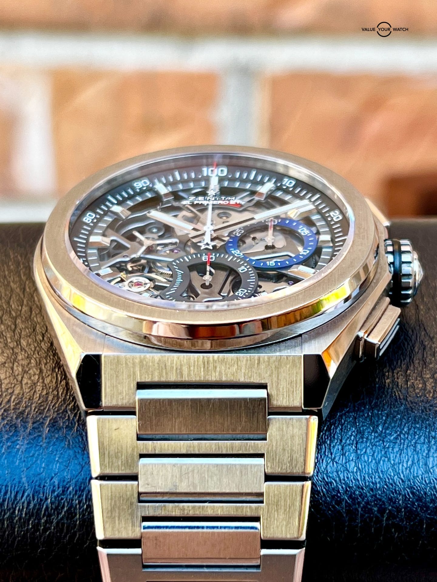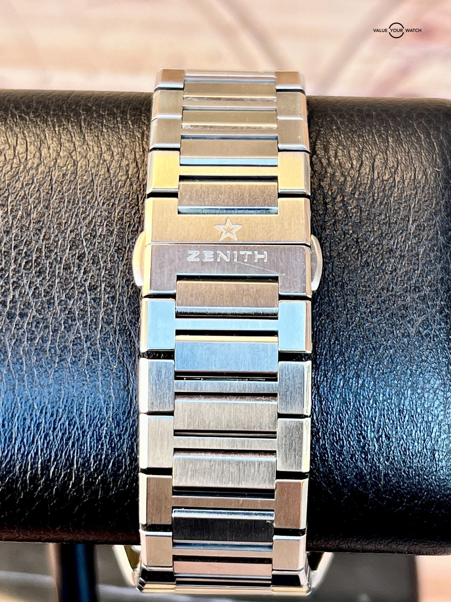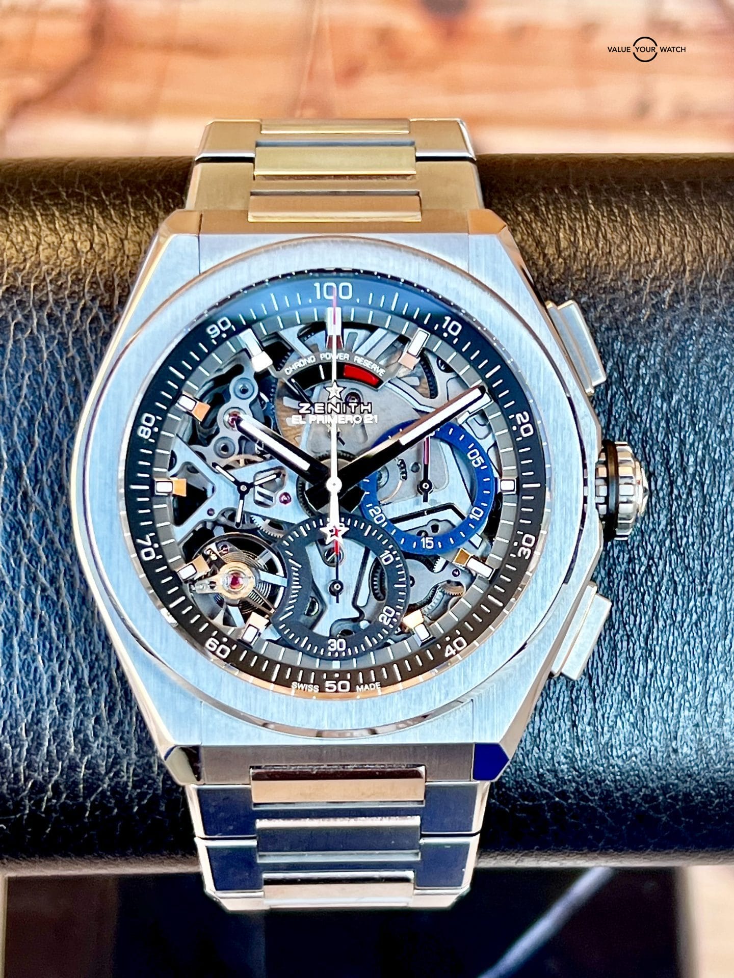 Defy expectations and showcase your own original style with the Zenith Defy 21 El Primero Skeleton wristwatch. This luxury timepiece features a 44mm round titanium case with a smooth bezel. The bracelet is also made of titanium with a butterfly clasp for a secure fit. The clear dial with baton indexes and a skeleton pattern shows off the intricate mechanical (automatic) movement of the watch. In addition to its stunning design, this Zenith Defy watch offers many features including water-resistance up to 100m (10 ATM), a power reserve indicator, and a chronograph function. Swiss made and backed by a seller warranty, this watch comes with its original box, books, and service papers. Don’t miss the chance to add this unique piece to your collection.