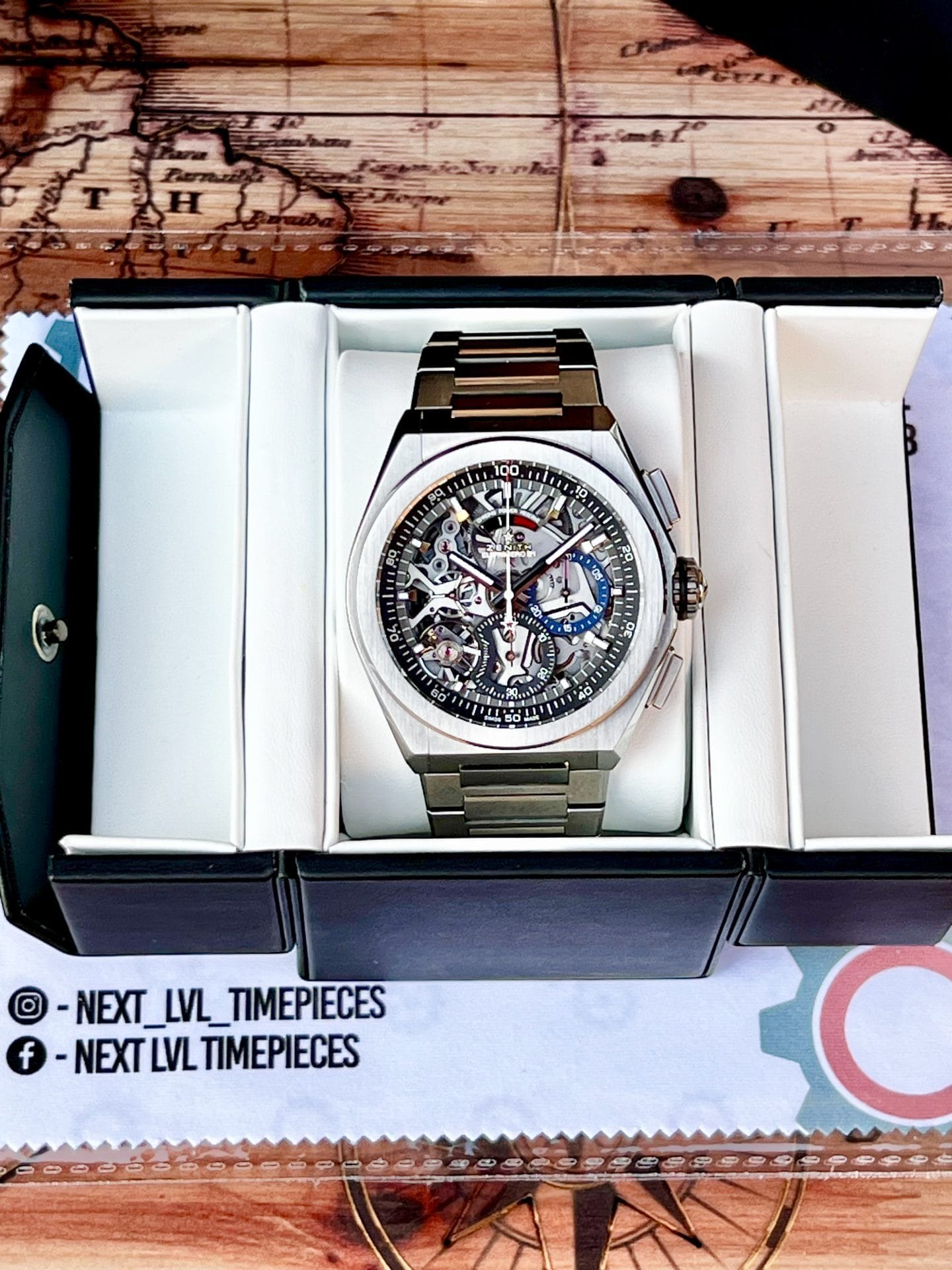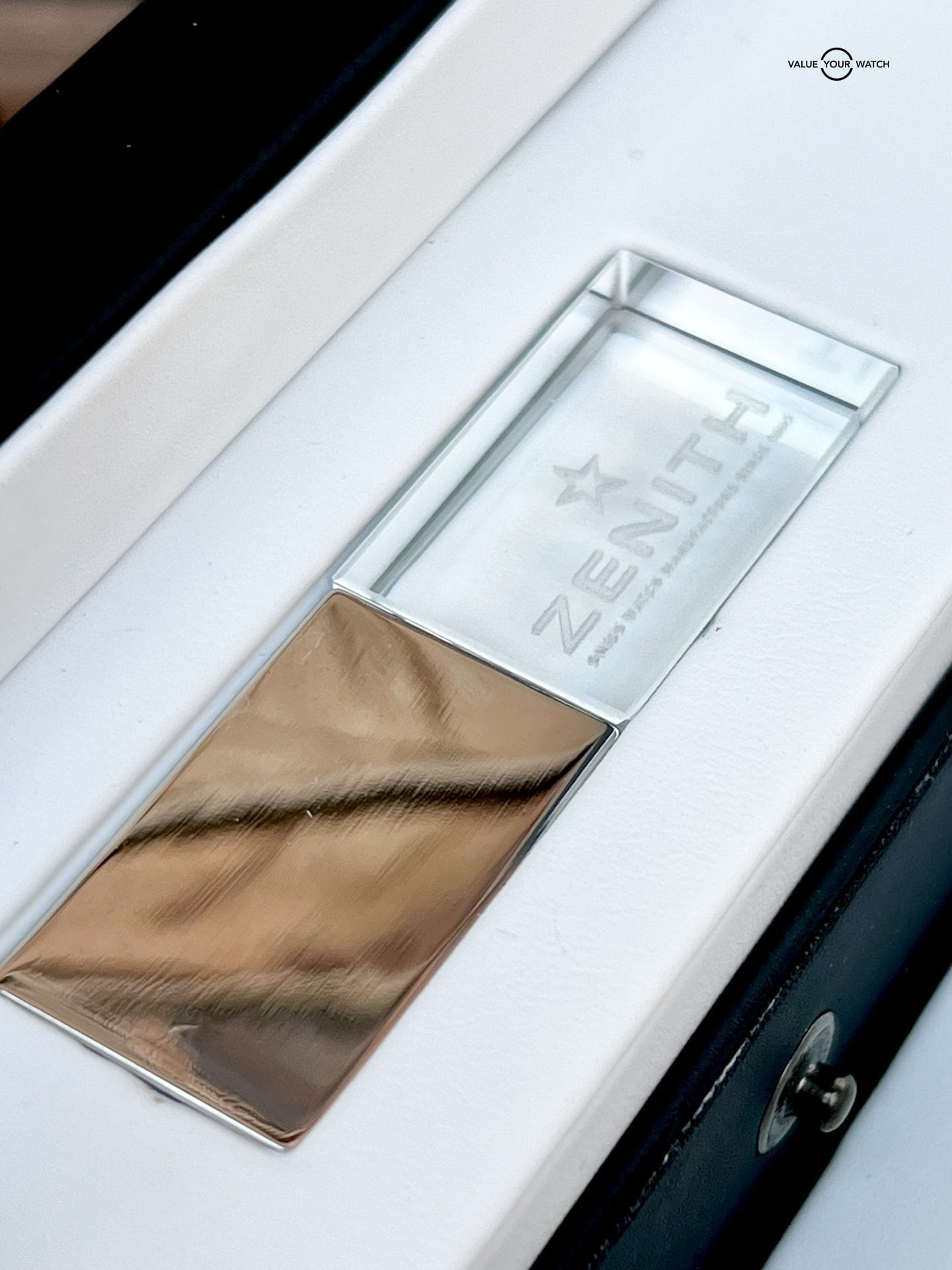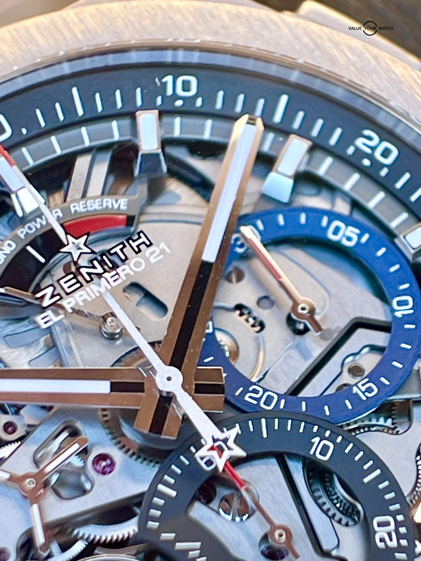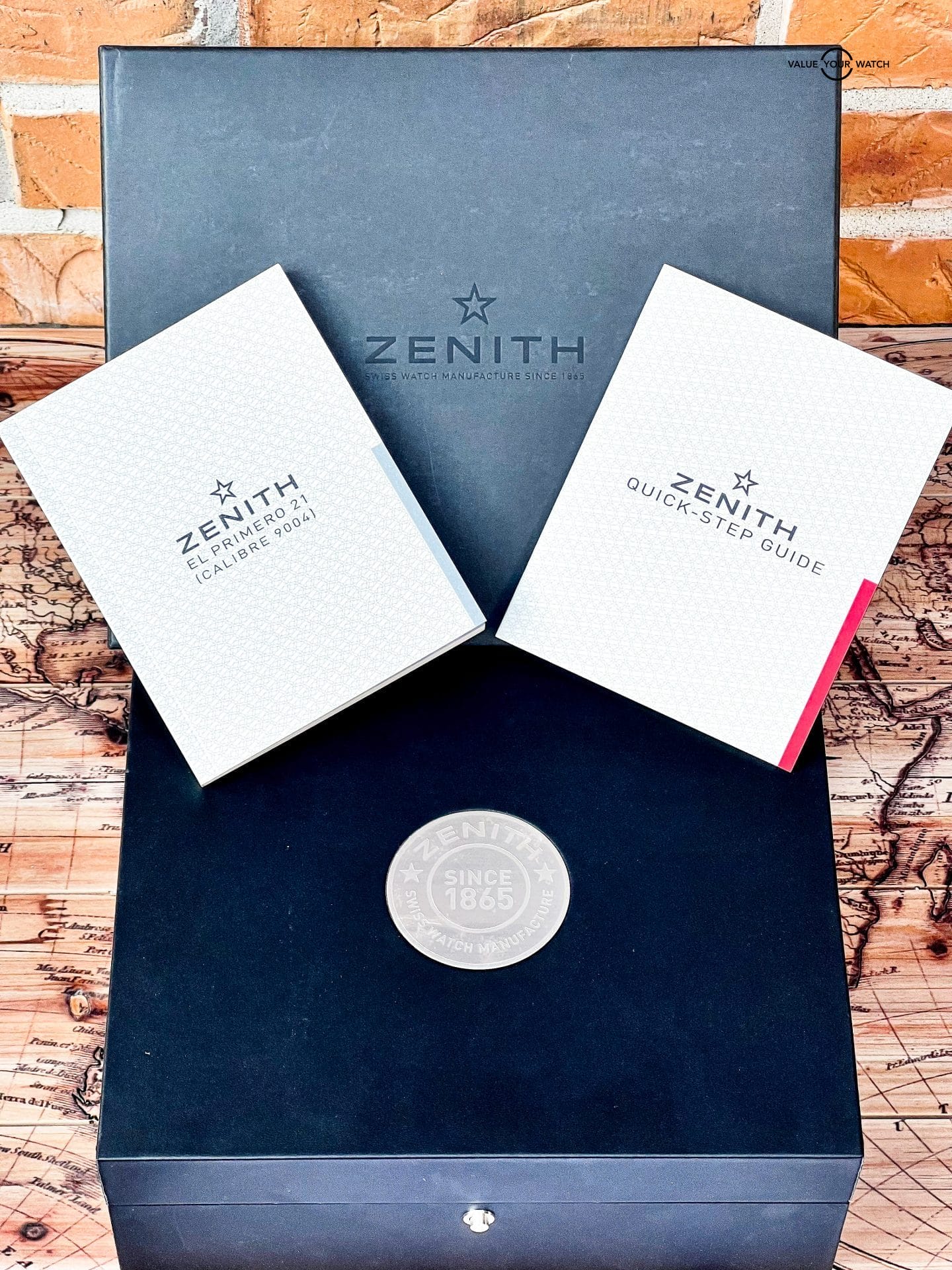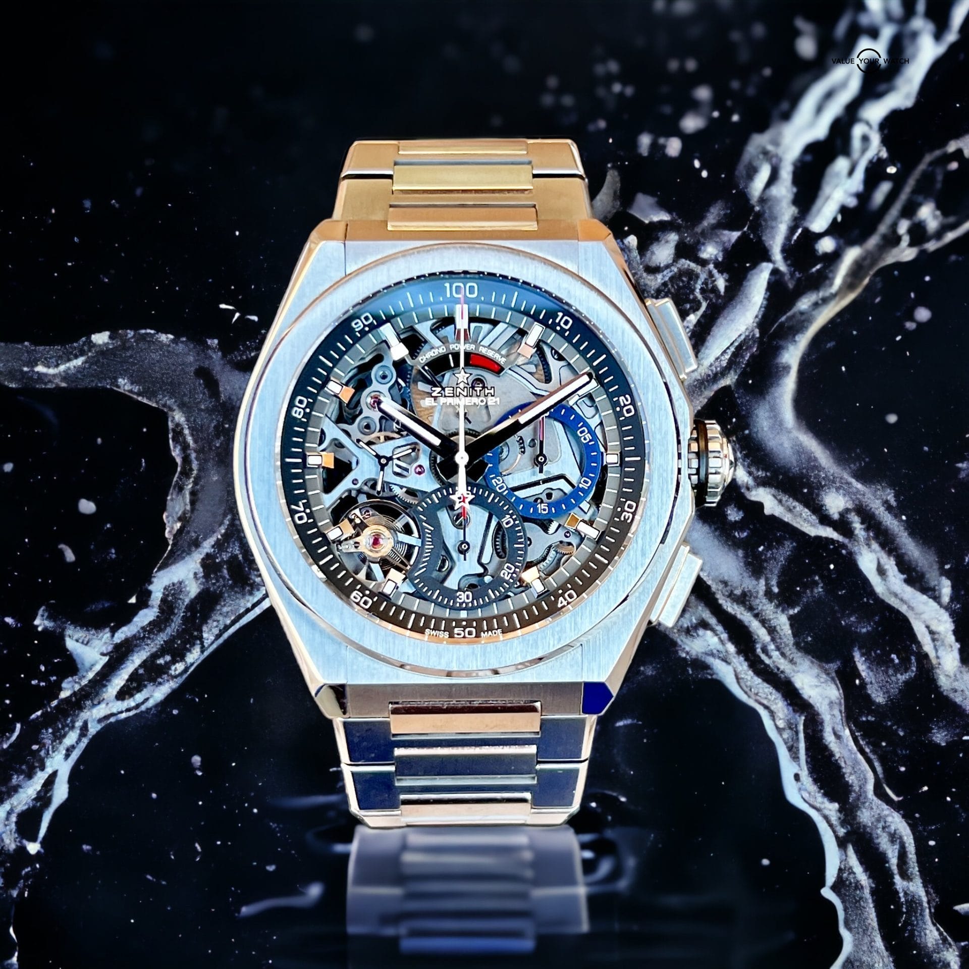 Defy expectations and showcase your own original style with the Zenith Defy 21 El Primero Skeleton wristwatch. This luxury timepiece features a 44mm round titanium case with a smooth bezel. The bracelet is also made of titanium with a butterfly clasp for a secure fit. The clear dial with baton indexes and a skeleton pattern shows off the intricate mechanical (automatic) movement of the watch. In addition to its stunning design, this Zenith Defy watch offers many features including water-resistance up to 100m (10 ATM), a power reserve indicator, and a chronograph function. Swiss made and backed by a seller warranty, this watch comes with its original box, books, and service papers. Don’t miss the chance to add this unique piece to your collection.