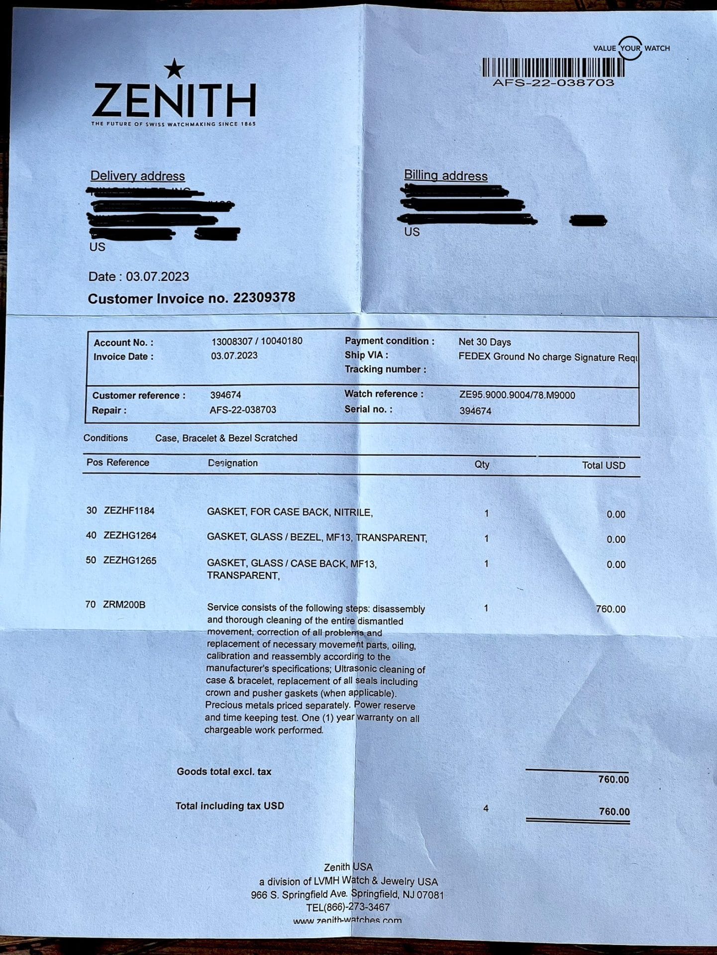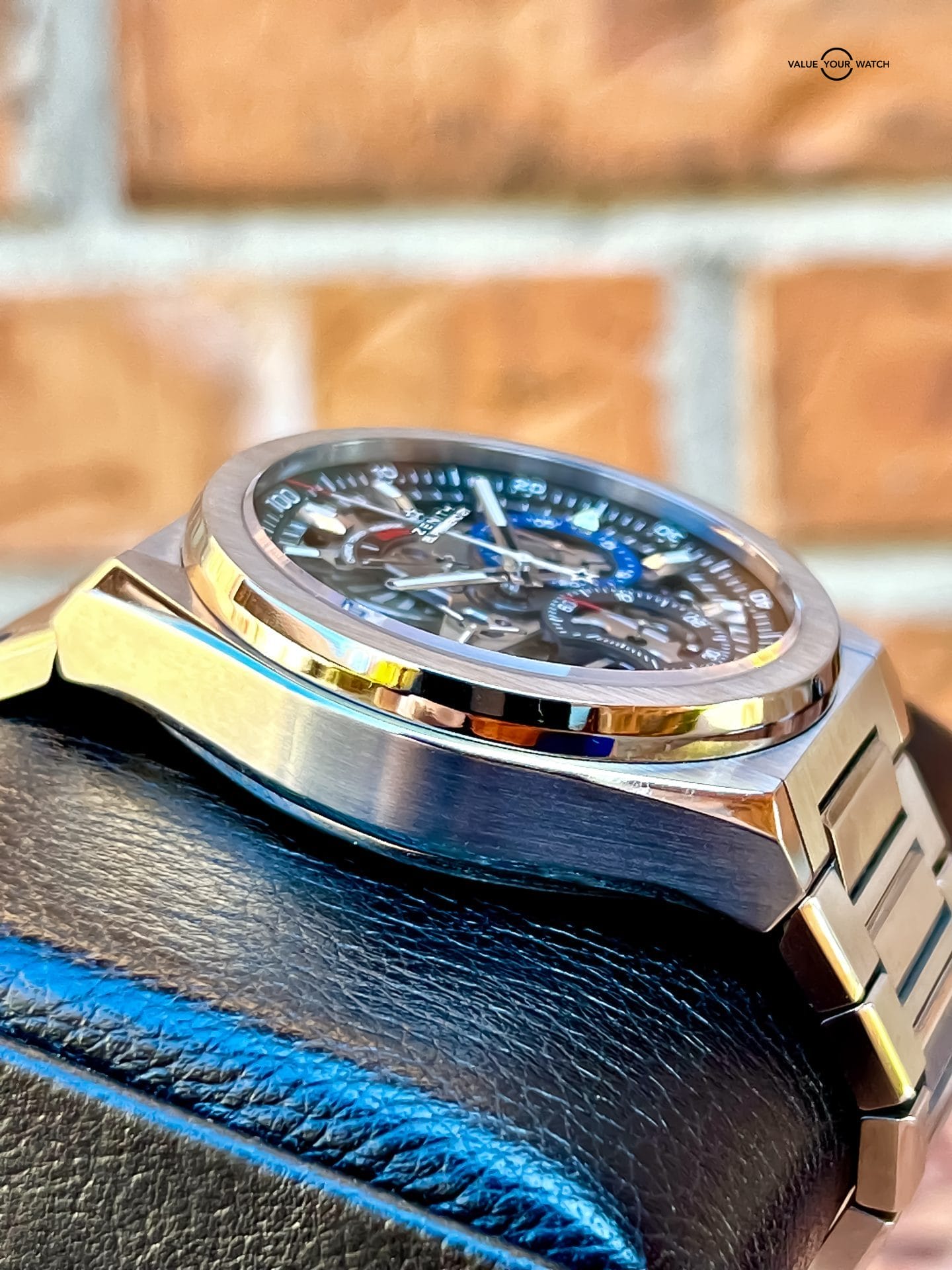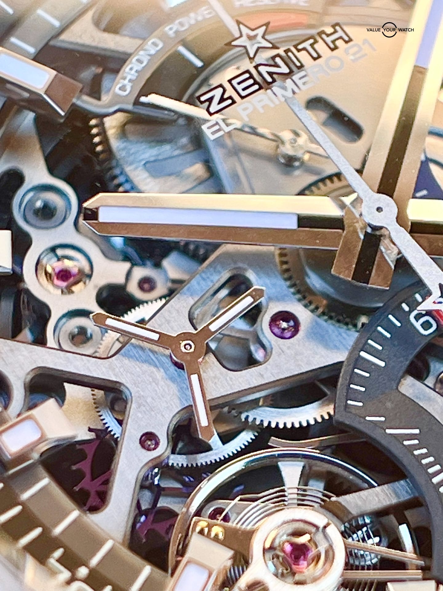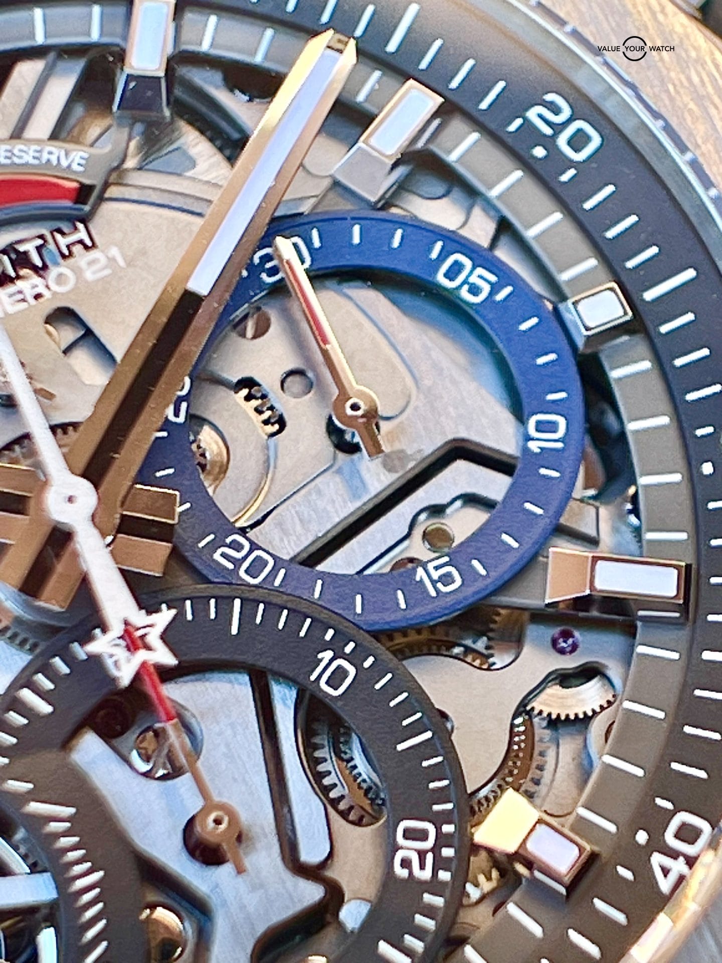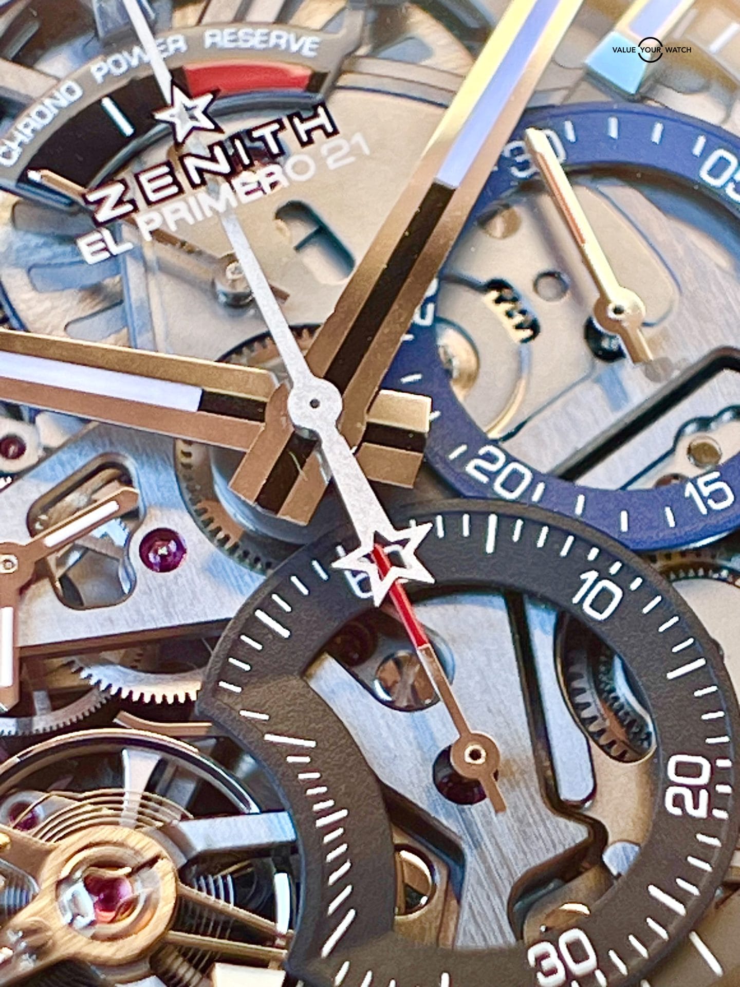 Defy expectations and showcase your own original style with the Zenith Defy 21 El Primero Skeleton wristwatch. This luxury timepiece features a 44mm round titanium case with a smooth bezel. The bracelet is also made of titanium with a butterfly clasp for a secure fit. The clear dial with baton indexes and a skeleton pattern shows off the intricate mechanical (automatic) movement of the watch. In addition to its stunning design, this Zenith Defy watch offers many features including water-resistance up to 100m (10 ATM), a power reserve indicator, and a chronograph function. Swiss made and backed by a seller warranty, this watch comes with its original box, books, and service papers. Don’t miss the chance to add this unique piece to your collection.