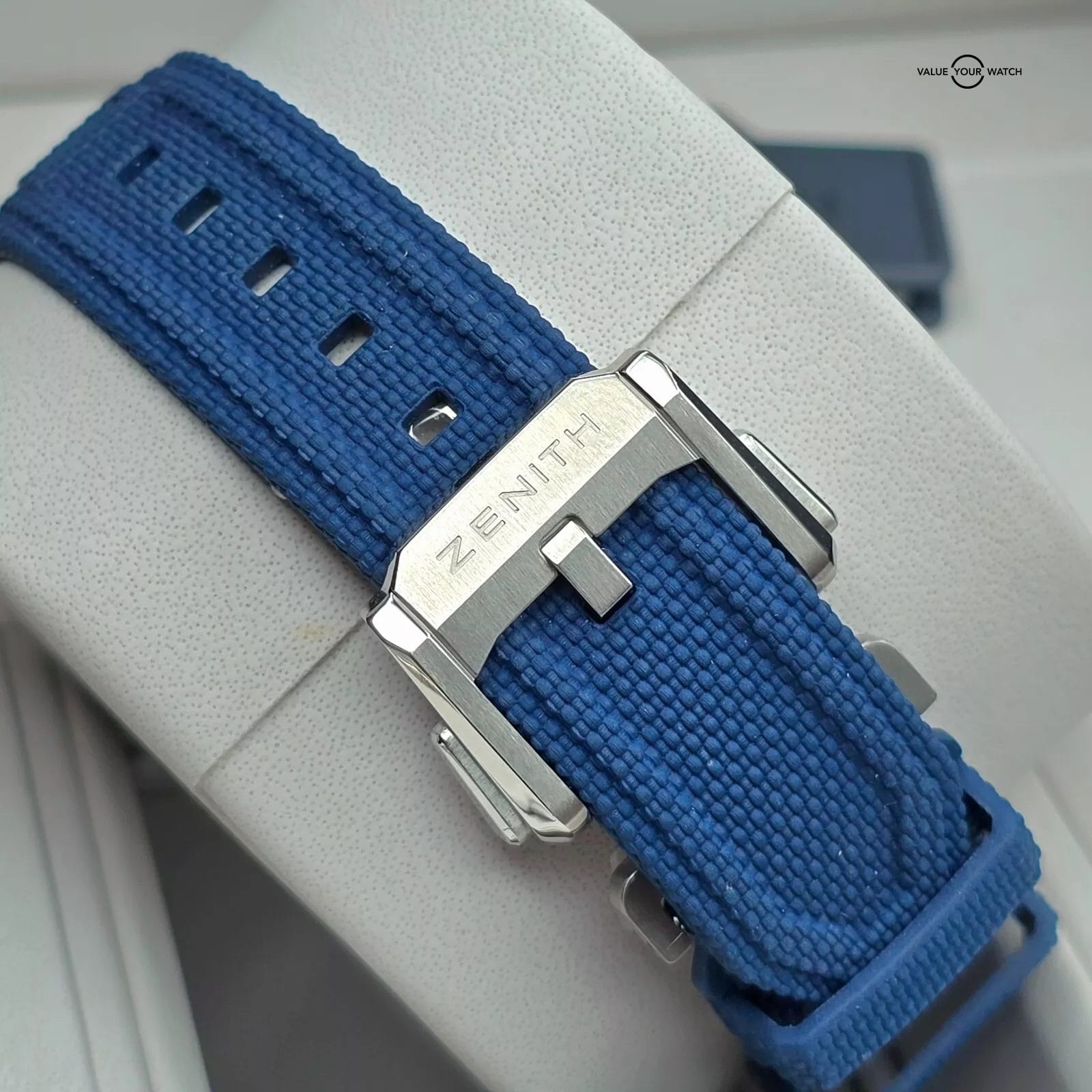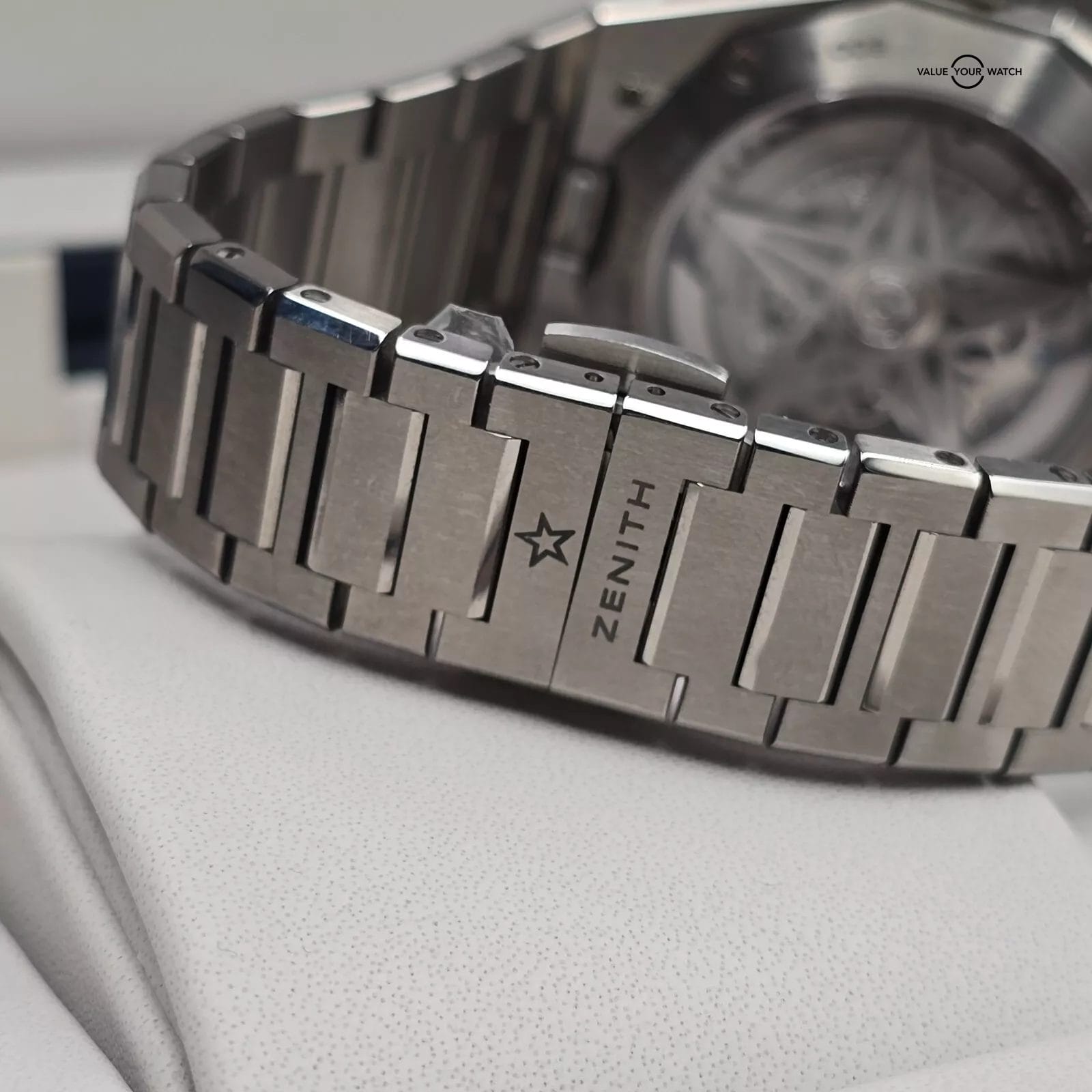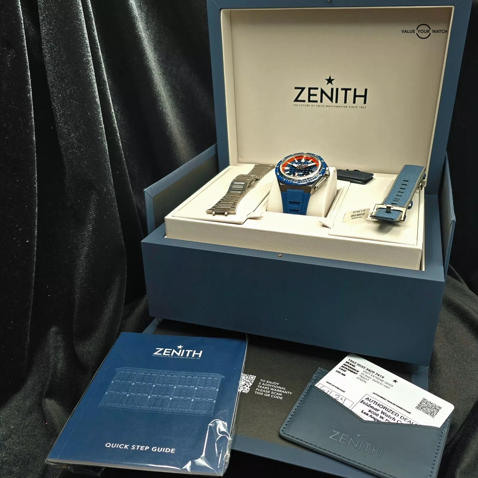 This watch is in Excellent condition, and if I didn’t just wear it around my house I’d say it looks to be unworn! Comes as a full set with the full titanium bracelet, rubber strap with dual fold clasp, and the Zenith Nato strap. This watch uses the quick release interchangeable strap system!