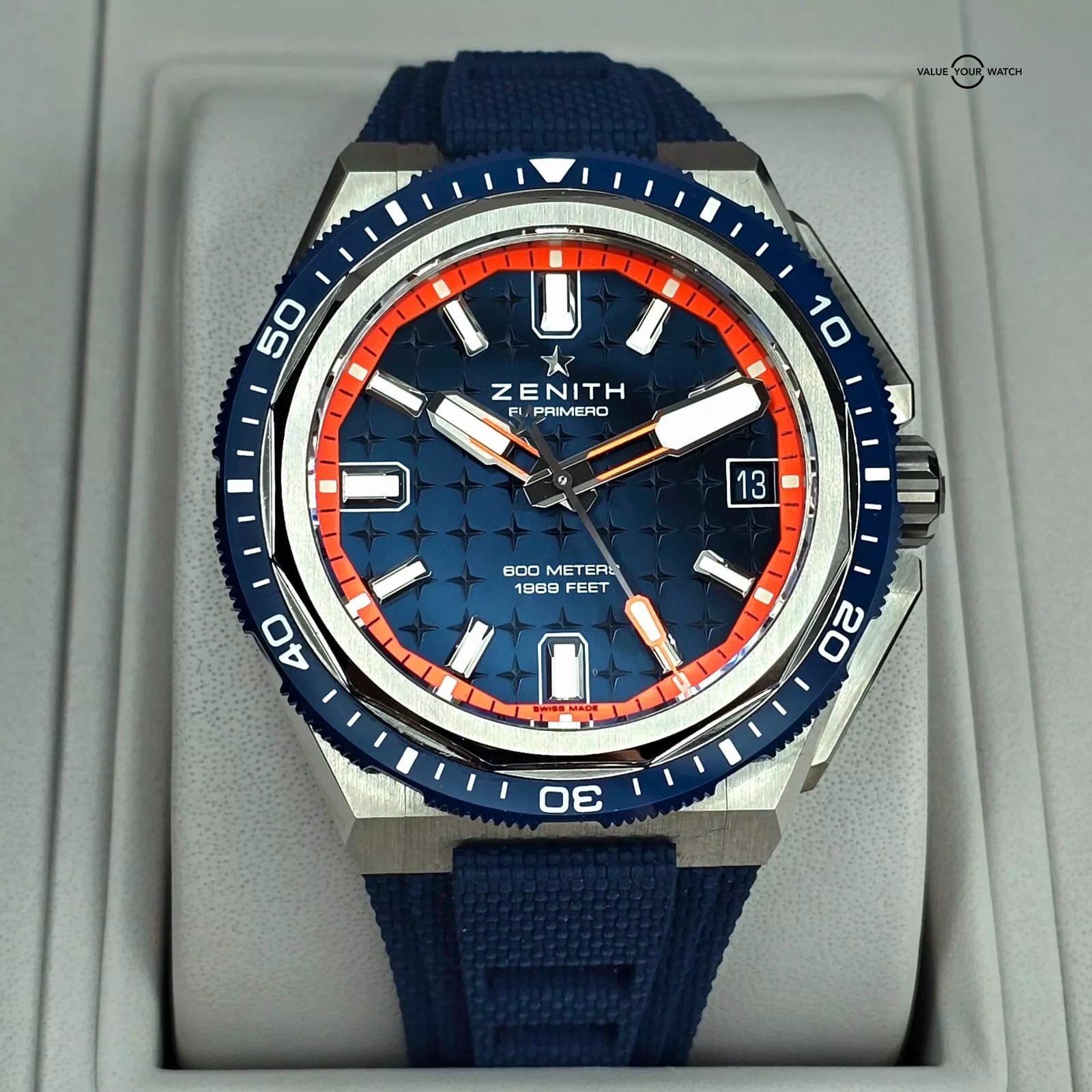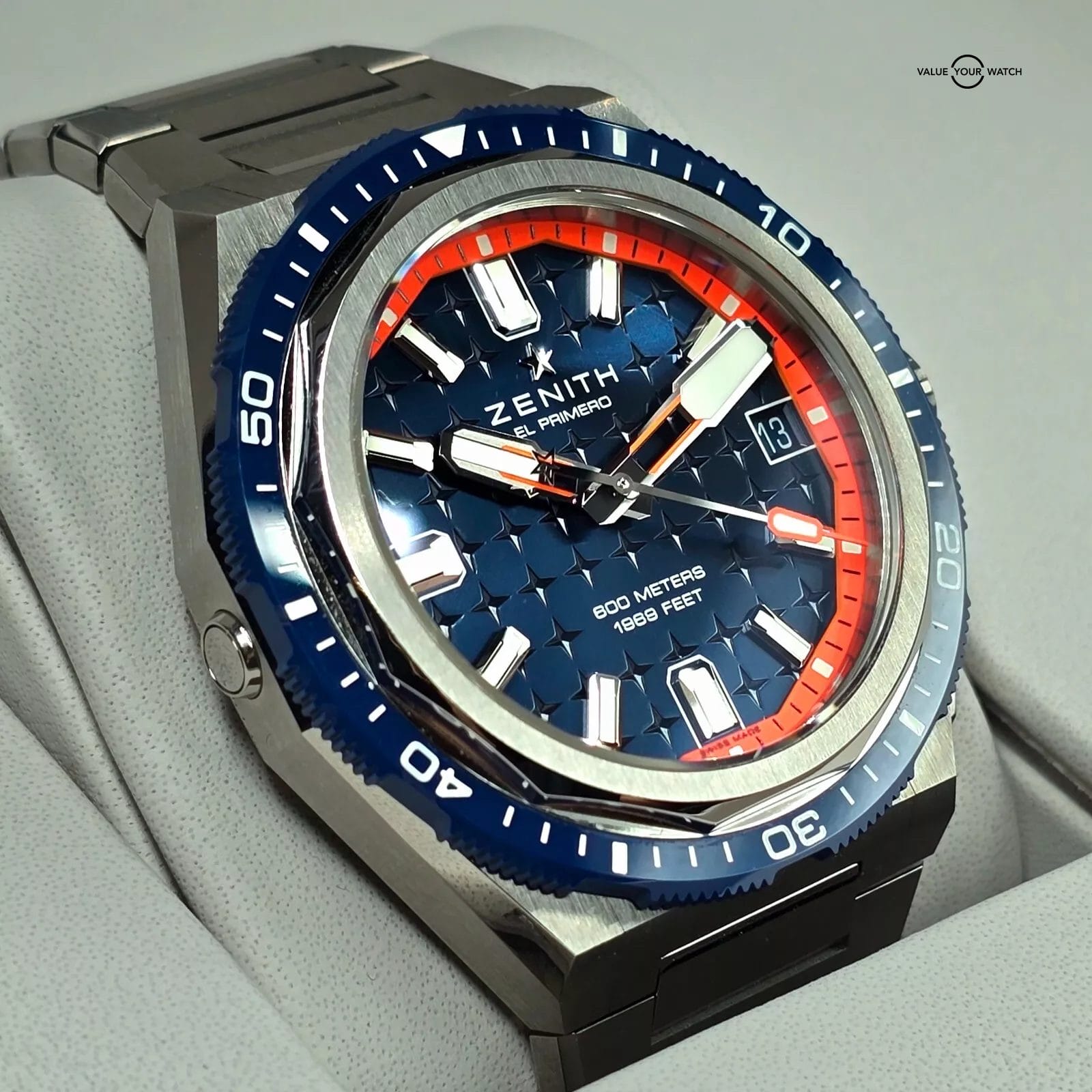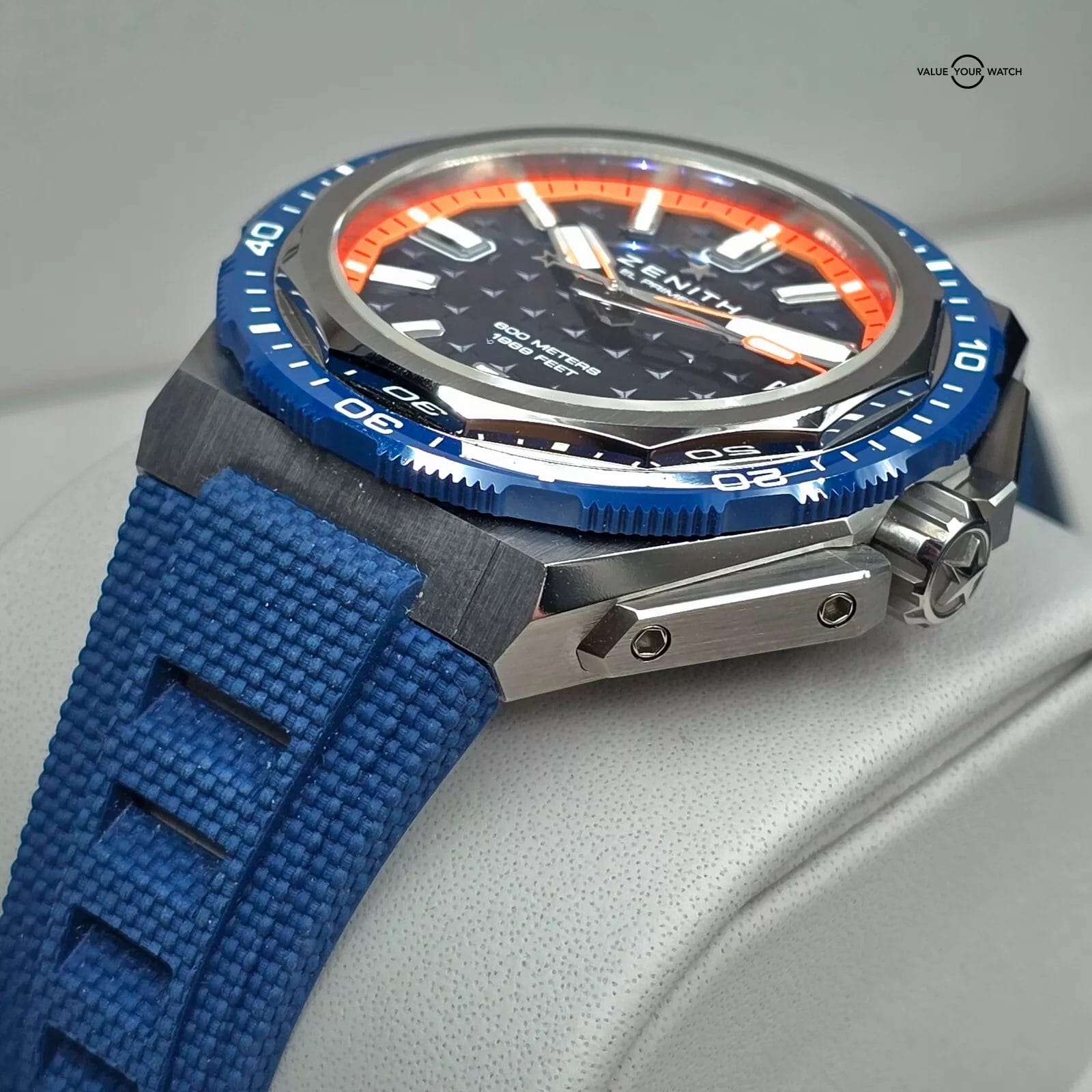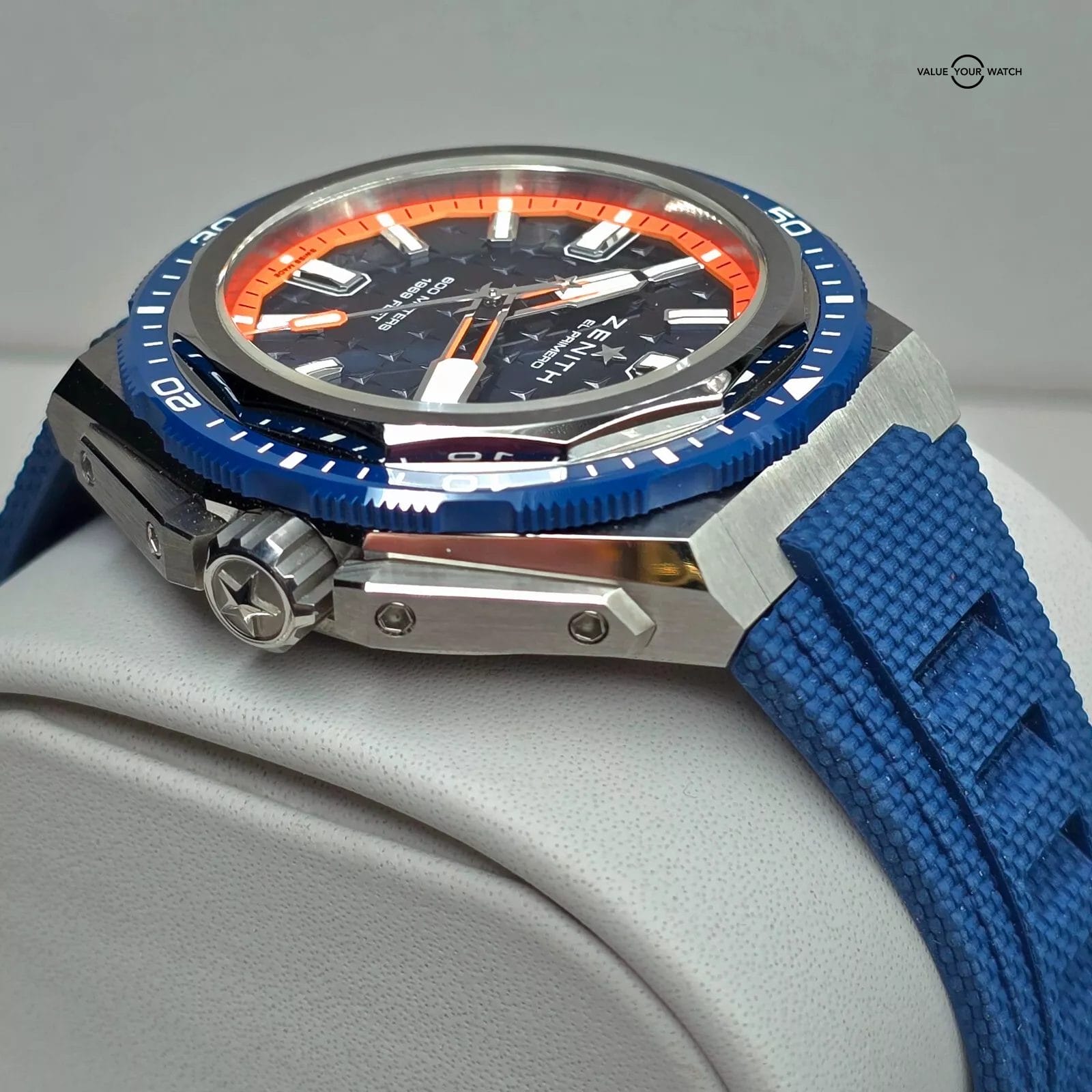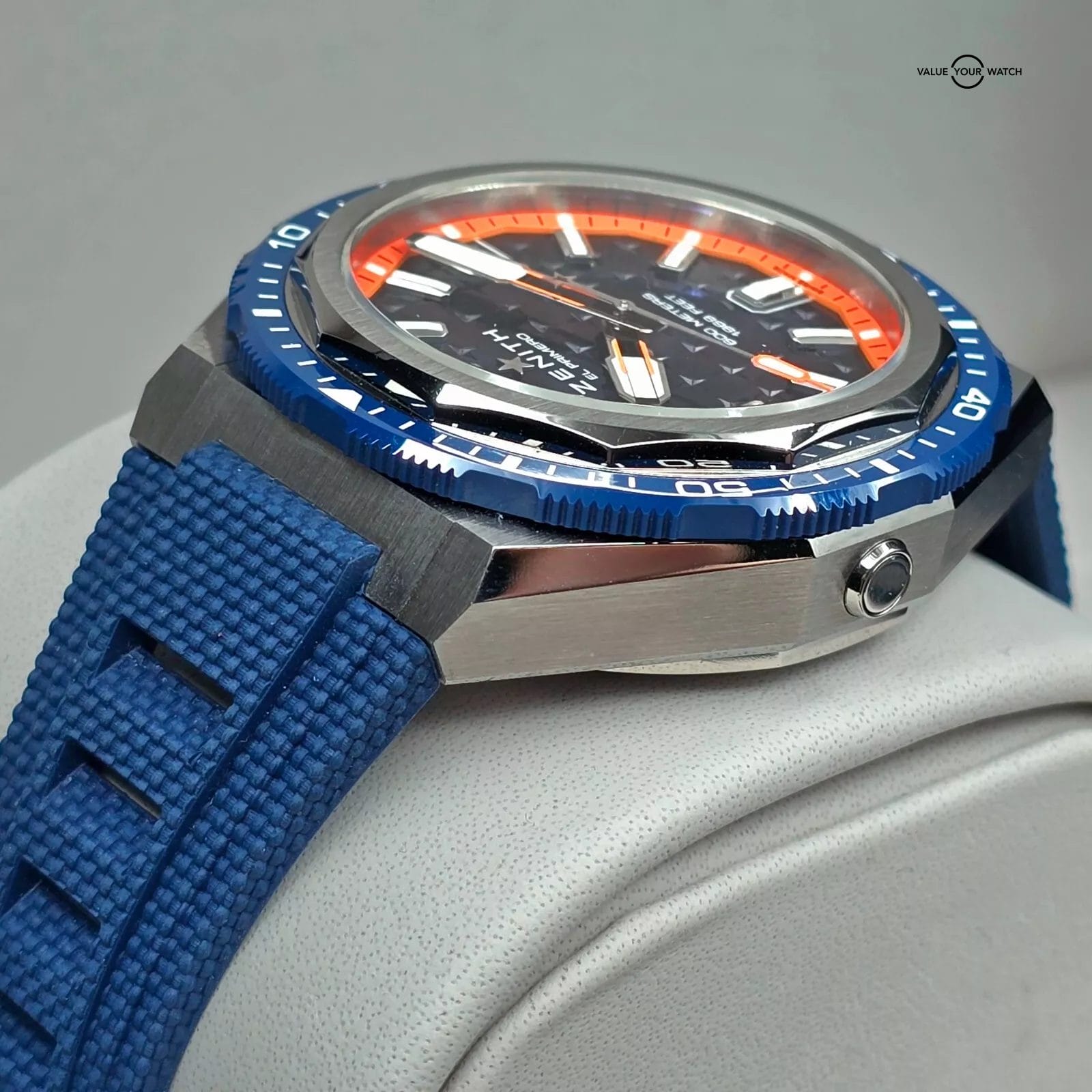 Up for sale here is the latest sea-faring timepiece from Zenith, part of the Defy Extreme collection. The Diver is crafted in the same style as the Extreme El Primero 21, but measures at 42.5mm vs 45mm. Ref 95.9601.3620/51.I301.