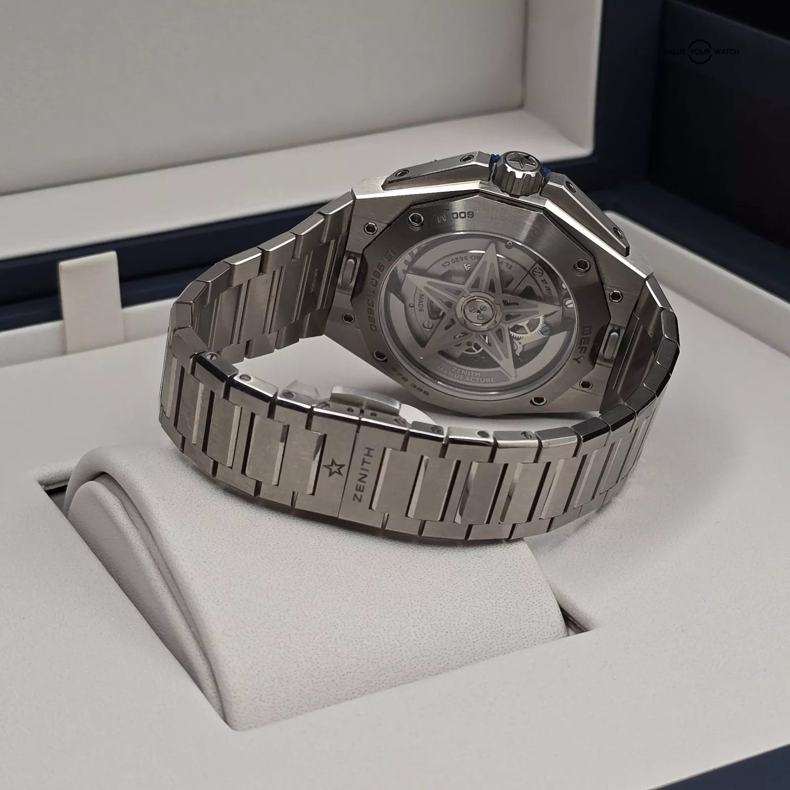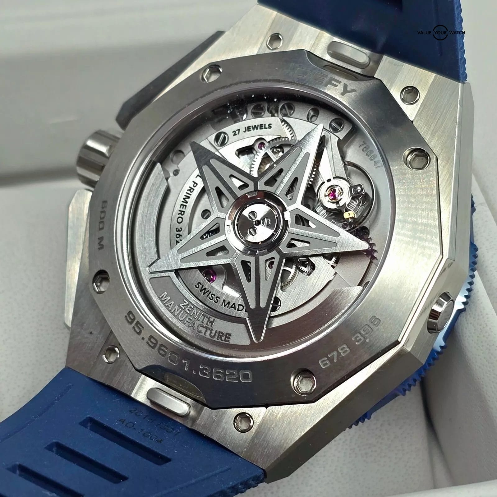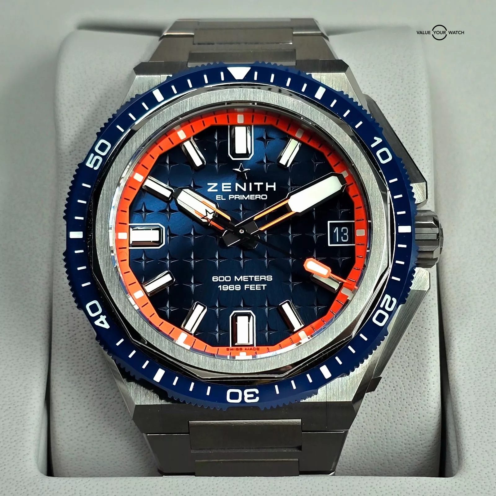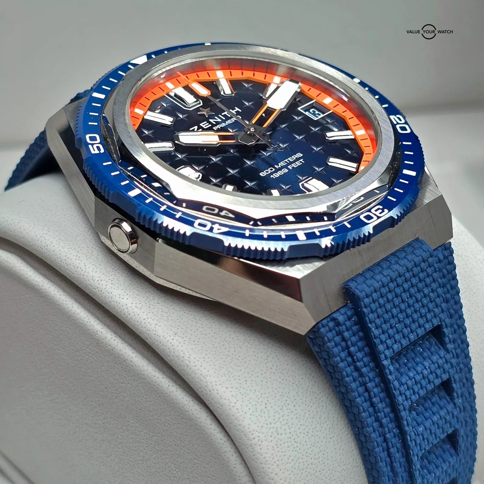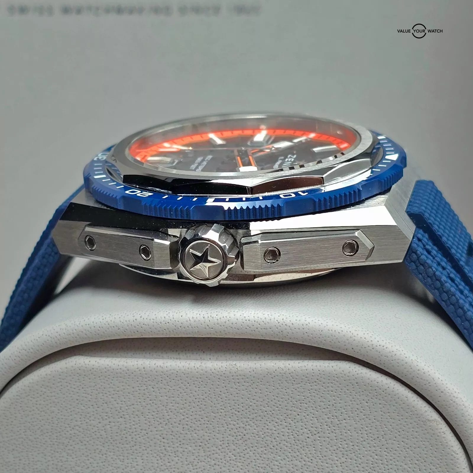 Up for sale here is the latest sea-faring timepiece from Zenith, part of the Defy Extreme collection. The Diver is crafted in the same style as the Extreme El Primero 21, but measures at 42.5mm vs 45mm. Ref 95.9601.3620/51.I301.