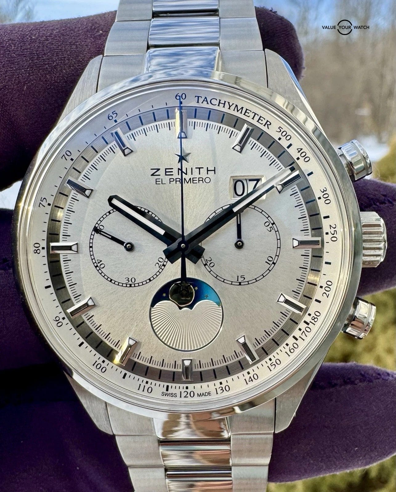 This model combines Zenith’s legendary high-beat El Primero automatic chronograph (Caliber 4047) with elegant complications, including a large double-window Grande Date at 2 o’clock and a beautifully executed moonphase display at 6. The dial is crisp and balanced, with applied markers, tachymeter scale, and classic tri-register chronograph layout that gives it both sport and sophistication.