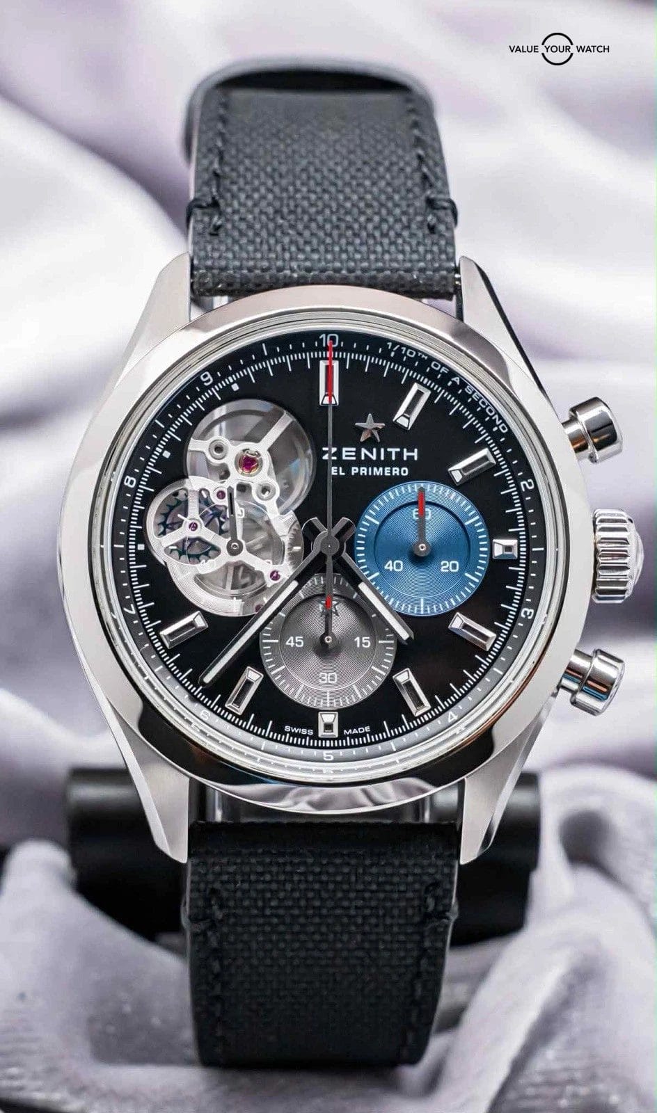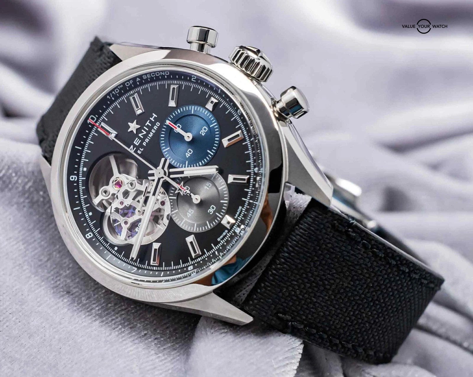 “The CHRONOMASTER Open offers a view of the beating heart of the El Primero movement from the dial. Crafted in a sleek 39.5mm steel case, this version features a matte silver dial with tricolour counters and a transparent counter for the running seconds, paired with a blue cordura-effect rubber strap. Powered by the El Primero 3604 1/10th of a second automatic chronograph movement.”