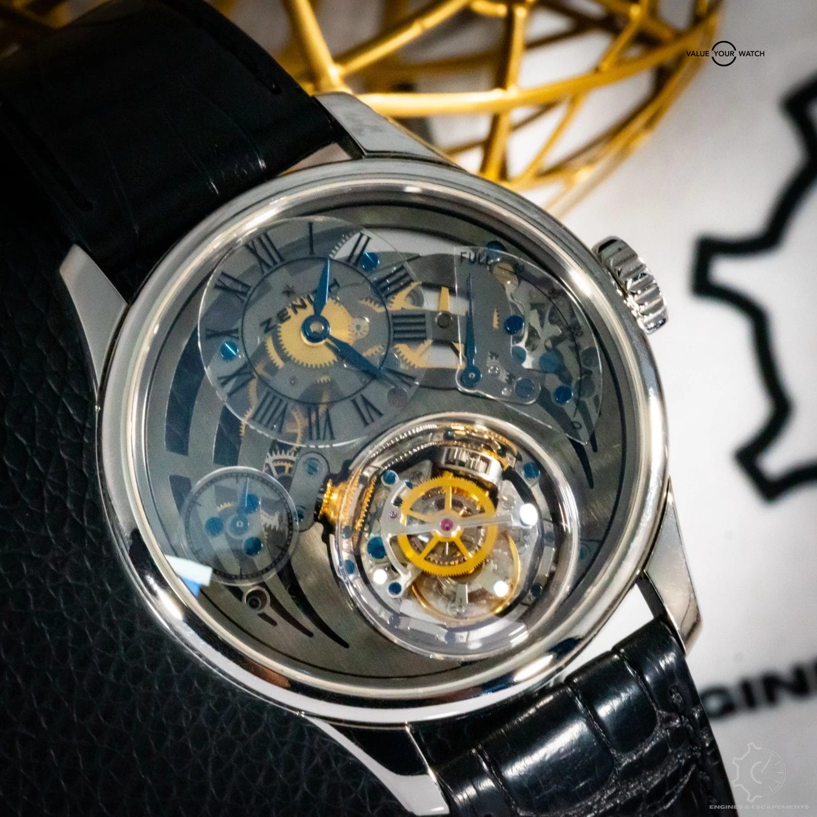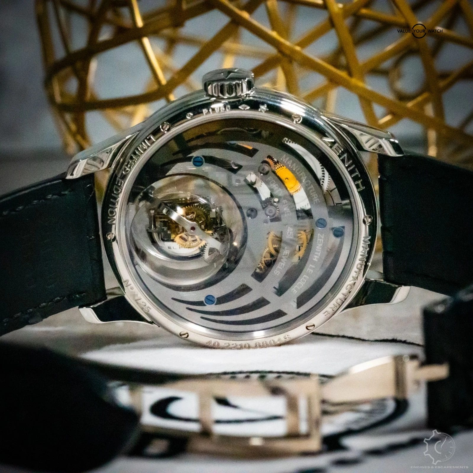 Every detail is crafted to perfection. The off-centered time display, finely decorated sub-dials, and the intricate movement architecture are all on full display, showcasing Zenith’s watchmaking at its most daring. The platinum case adds weight, presence, and rarity, while the black alligator strap keeps the aesthetic grounded and refined.