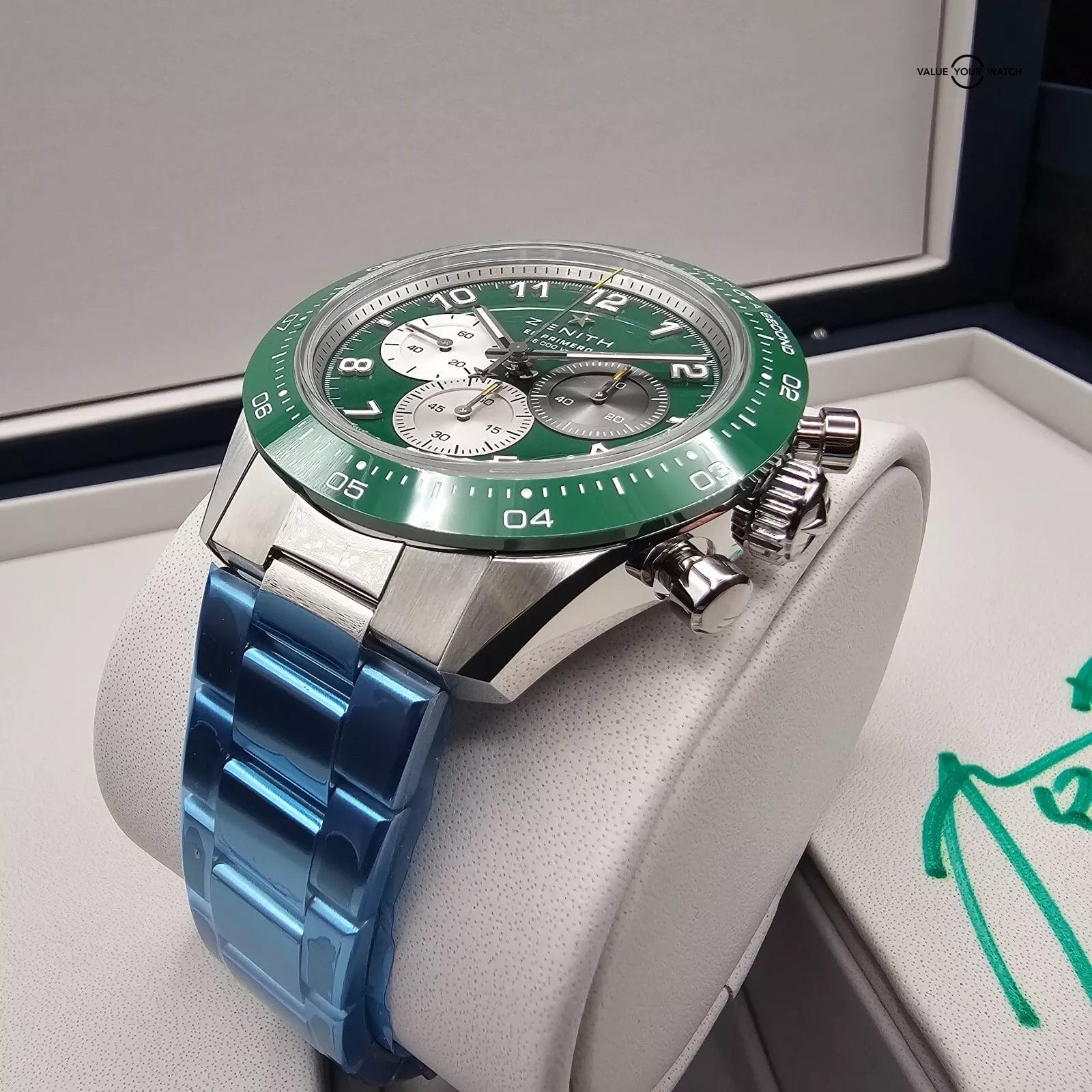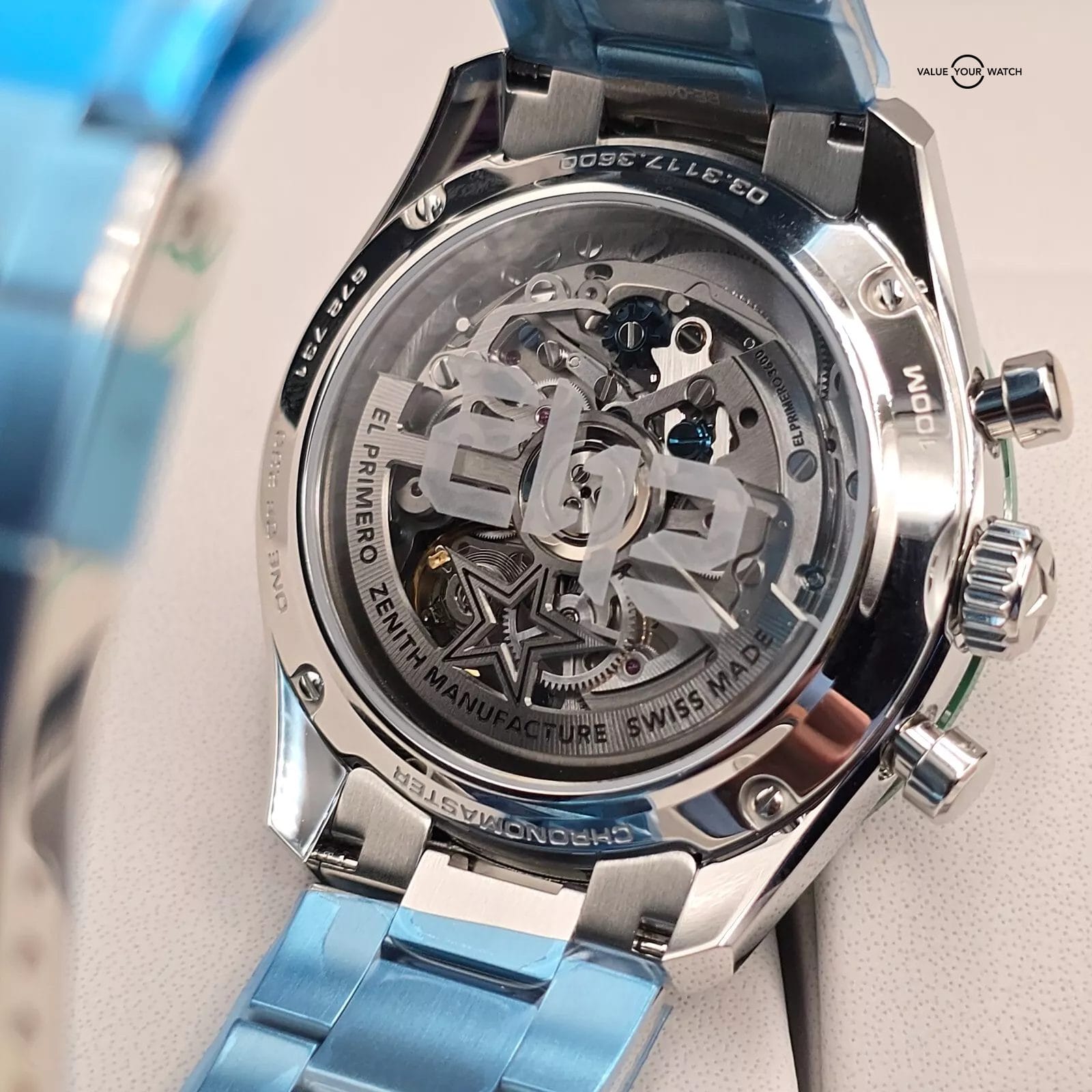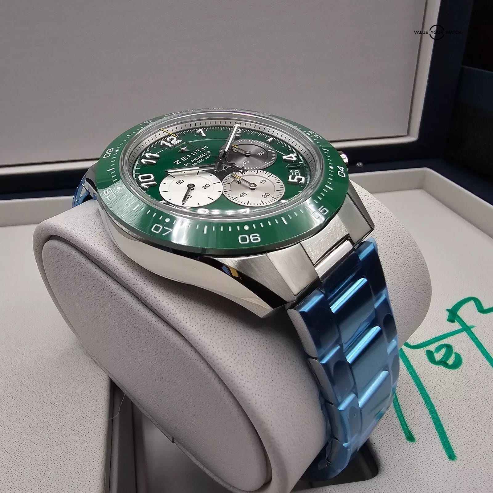 This timepiece is in brand new unworn condition, and comes as a full set as delivered from the Zenith online boutique.