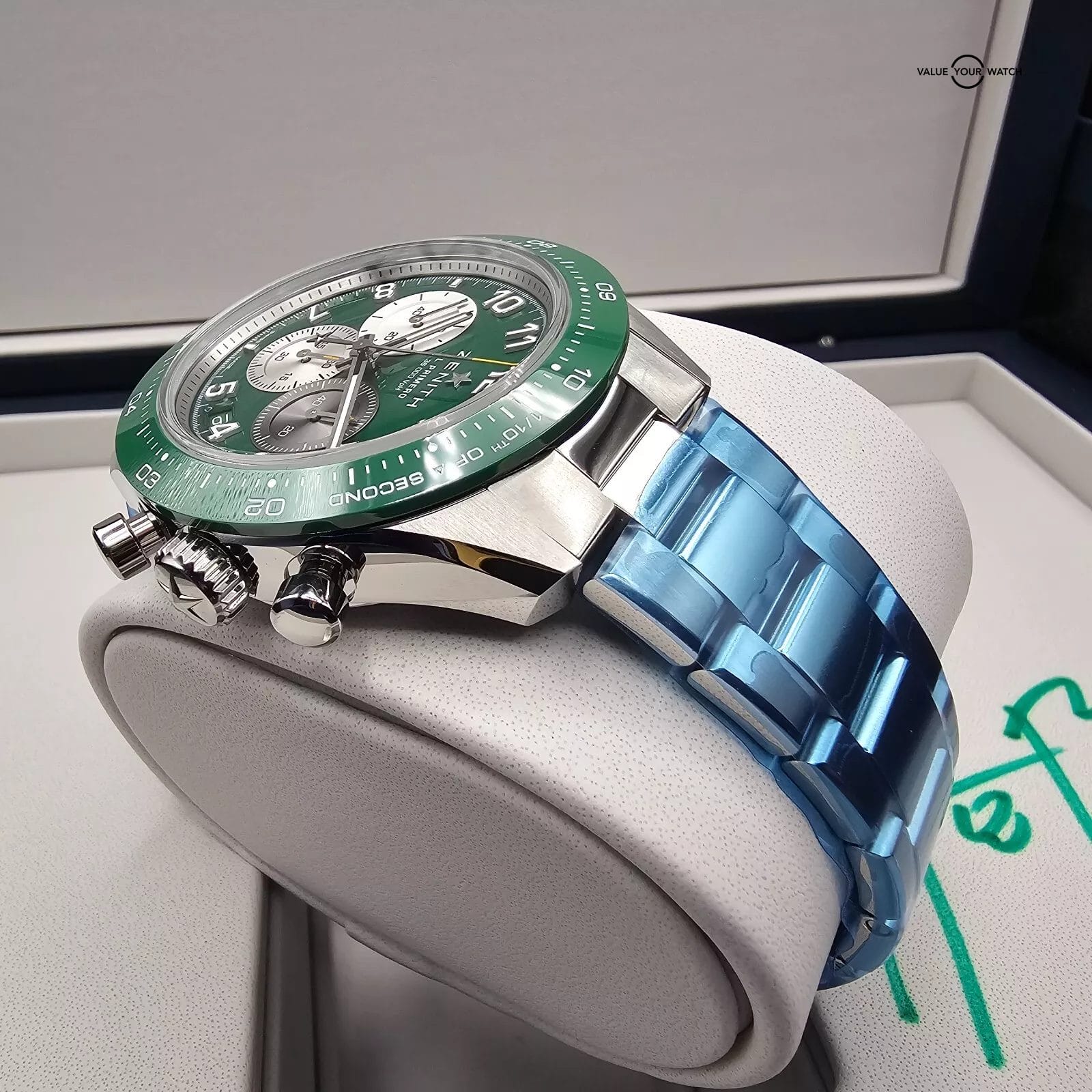 For sale here is a limited edition Zenith Chronomaster Sport, with the green dial and ceramic bezel. This timepiece is the Aaron Rodgers special edition, with his initials on the caseback, signature in the box, and a signed poster.