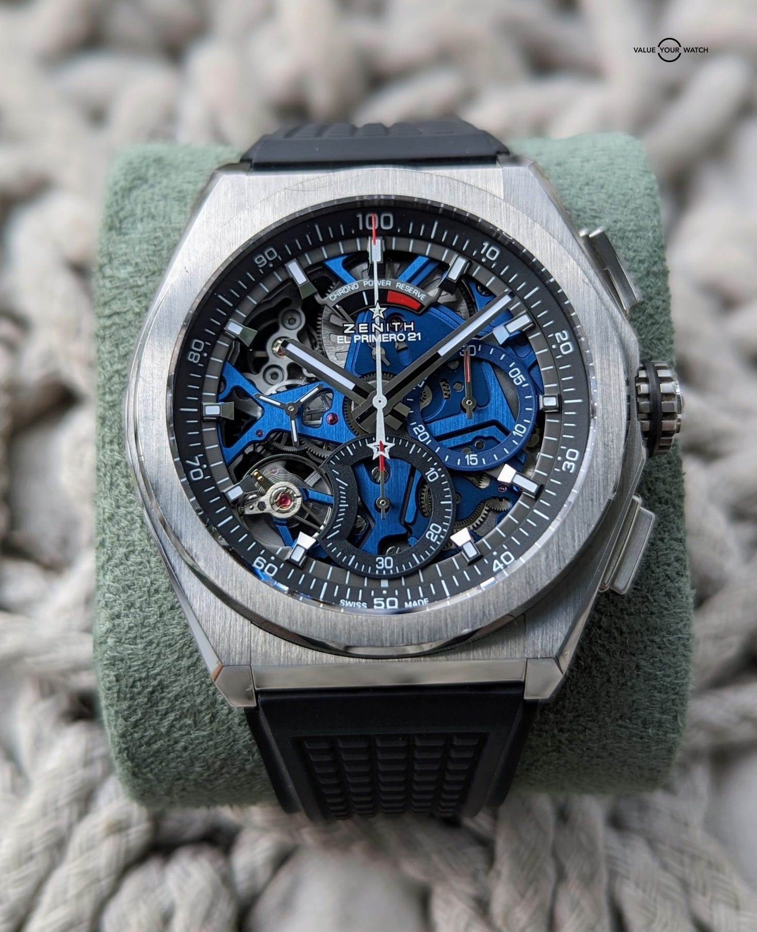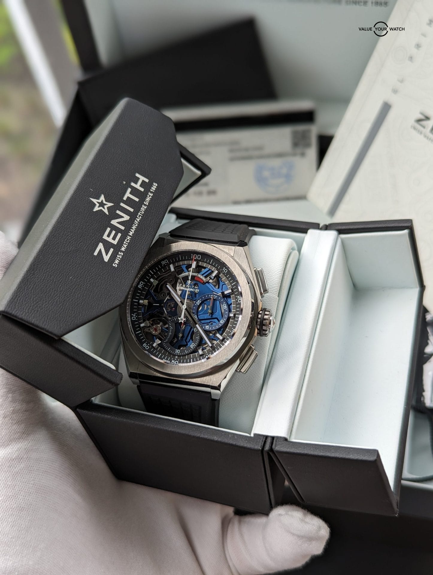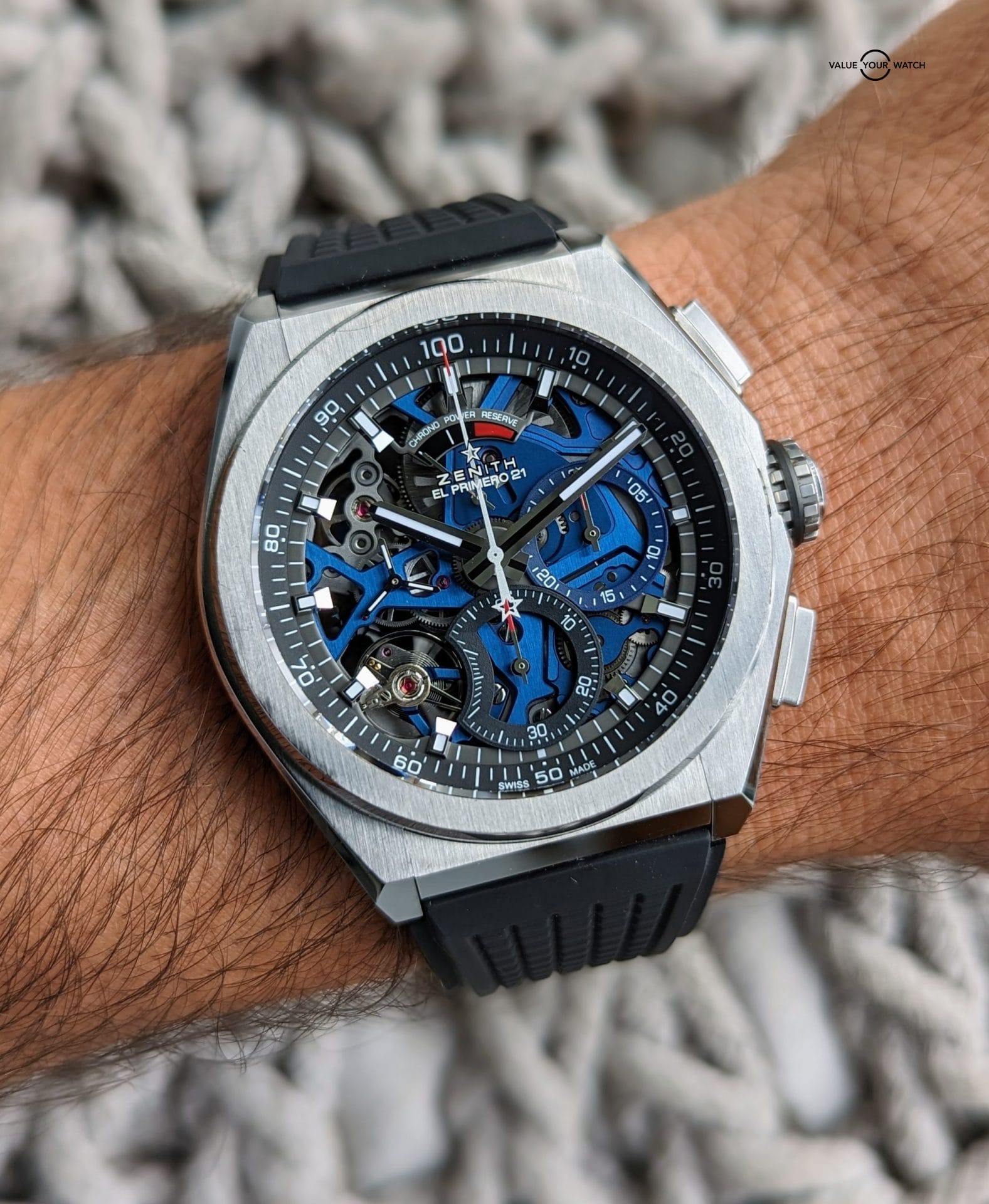 Originally sold in 2019, this watch is in stellar shape. Was just given a full overhaul service last month by Bennisson in West Palm Beach, FL along with a light touch up polish to the case. All functions and timekeeping are on point. This watch originally came on the titanium bracelet, but has since been swapped out for the Zenith black rubber strap with titanium Zenith deployant clasp, both of which are brand new. This makes this a unique piece because the blue skeleton dial usually comes with a blue rubber or leather strap, and IMO makes it a bit harder to pull off than the black strap.