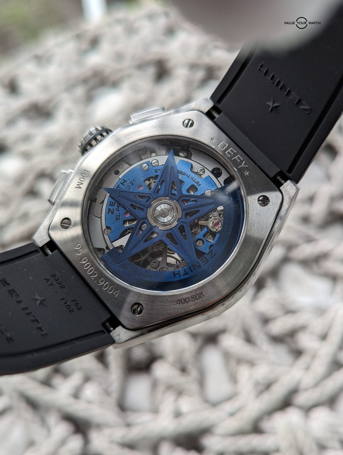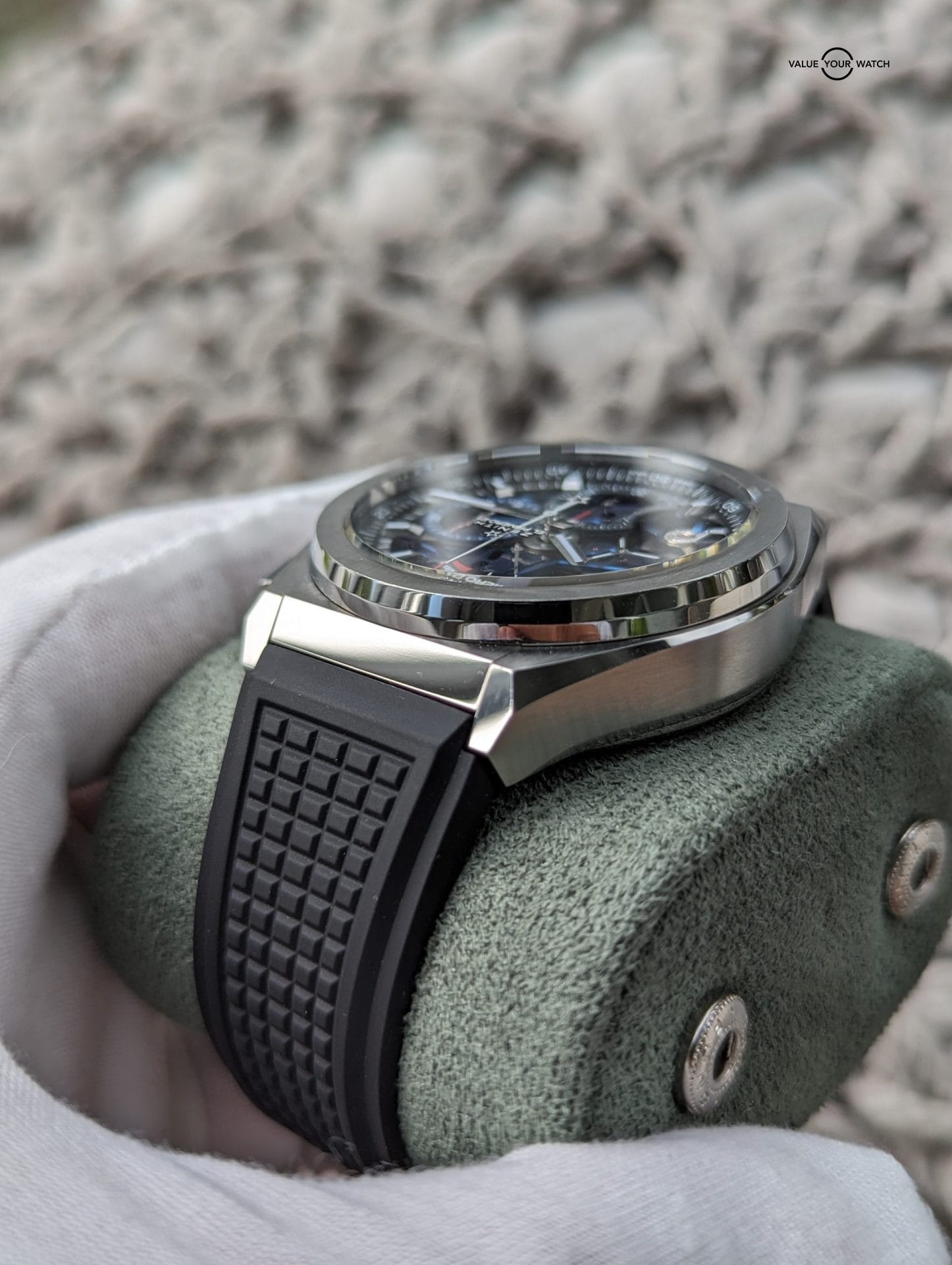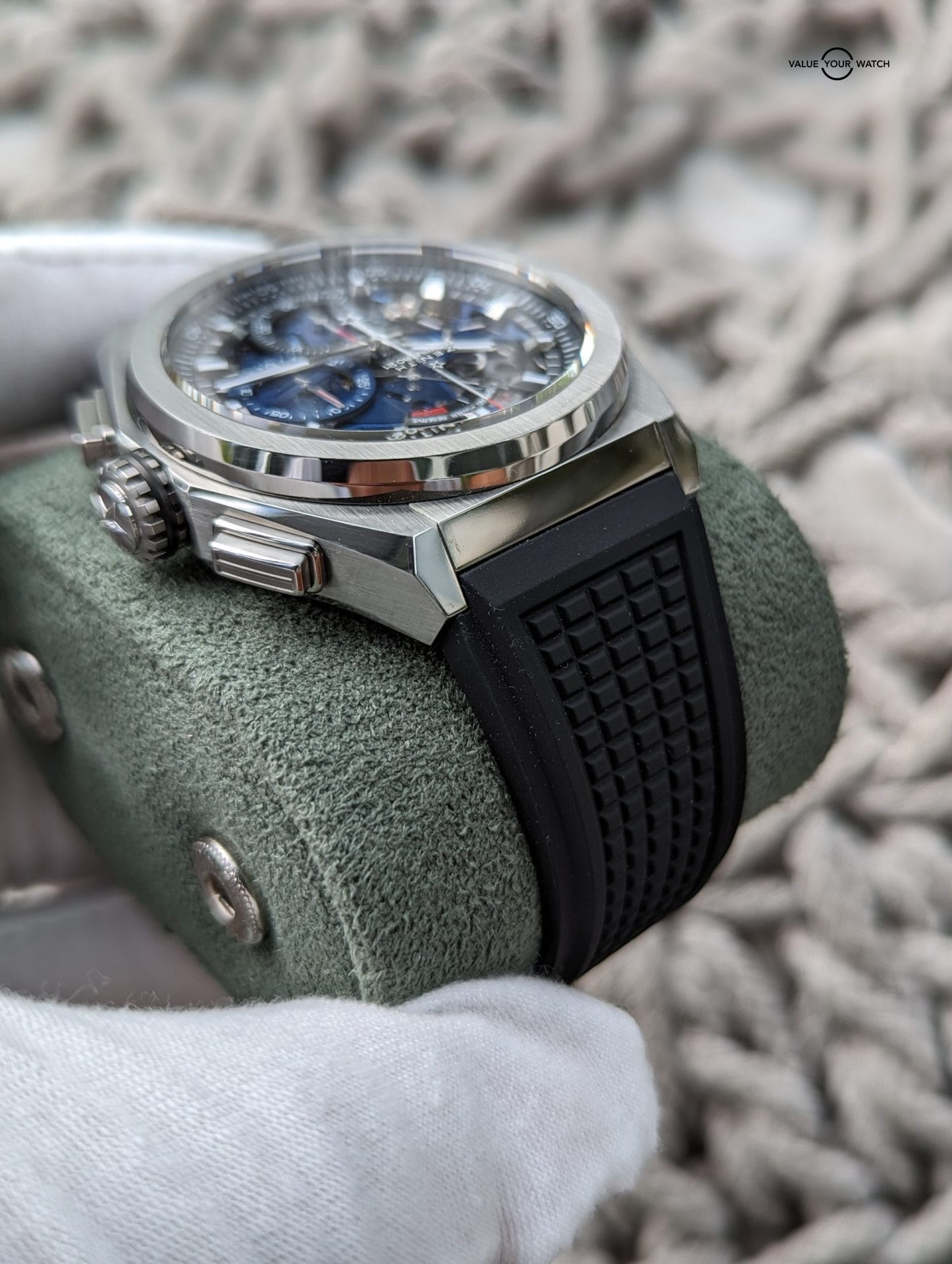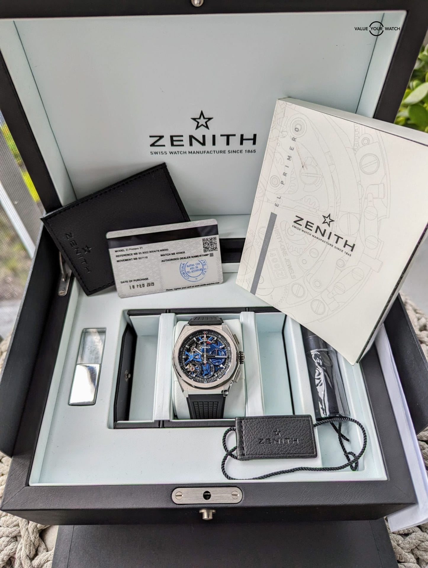 Originally sold in 2019, this watch is in stellar shape. Was just given a full overhaul service last month by Bennisson in West Palm Beach, FL along with a light touch up polish to the case. All functions and timekeeping are on point. This watch originally came on the titanium bracelet, but has since been swapped out for the Zenith black rubber strap with titanium Zenith deployant clasp, both of which are brand new. This makes this a unique piece because the blue skeleton dial usually comes with a blue rubber or leather strap, and IMO makes it a bit harder to pull off than the black strap.