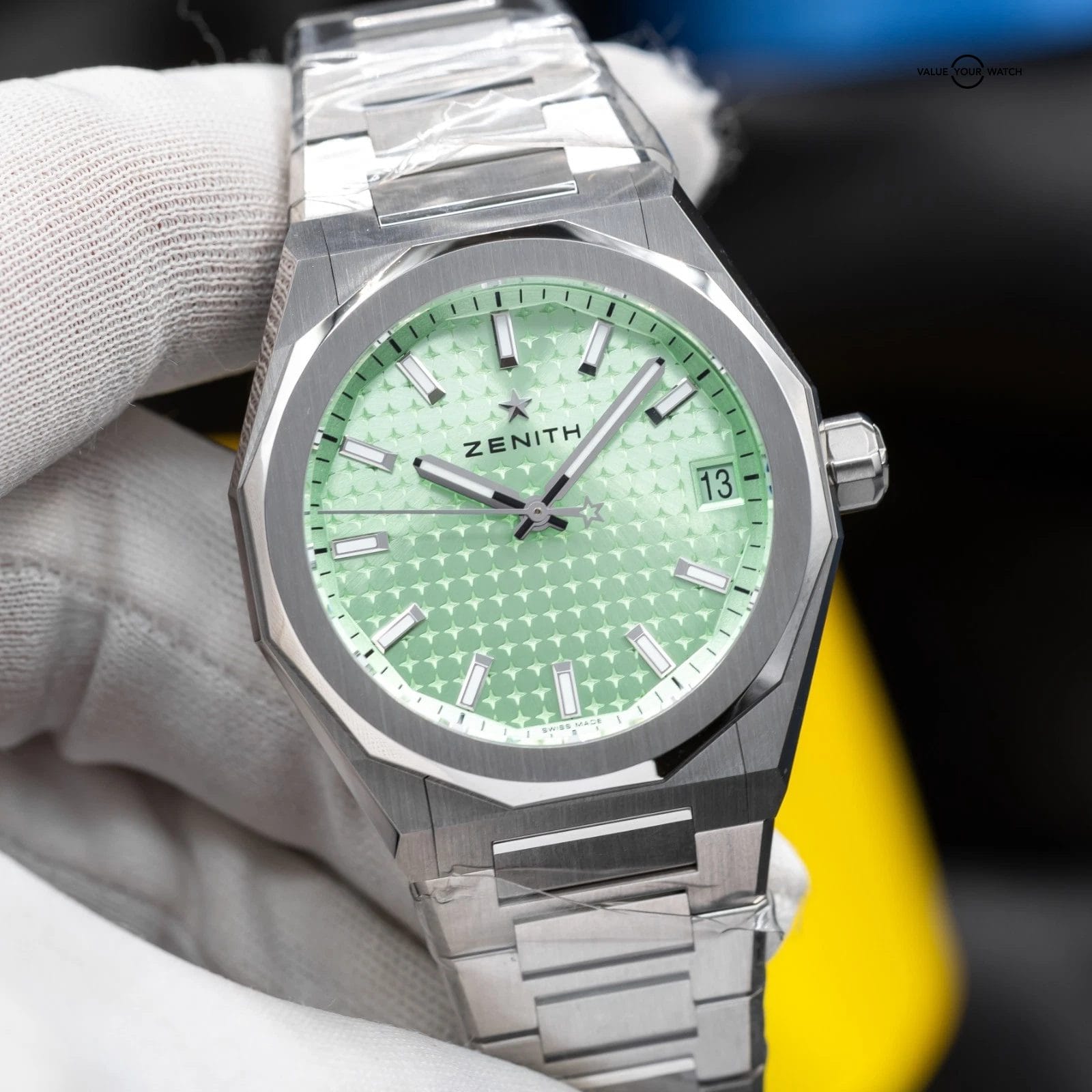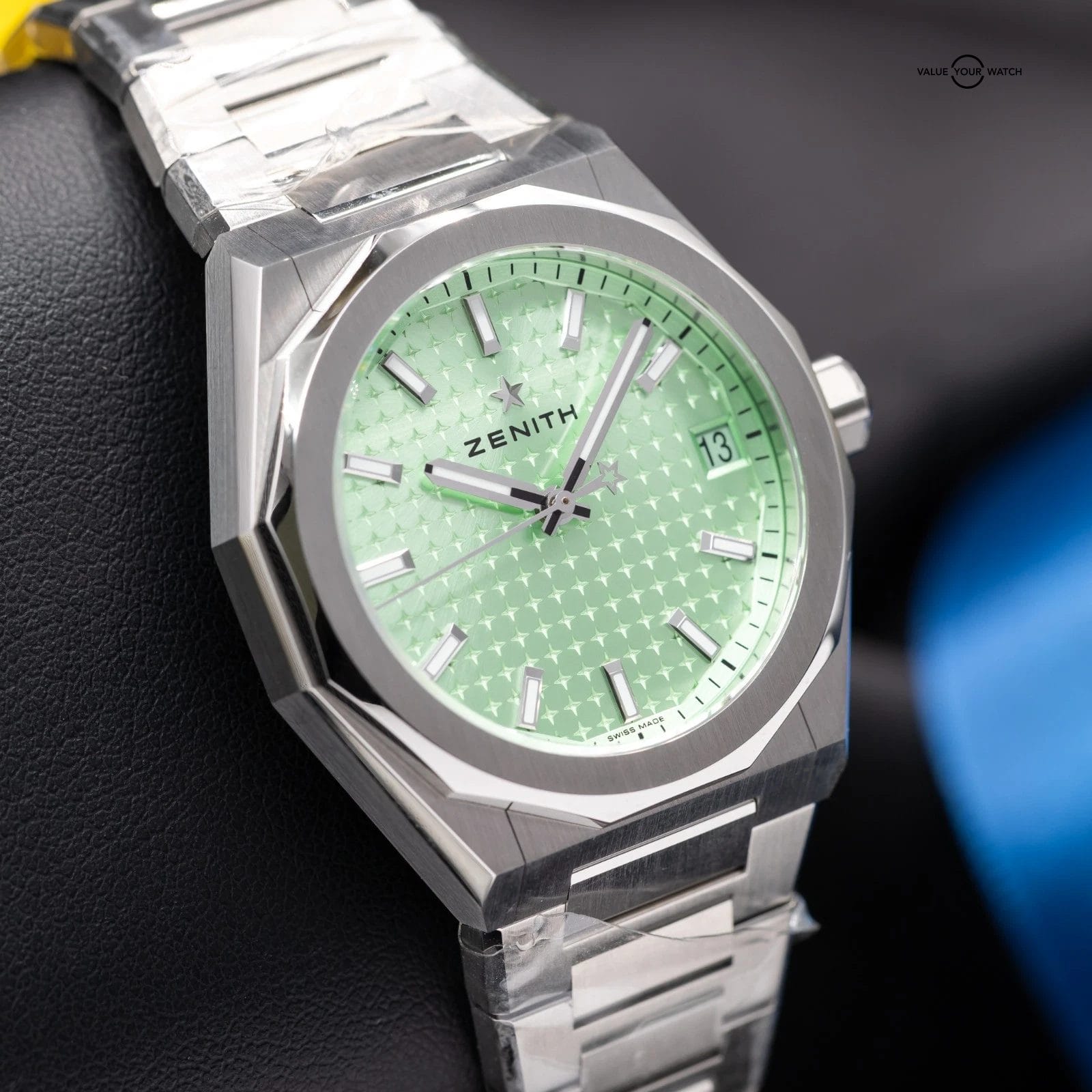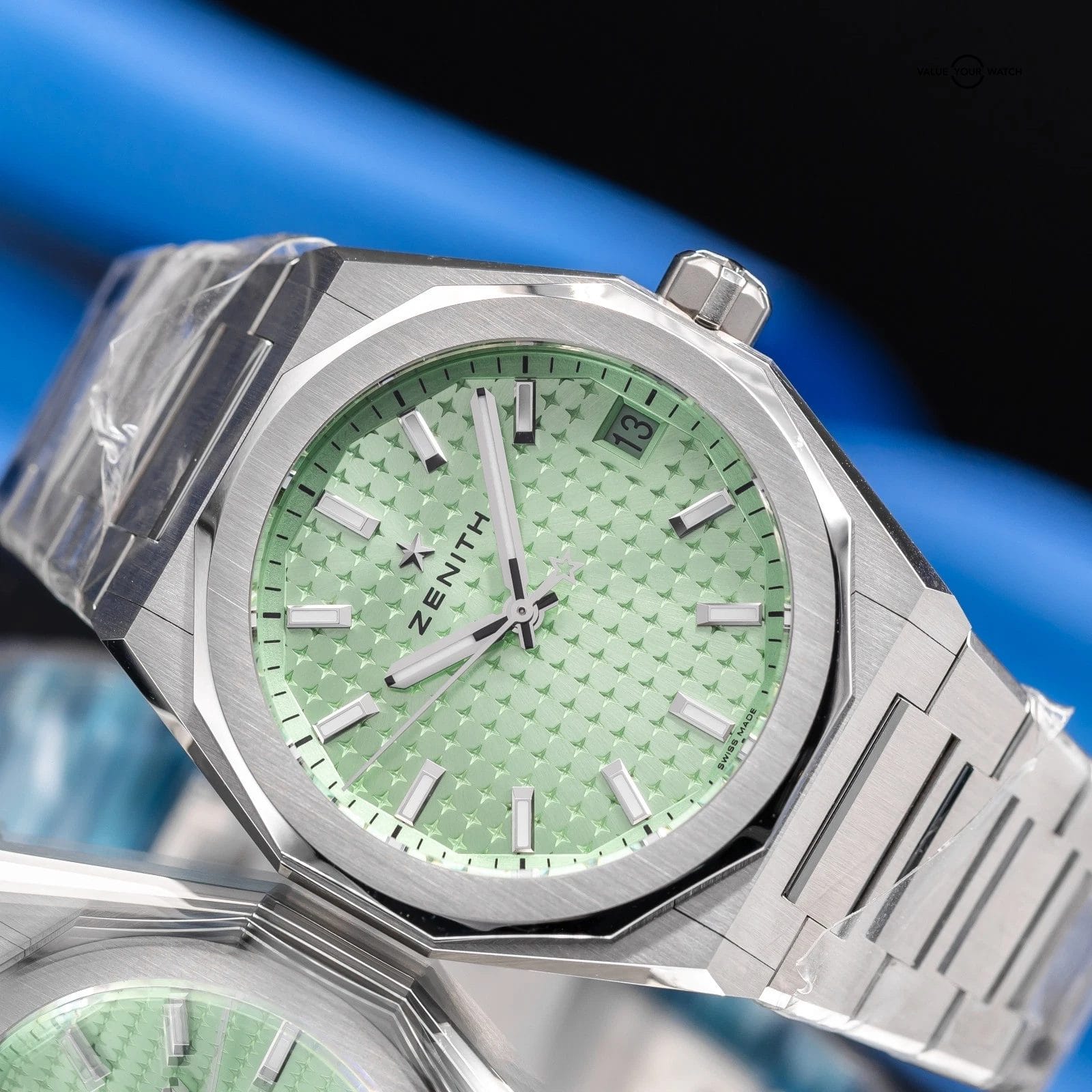 Bold, contemporary, and unmistakably distinctive, the Zenith Defy Skyline 03.9400.670/61.I001 brings fresh energy to one of Zenith’s most recognizable collections. The sunburst pastel green dial is unlike anything else in the segment—radiant, metallic, and alive in changing light. Housed in a sharp 36mm stainless steel octagonal case with a faceted bezel, the Skyline delivers crisp geometry and refined proportions that create wrist presence like no other. Whether paired with its integrated steel bracelet or the matching pastel green rubber strap, this reference offers versatility wrapped in unmistakable Zenith DNA.