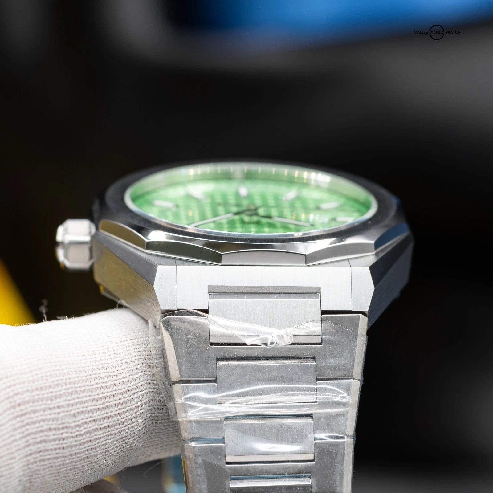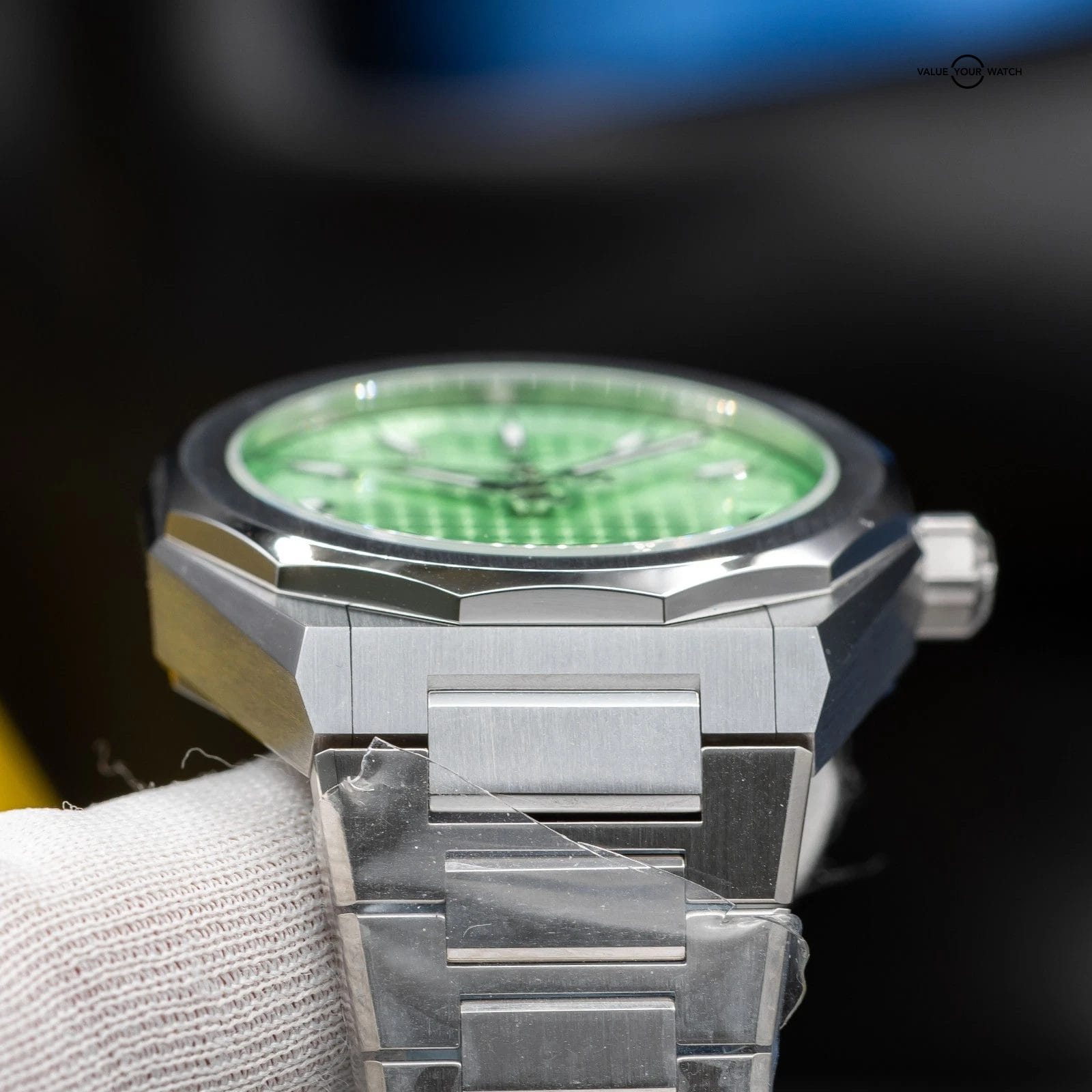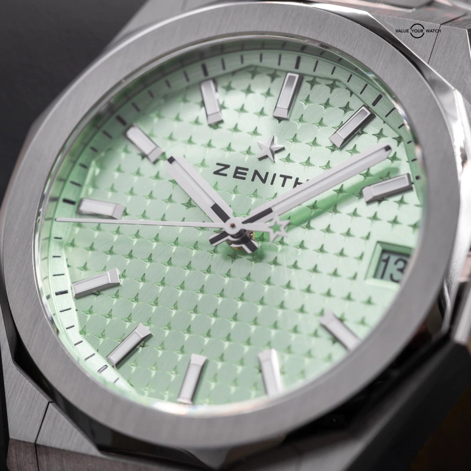 • Dial: Light pastel green sunburst dial with engraved four-pointed star motif, applied hour markers and hands with luminescent coating