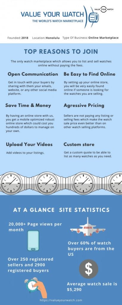 Value Your Watch Marketplace is a compelling platform, with hundreds of daily users. We are becoming the place where more people want to list their watches for selling, and also attracting genuine buyers, that want to shop for the best deals.